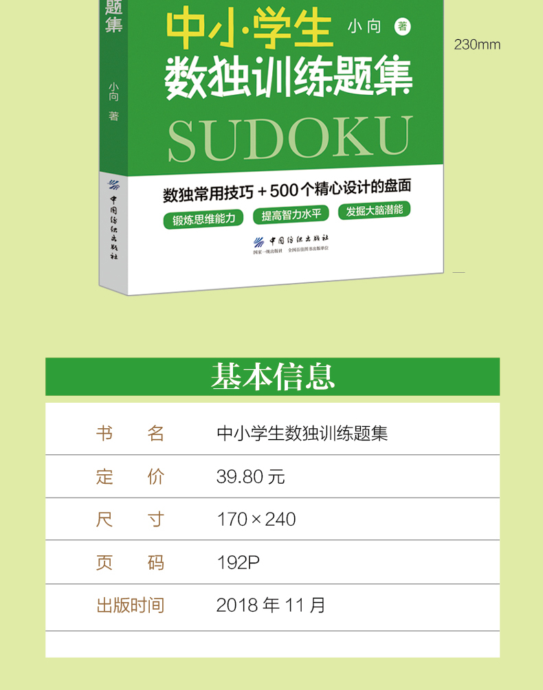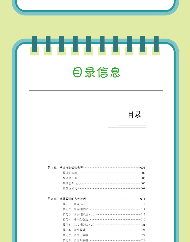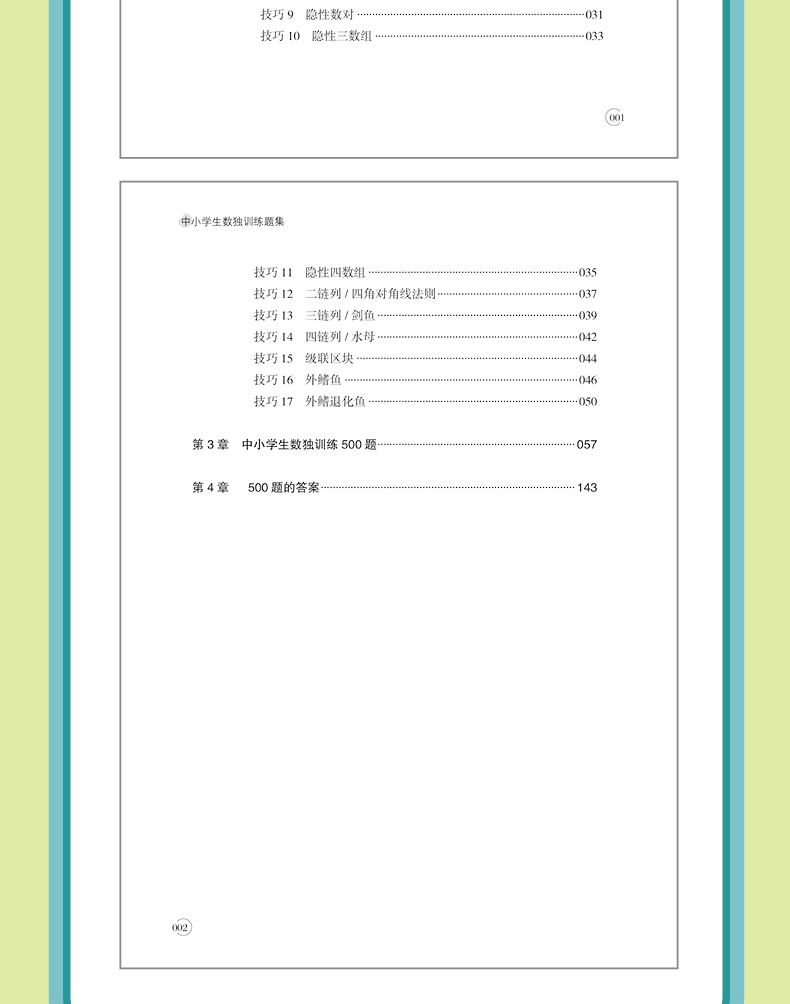第1 章 欢迎来到数独世界数独的起源002数独怎么玩儿006第2 章 玩转数独的各种技巧技巧2 宫内排除法014技巧4 余数法019技巧6 显性数对024技巧8 显性四数组029技巧10 隐性三数组033技巧12 二链列/ 四角对角线法则037技巧14 四链列/ 水母042技巧16 外鳍鱼046第3 章 中小学生数独训练500 题057第4 章 500 题的答案143