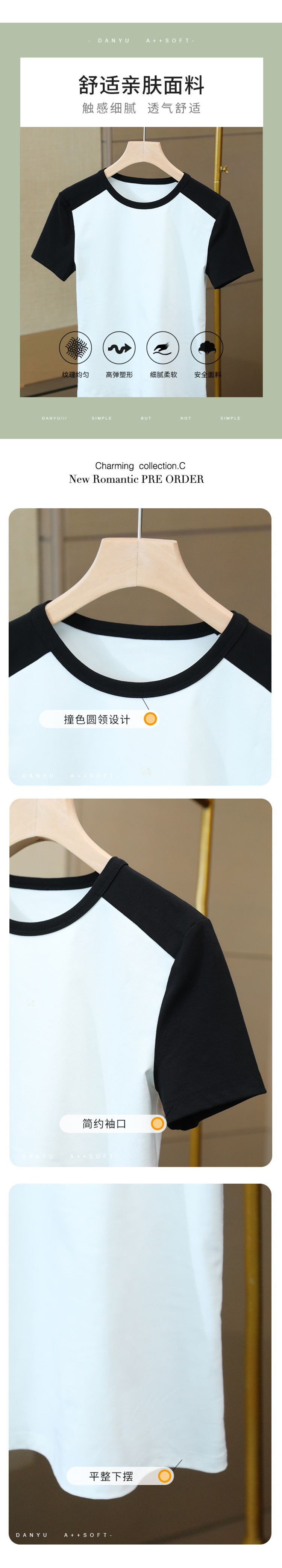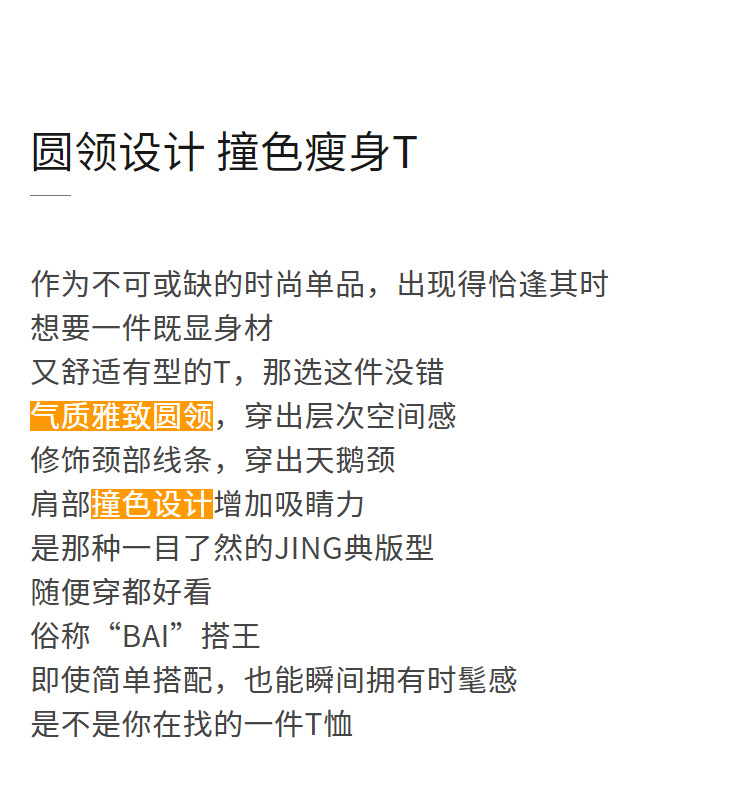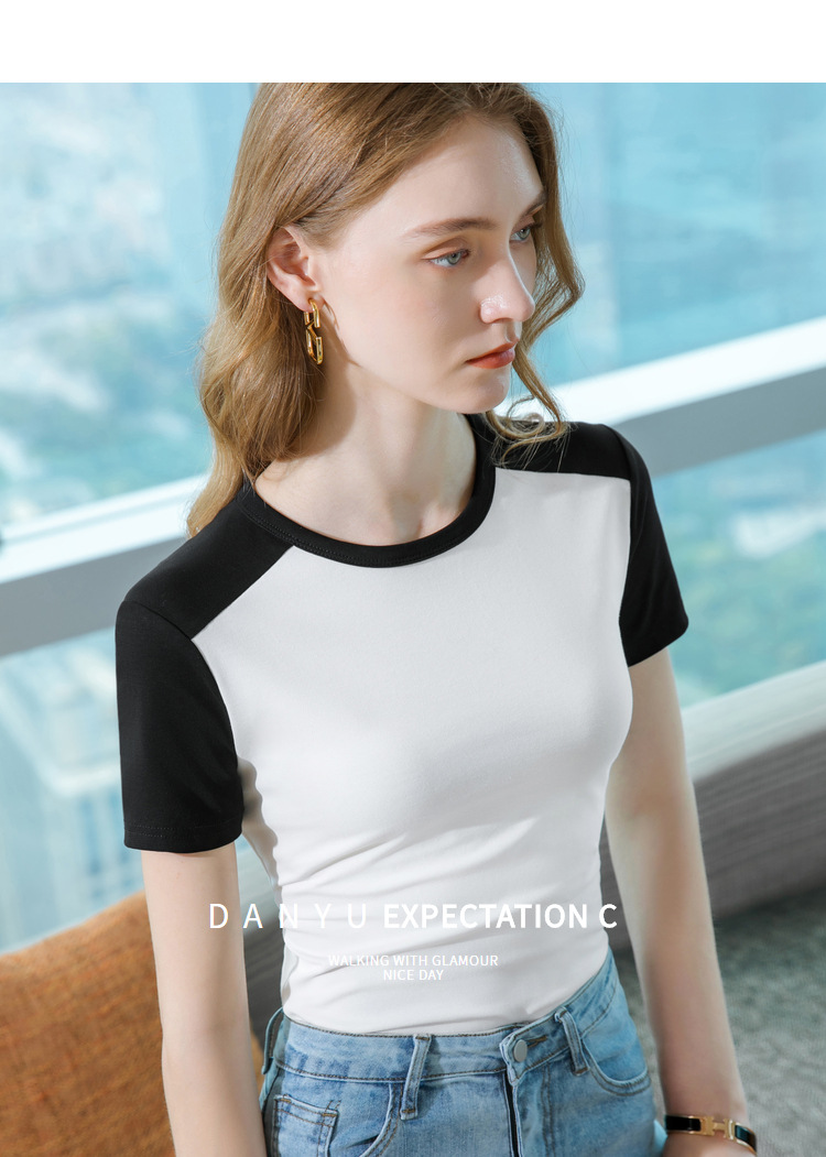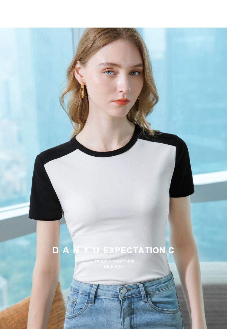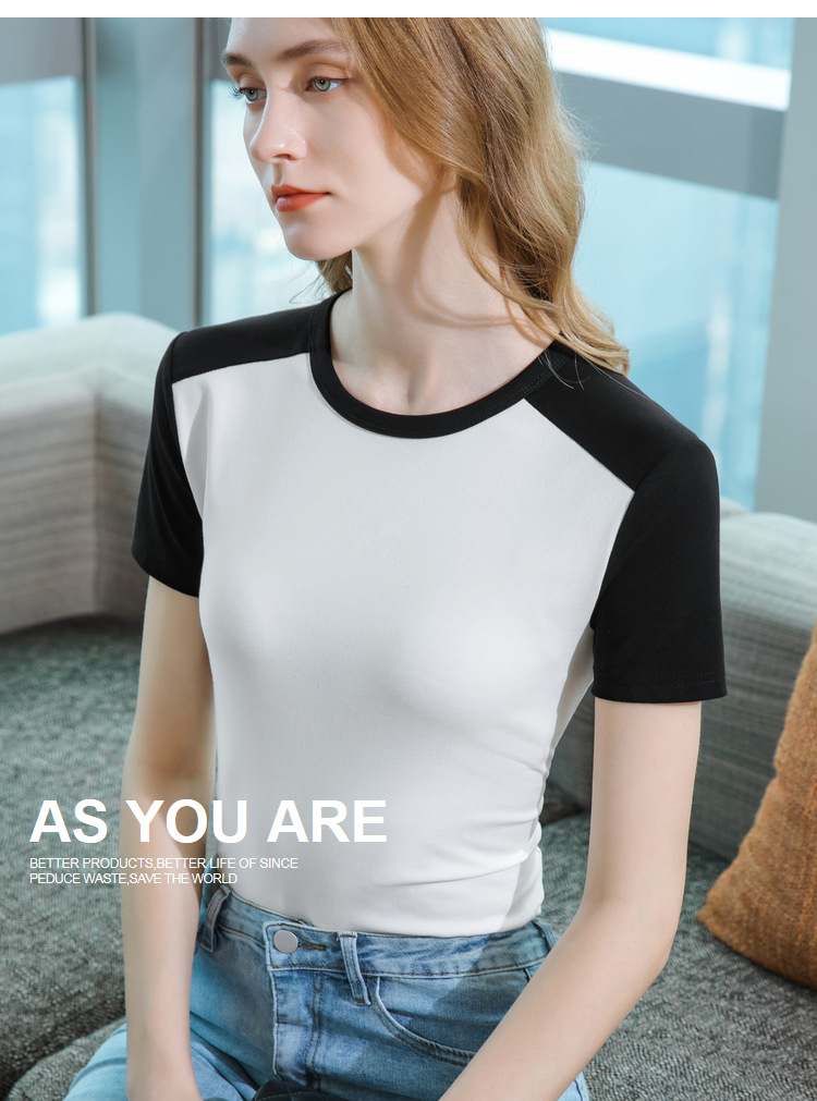 气质短袖t恤,撞色拼接圆领正肩棉体恤收腰上衣SG-T2X2483