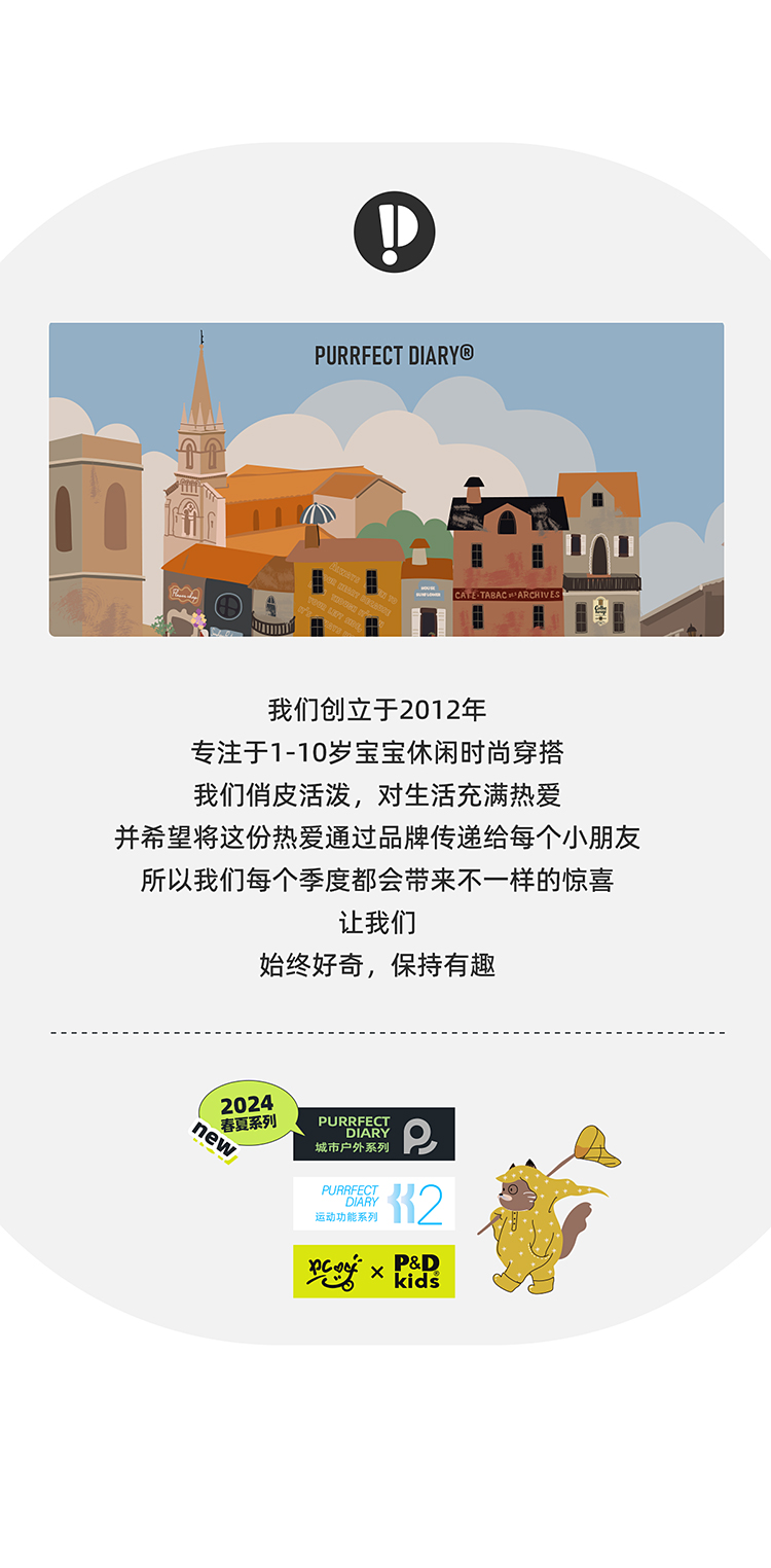 - Purrfect-Diary专注于贴近自然随性的穿着概念,轻奢平价的童装文化传播,在产品设计上更加注重婴童穿着的舒适性、安全性、更出众的国际化品牌,将欧美的育婴文化在中国进行深入的传播与推广。