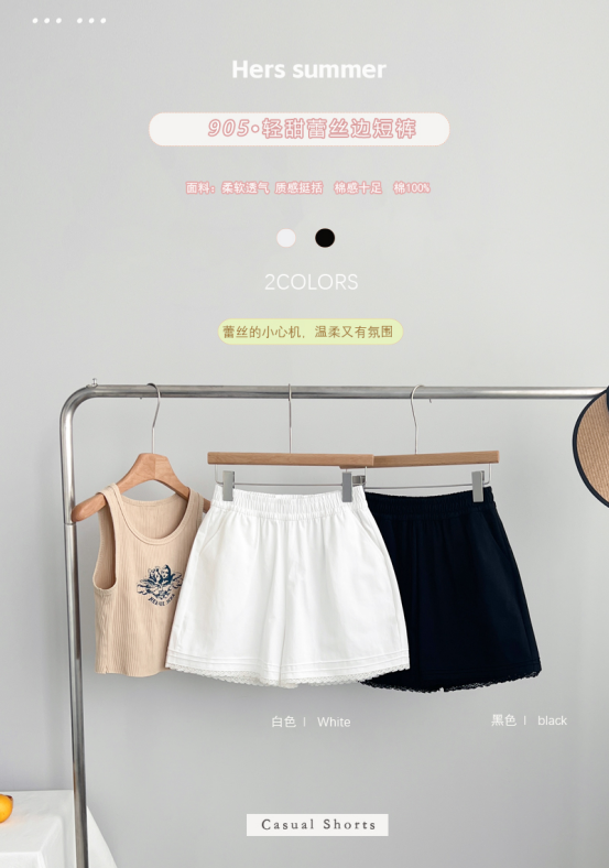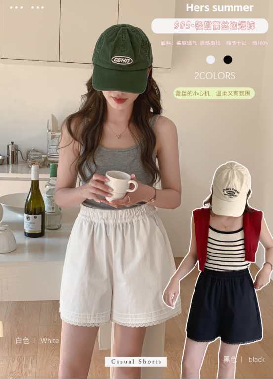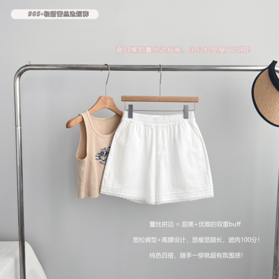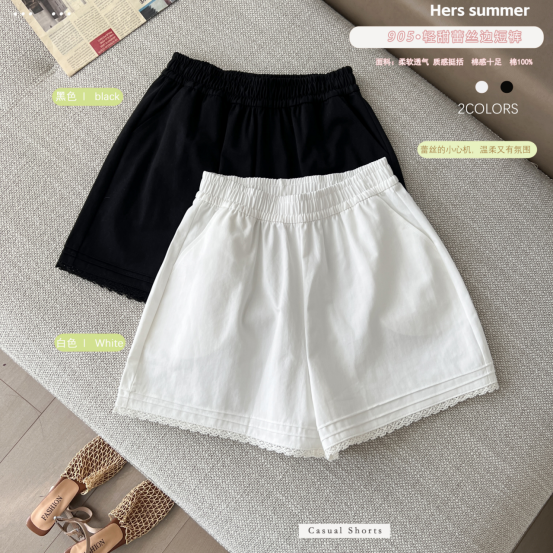 😎【骆柒柒#905•轻甜蕾丝边短裤】 夏日OOTD必备!🌈谁能拒绝这么温柔的小细节? ✅蕾丝拼边 = 甜美+优雅的双重 ✅宽松裤型+高腰设计,🌺显瘦显腿长 ✅纯色百搭,✨随手一穿就超有氛围感!