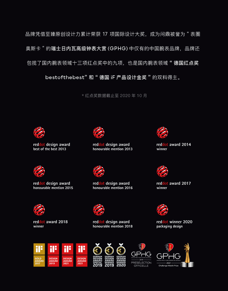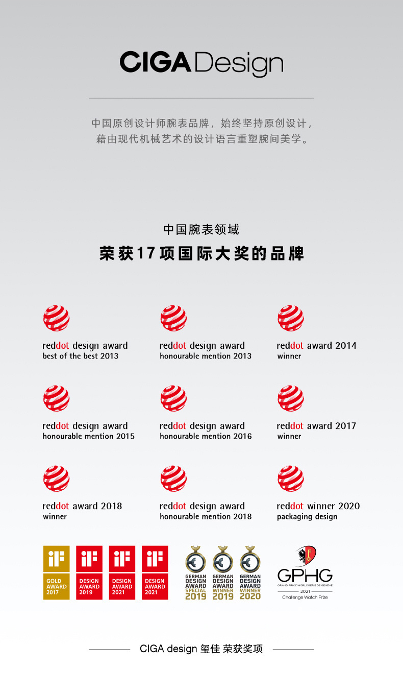- 钟表界设计先锋,2021年荣获第19届瑞士日内瓦钟表大赏GPHG的中国品牌。秉持“设计成就非凡”理念,坚守原创,突破传统。