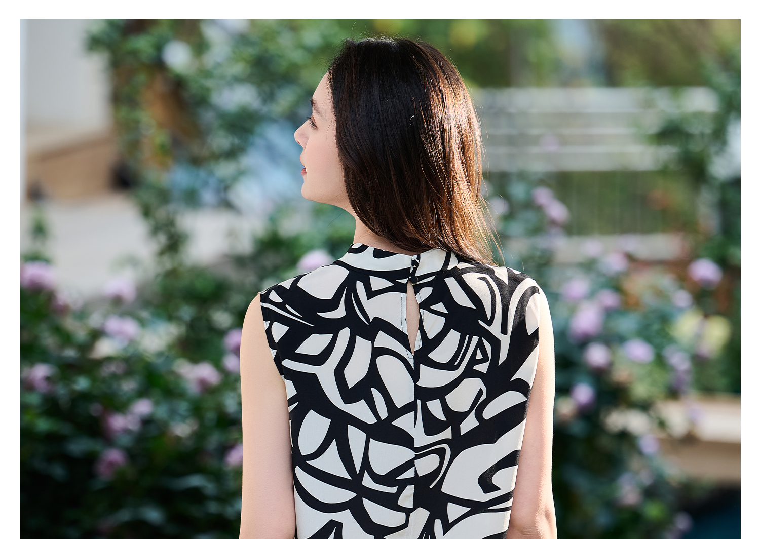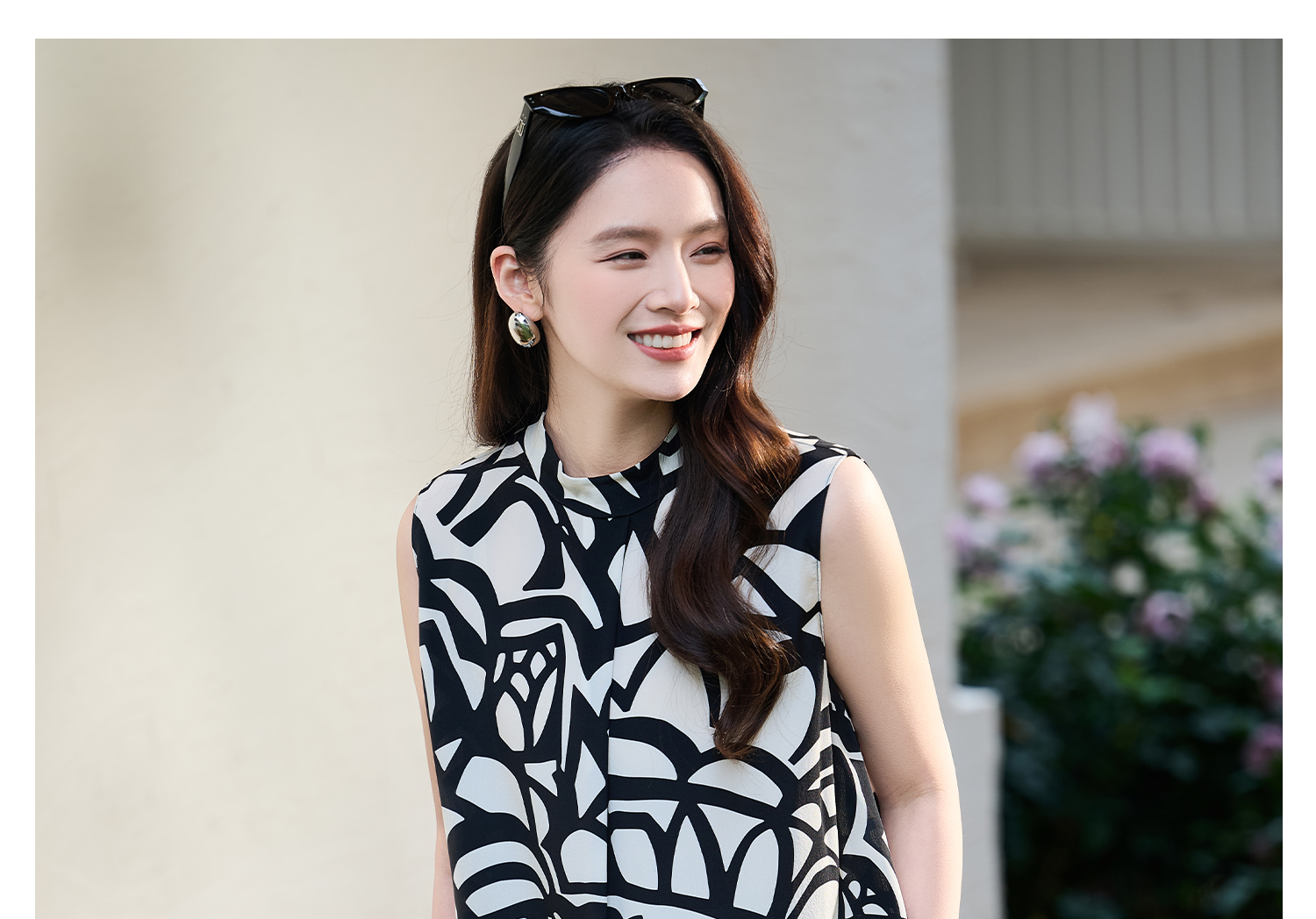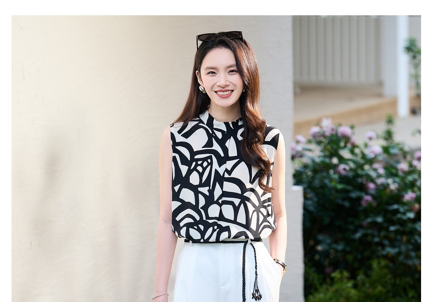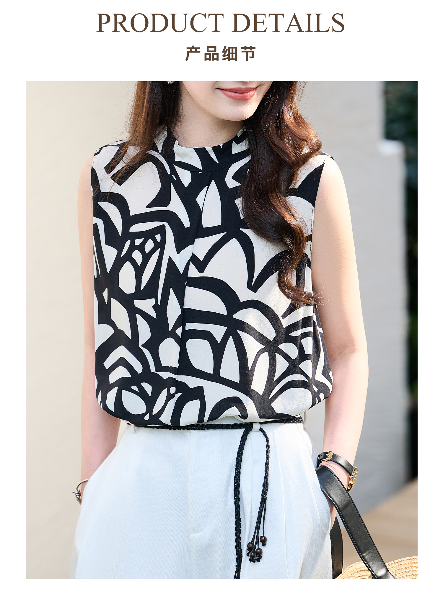米思阳2026夏季新款轻奢高级感黑白印花背心女夏季无袖衬衫小衫百搭上衣女1043