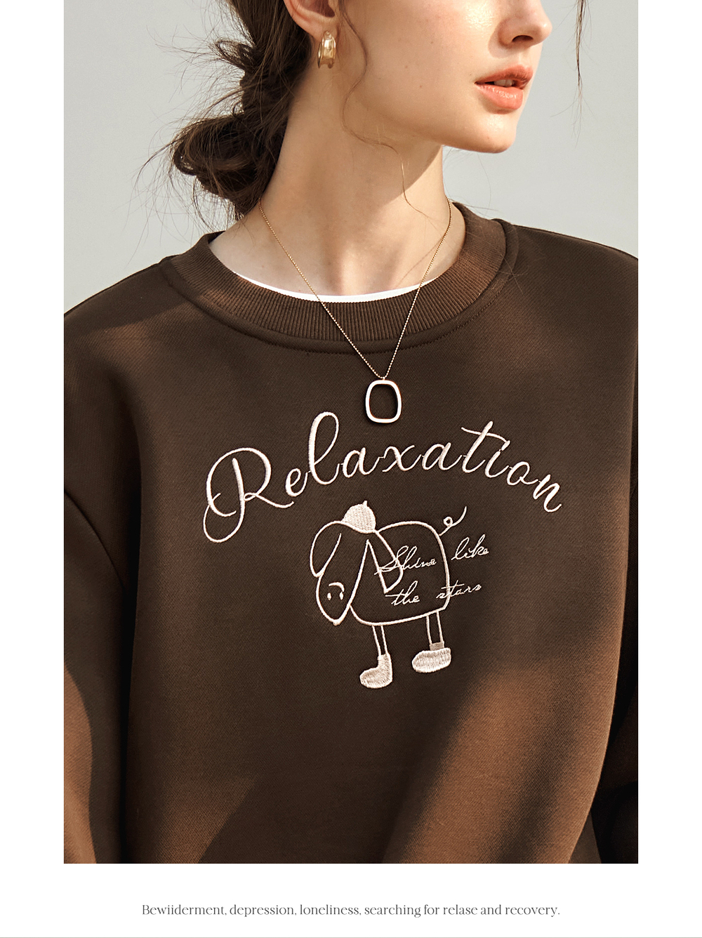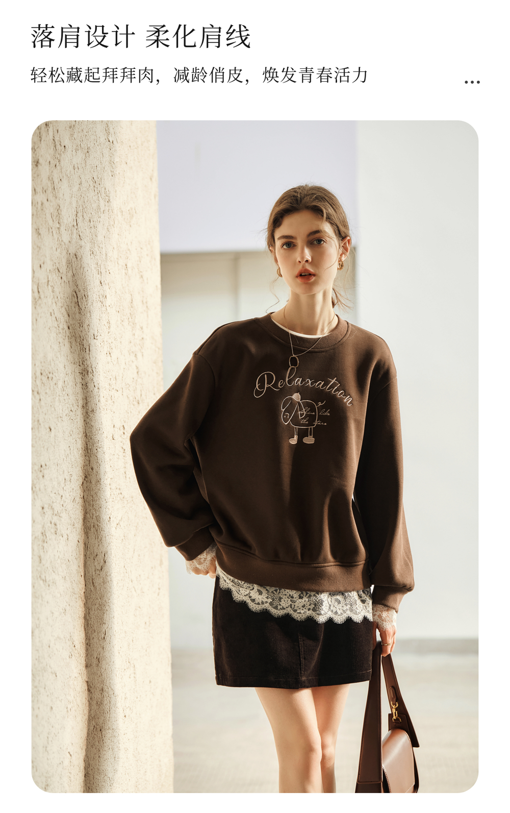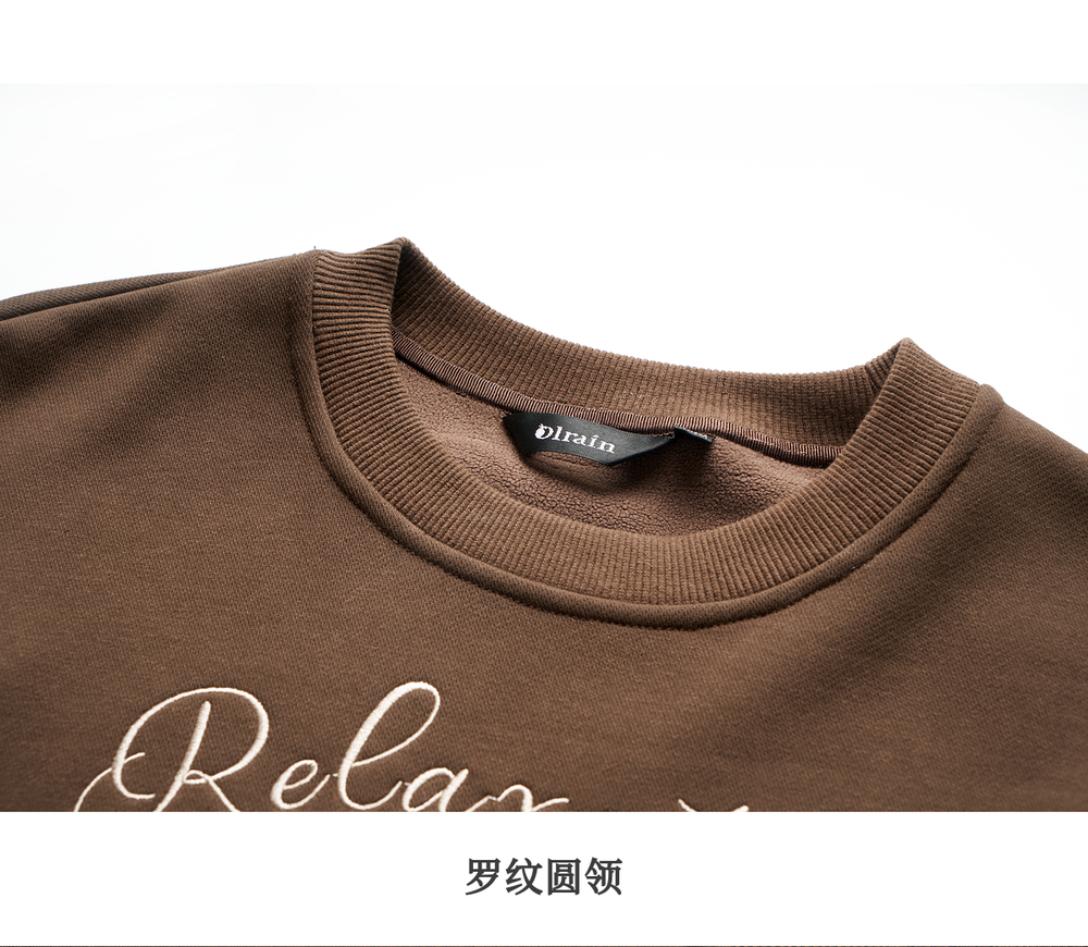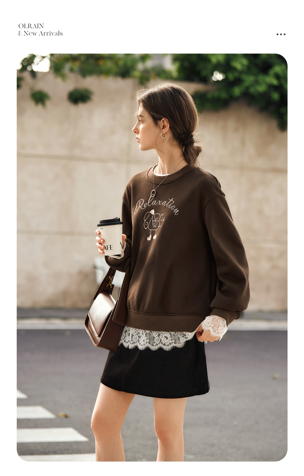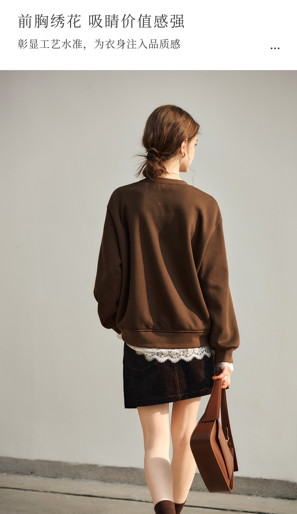 OLrain欧芮儿摩卡色加绒卫衣女冬季2024年新款休闲绣花套头衫