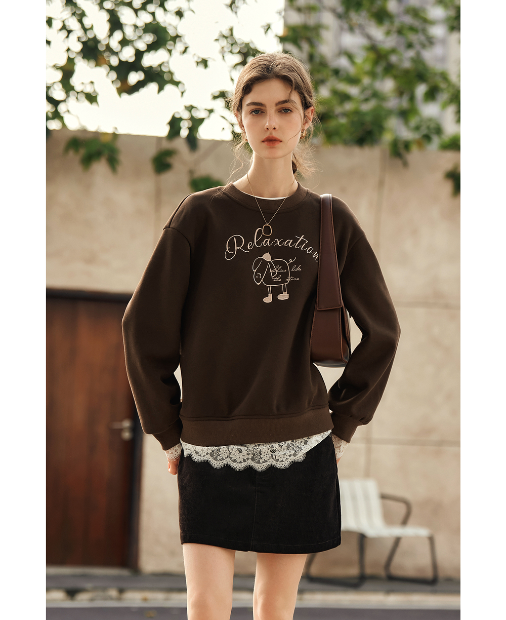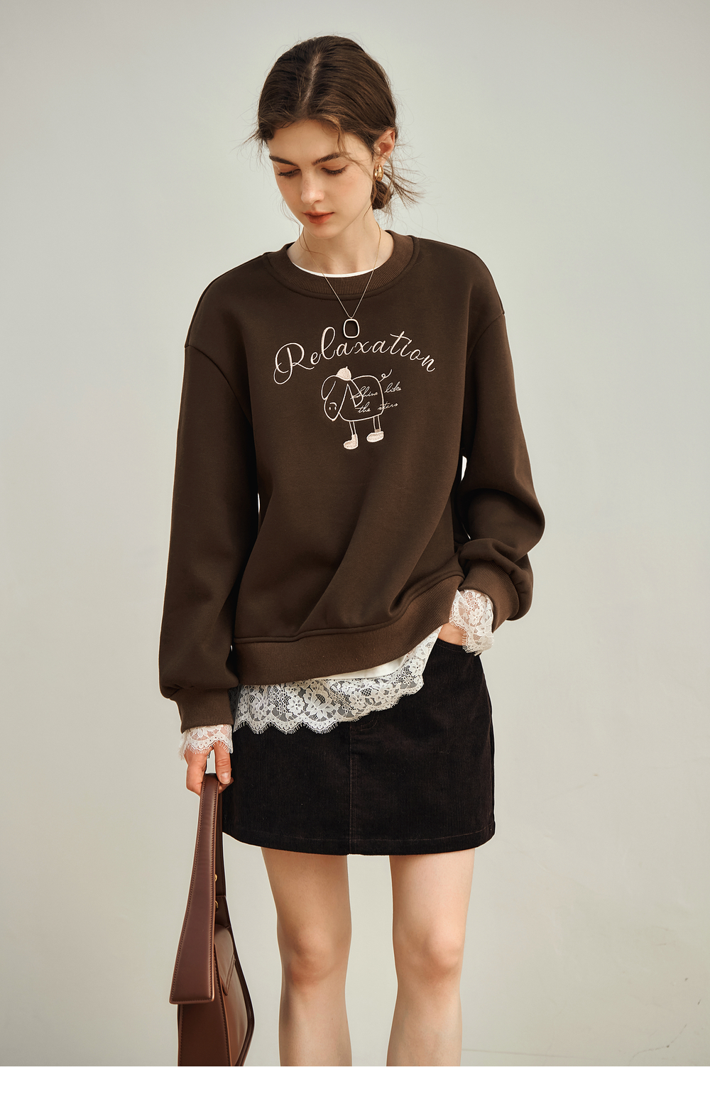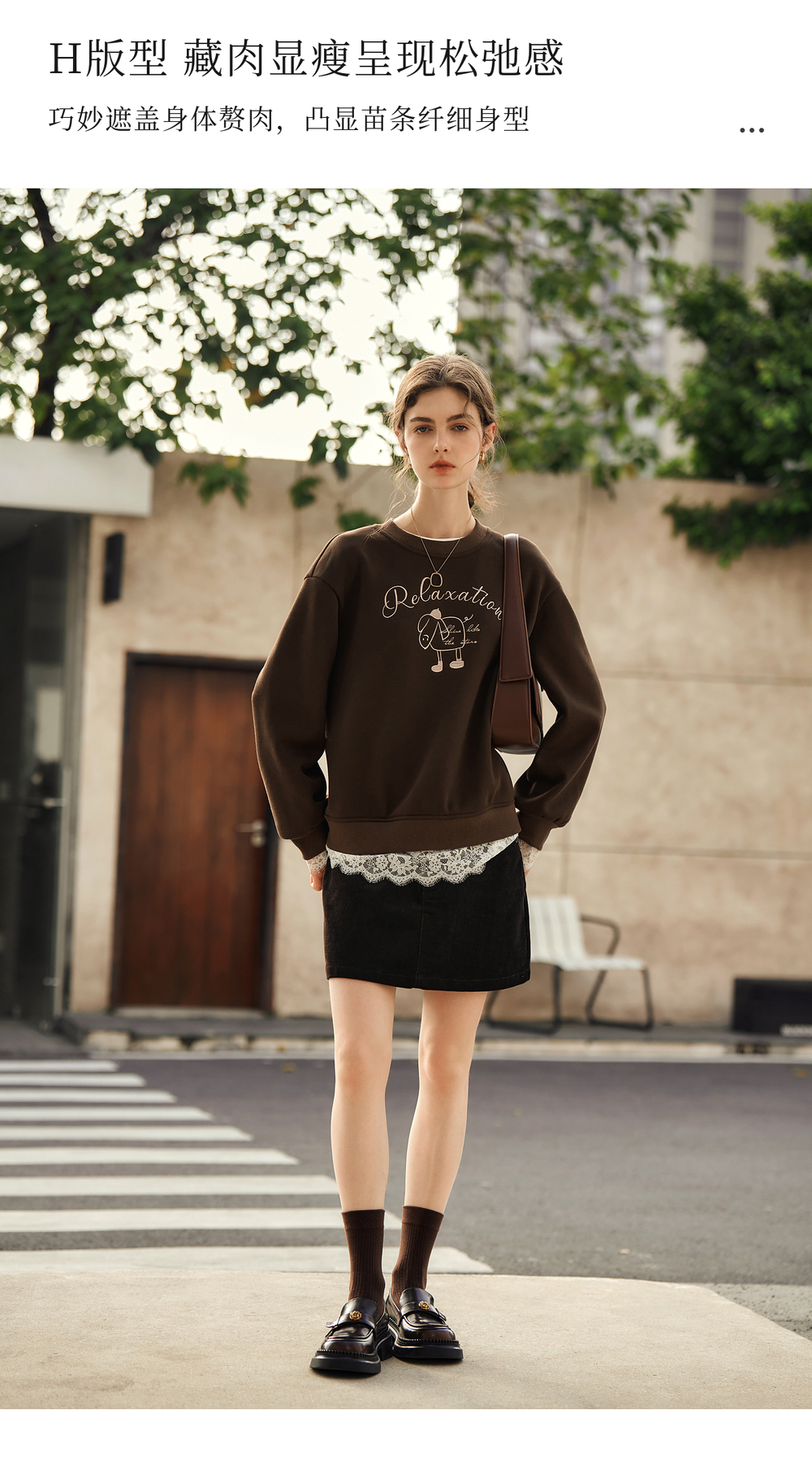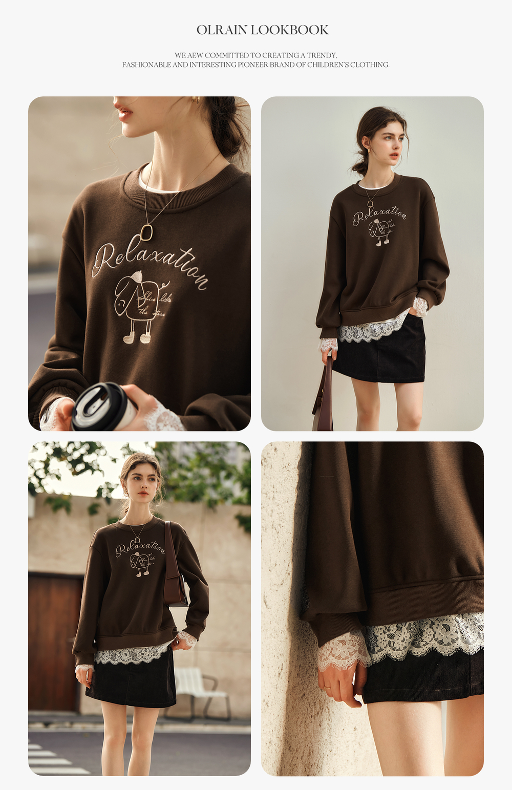 OLrain欧芮儿摩卡色加绒卫衣女冬季2024年新款休闲绣花套头衫