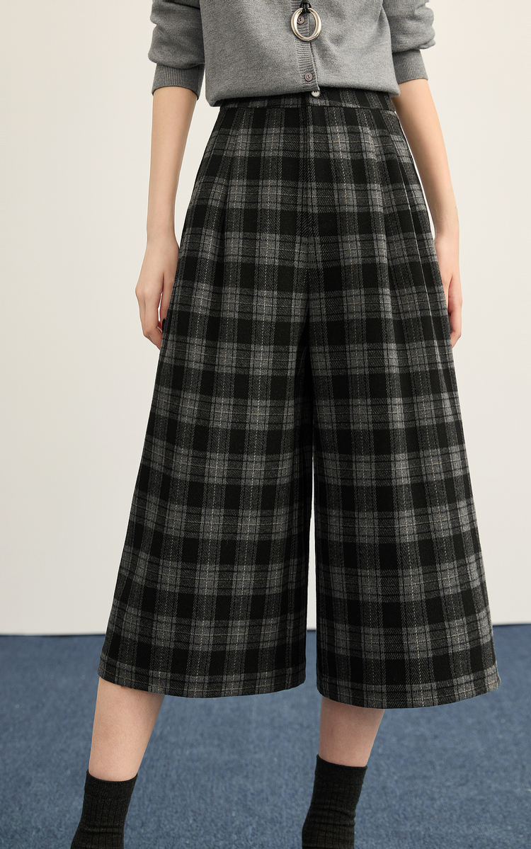 【12/10新品6折】熙世界慵懒复古格纹针织七分阔腿裤女冬季宽松小个子八分休闲裤子