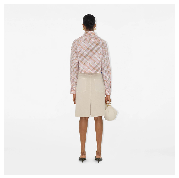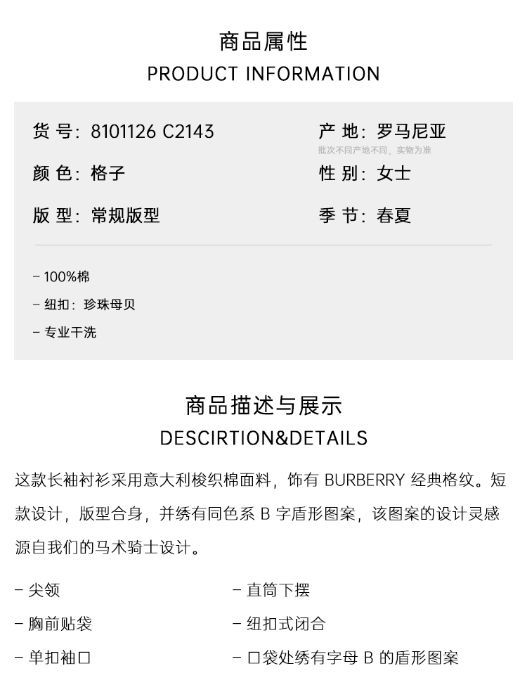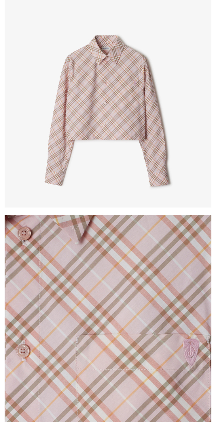 【一】BURBERRY 巴宝莉 女士 B 盾牌刺绣短款格纹棉质长袖衬衫 格子 8101126 C2143