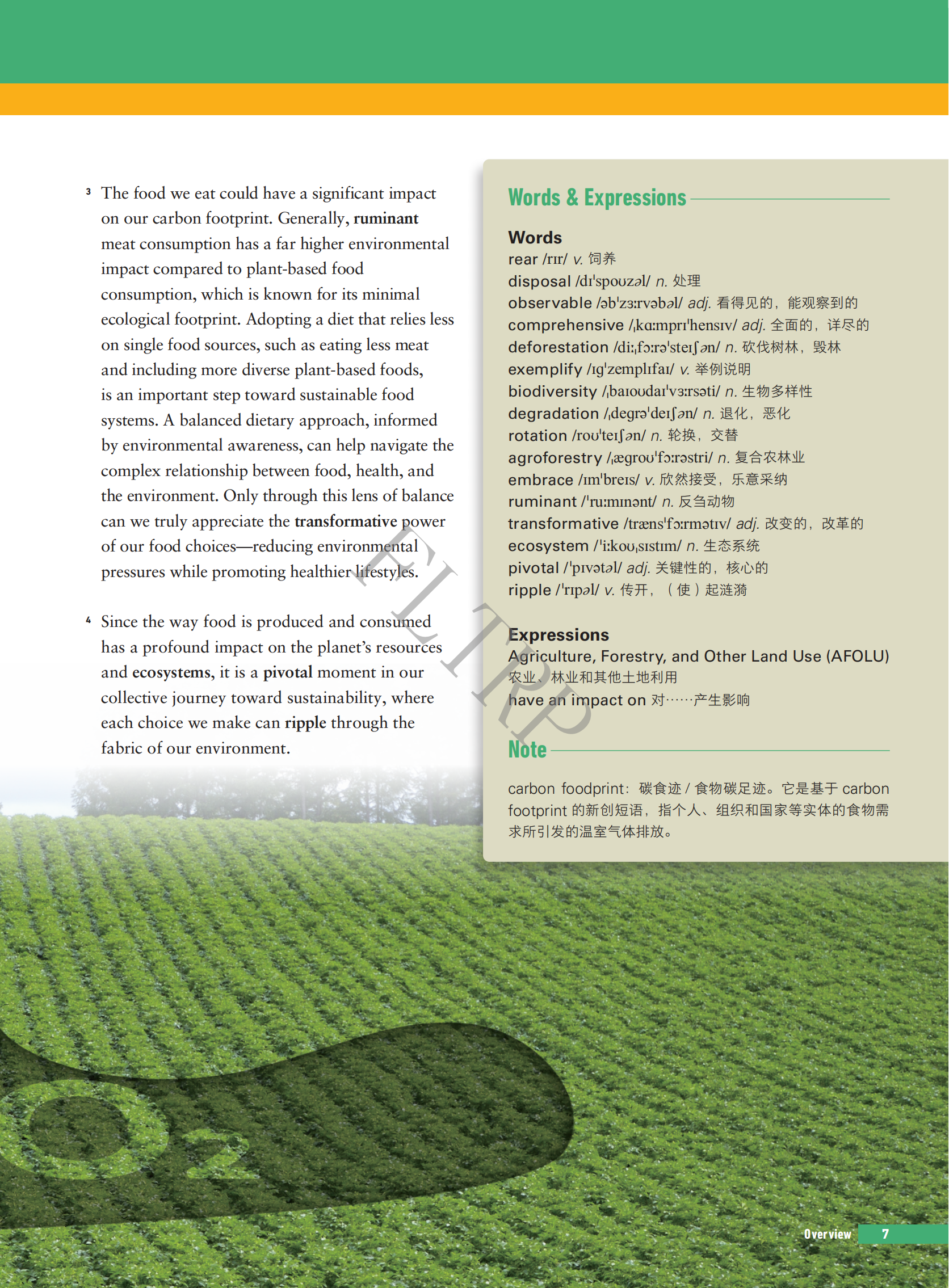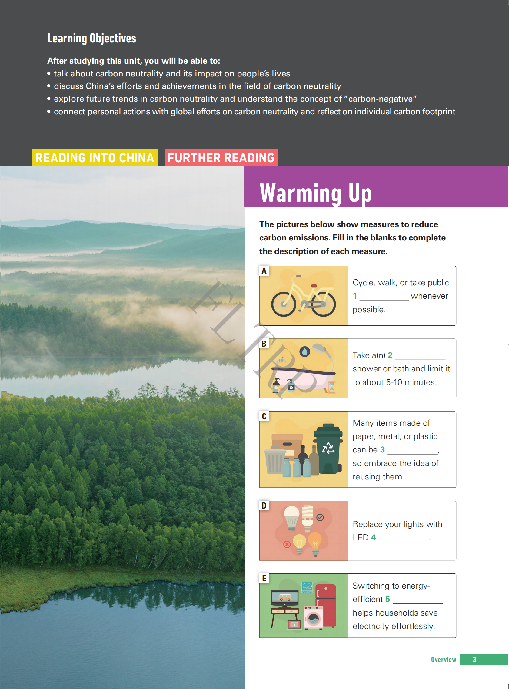 《碳英语词汇手册》提供的词条、短语和例句均甄选自约500万词的“碳学术话语语料库”。所有词条的选定采用统计方法,按常用程度高低排序,并以星号表示频度:五星词为极高频词, 四星词为高频词,三星词为普通高频词。 全书共收录核心词365个。其中,五星词100个,四星词100个, 三星词165个。书中词语用法示例采用两种形式:短语和句子。单词词义往往难以独立确定,将其放在短语、句子等真实语境中,意义可以更加完整和明晰地呈现。另外,为了更直观生动地呈现词条释义,让词汇学习不再是枯燥的死记硬背,本书还配有图片和注释等丰富的内容,帮助学生快乐阅读,轻松记忆。