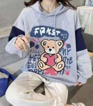 04882937小熊卫衣,均码号,100-145斤都可以穿,适合学生,以藏蓝,灰色为主打,白色辅助,面料以棉为主,透气性好,穿着舒适,搭配牛仔裤,运动裤。