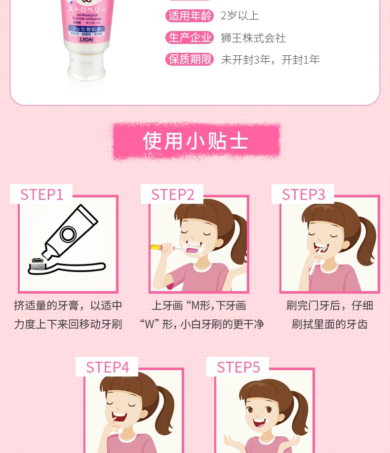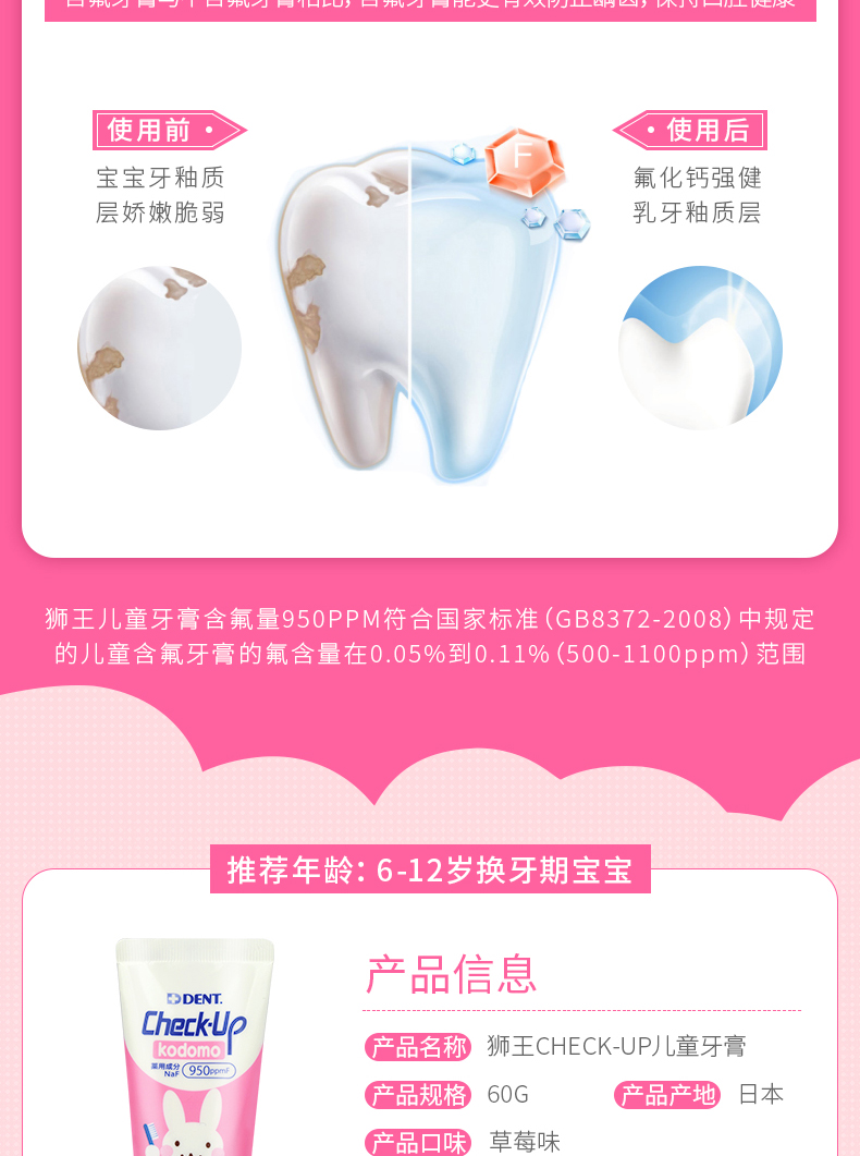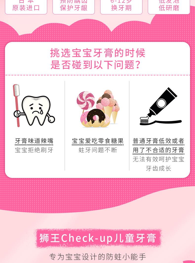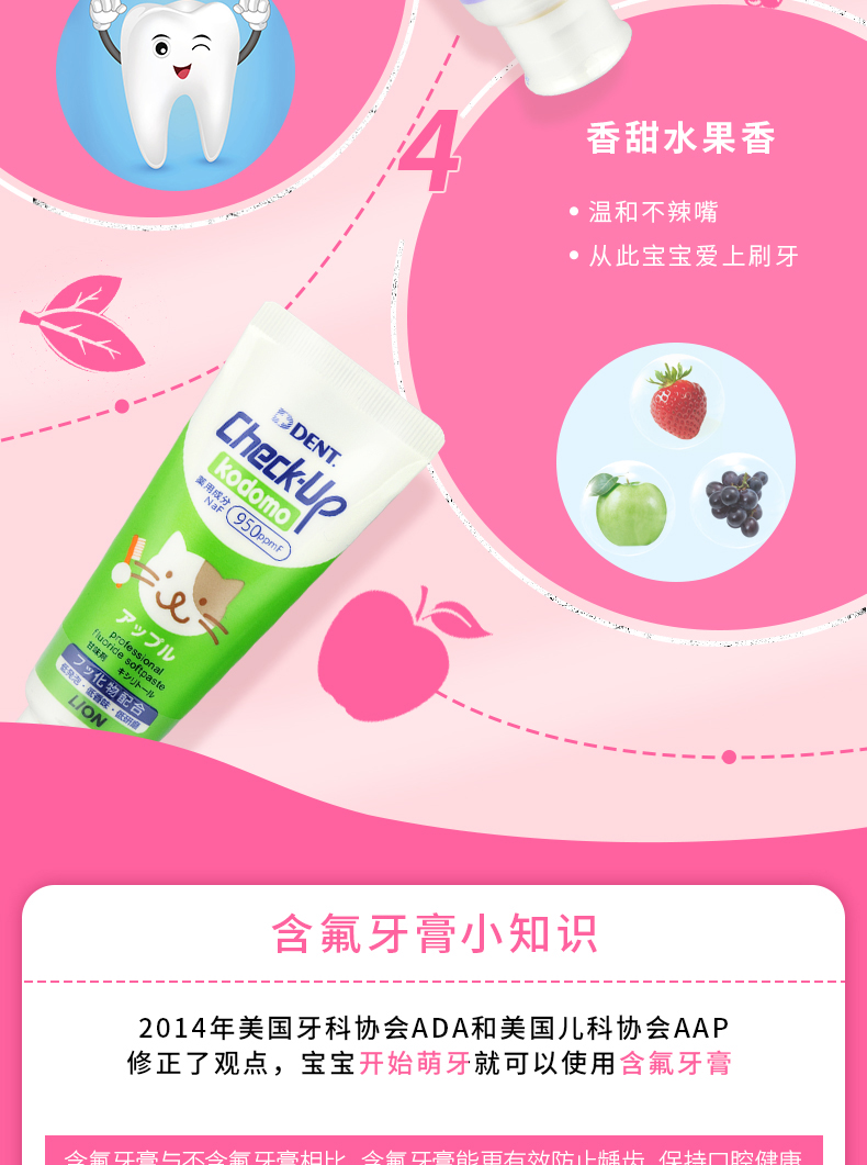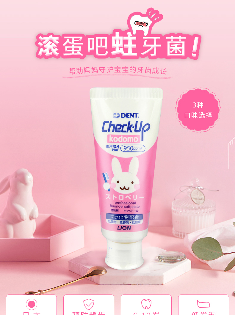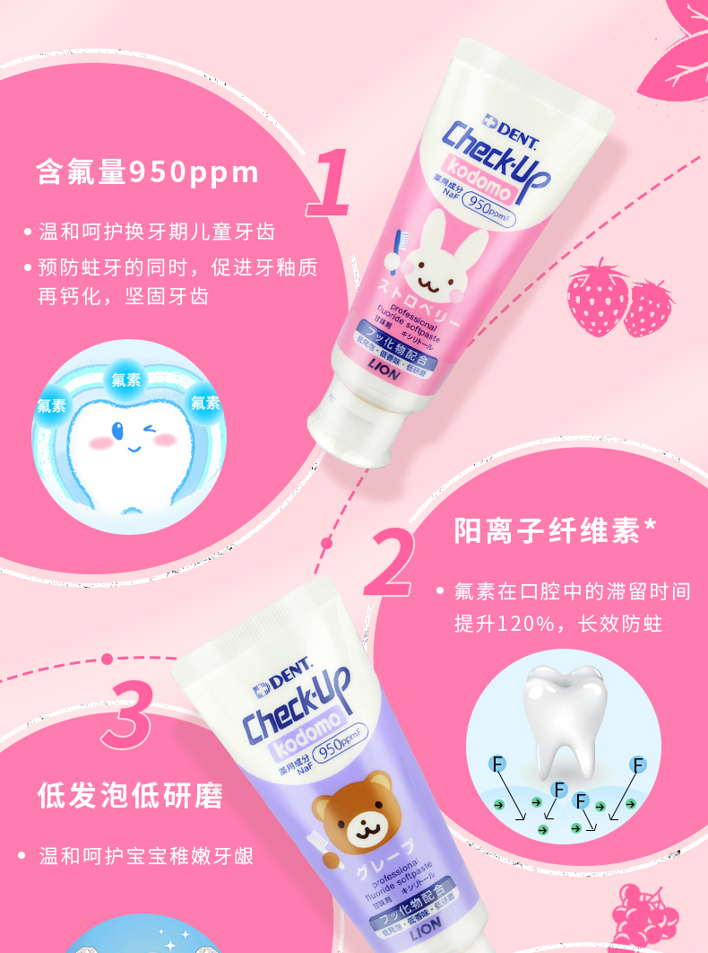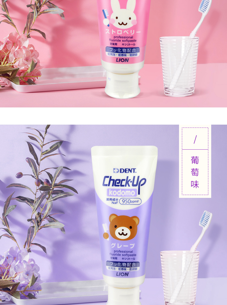 狮王Lion儿童牙膏专业线check-up龋克菲宝宝防蛀牙膏葡萄/苹果/草莓味