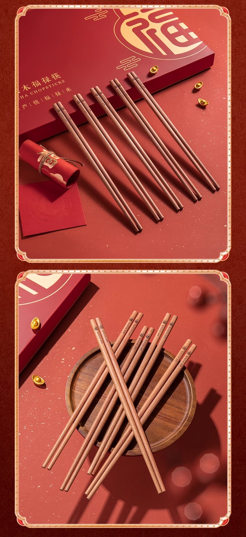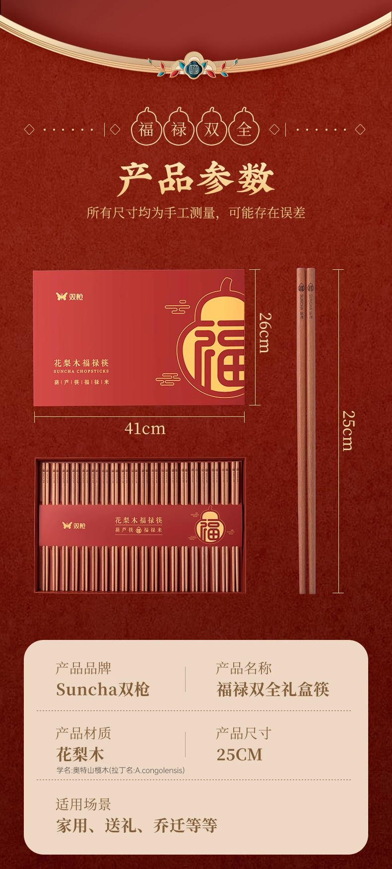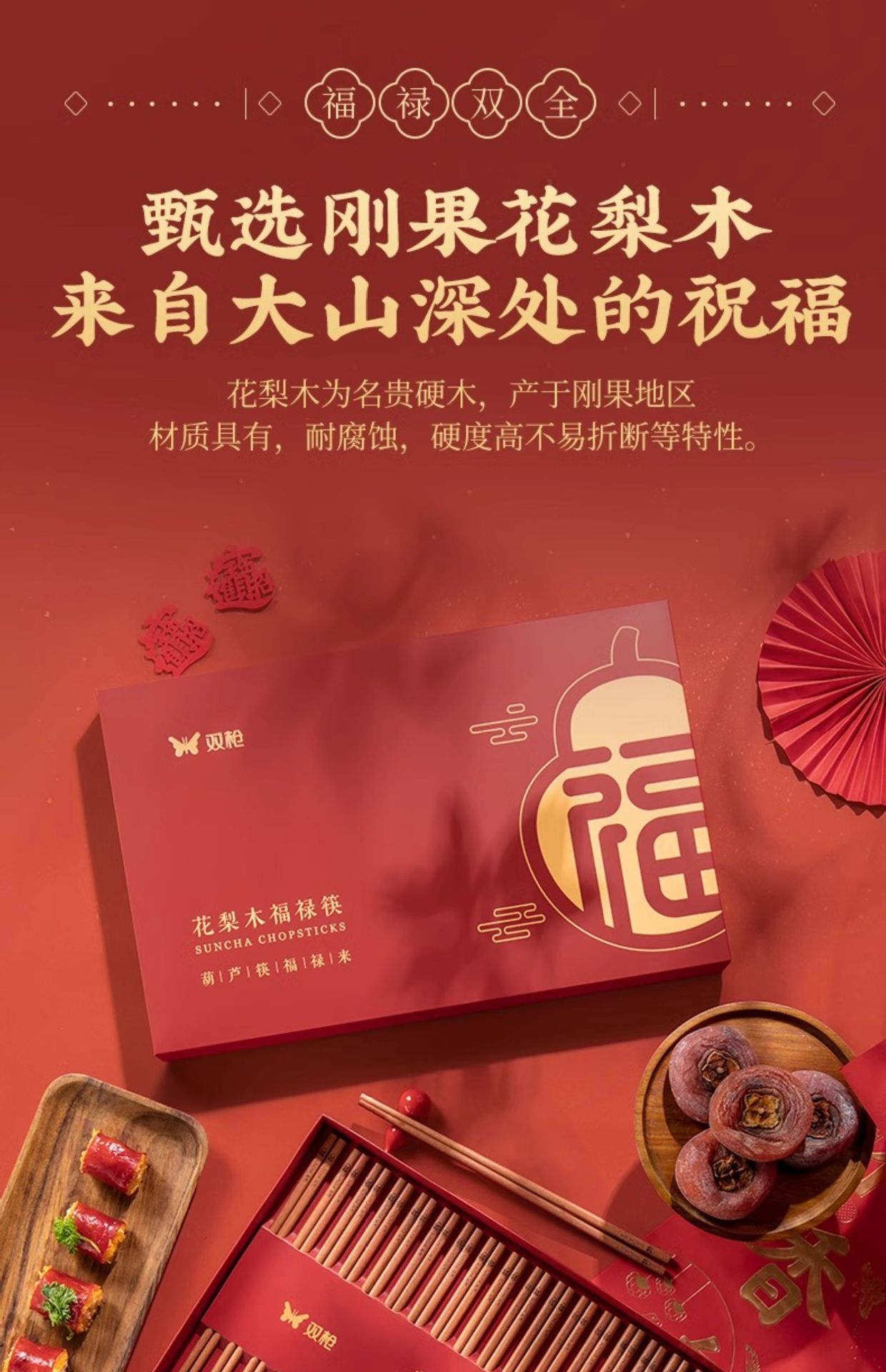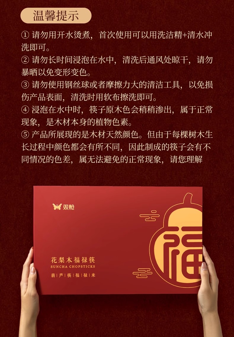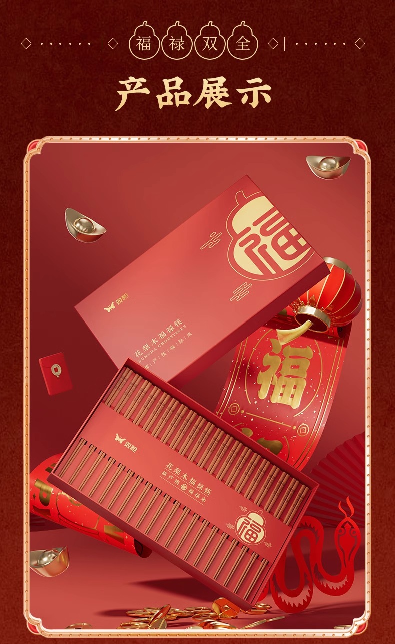 新年双福全禄【20双装!0漆0蜡花梨木筷子礼盒装】双枪高奢礼盒筷子套装 木筷鸡翅木家用木筷子 防霉无毒筷