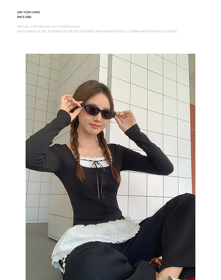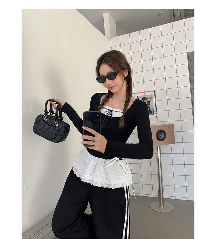 西遇假两件长袖T恤女2025年新款内搭设计感蕾丝拼接修身上衣SS150192