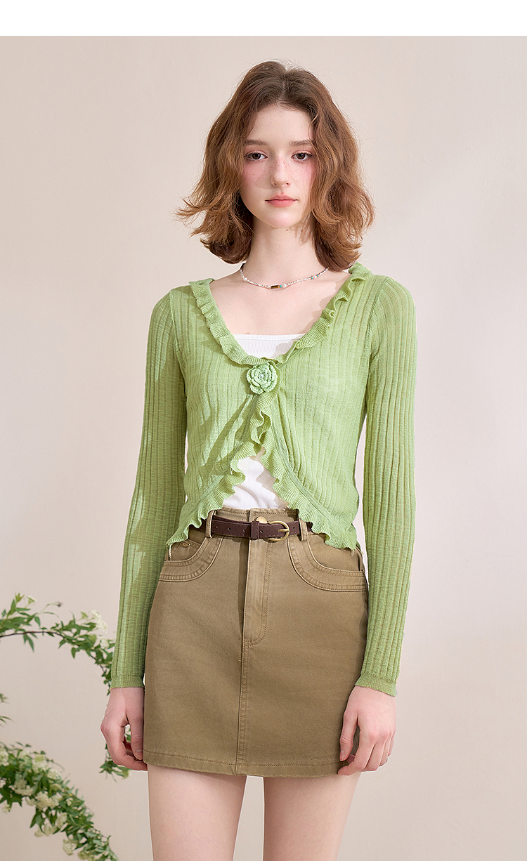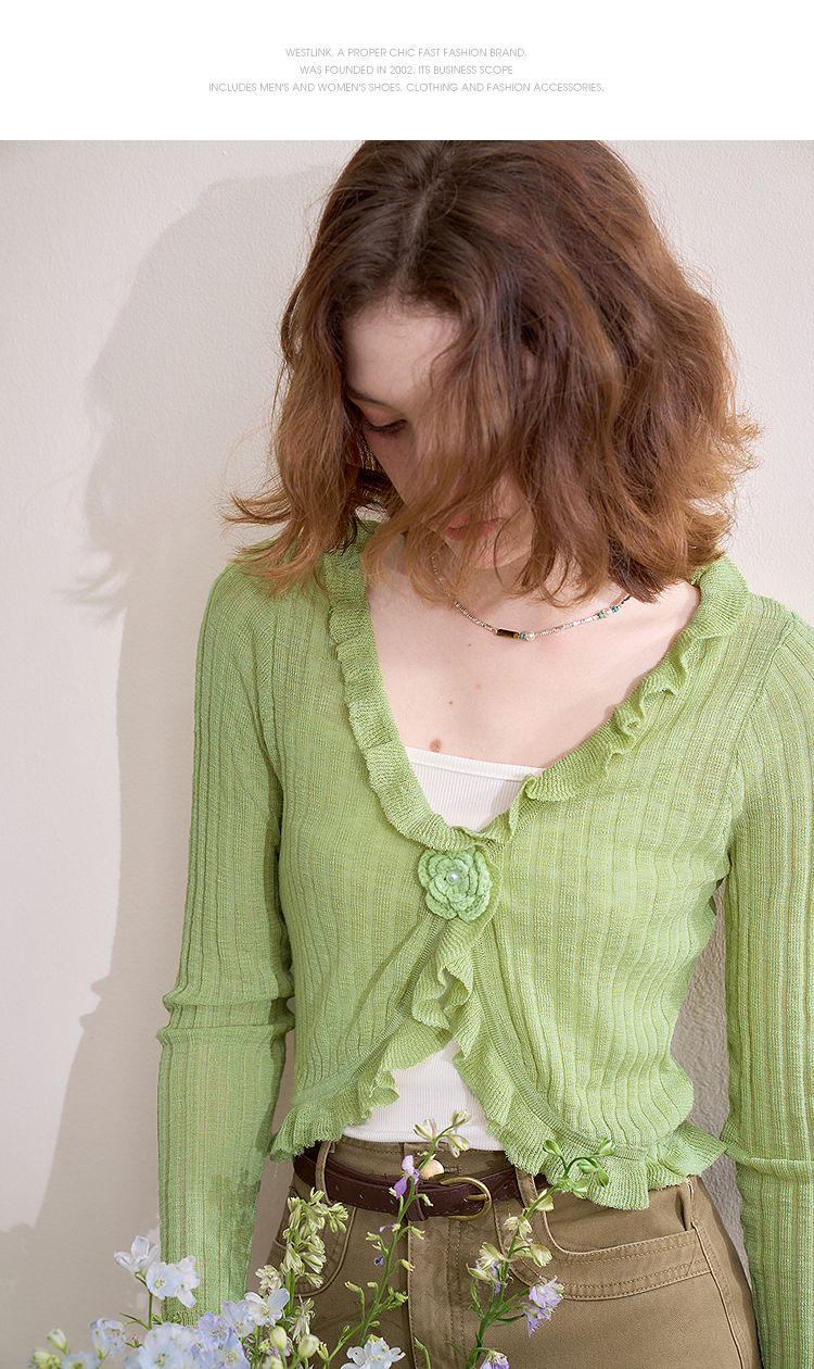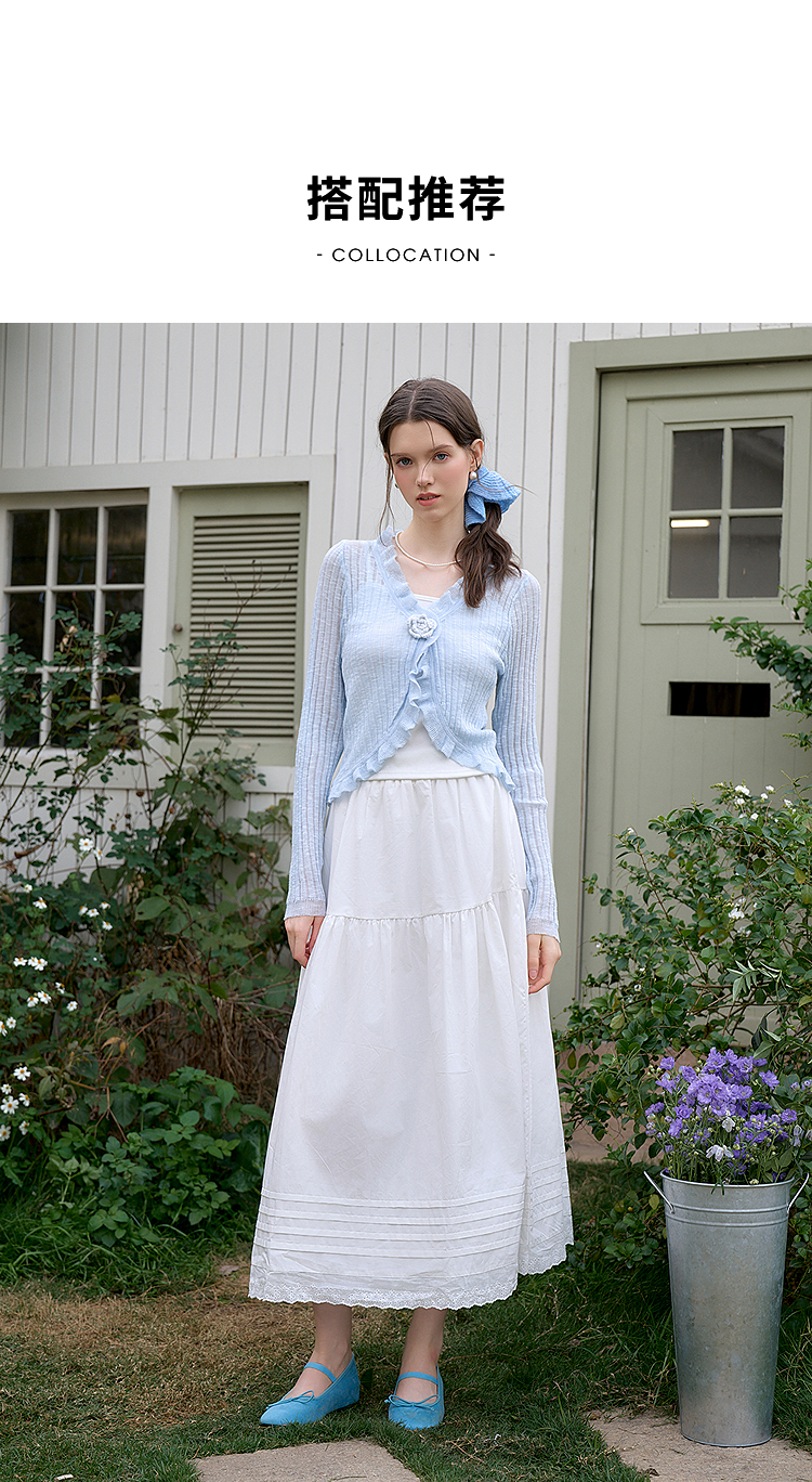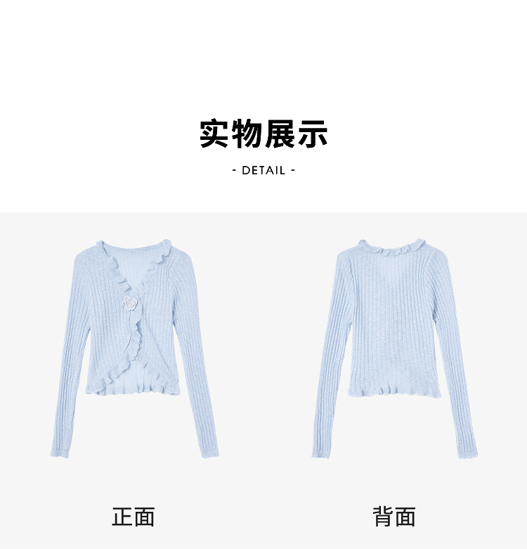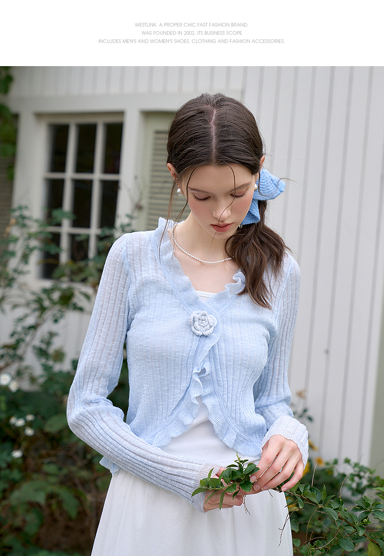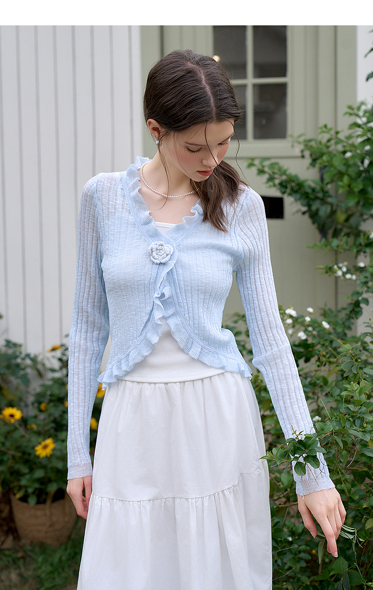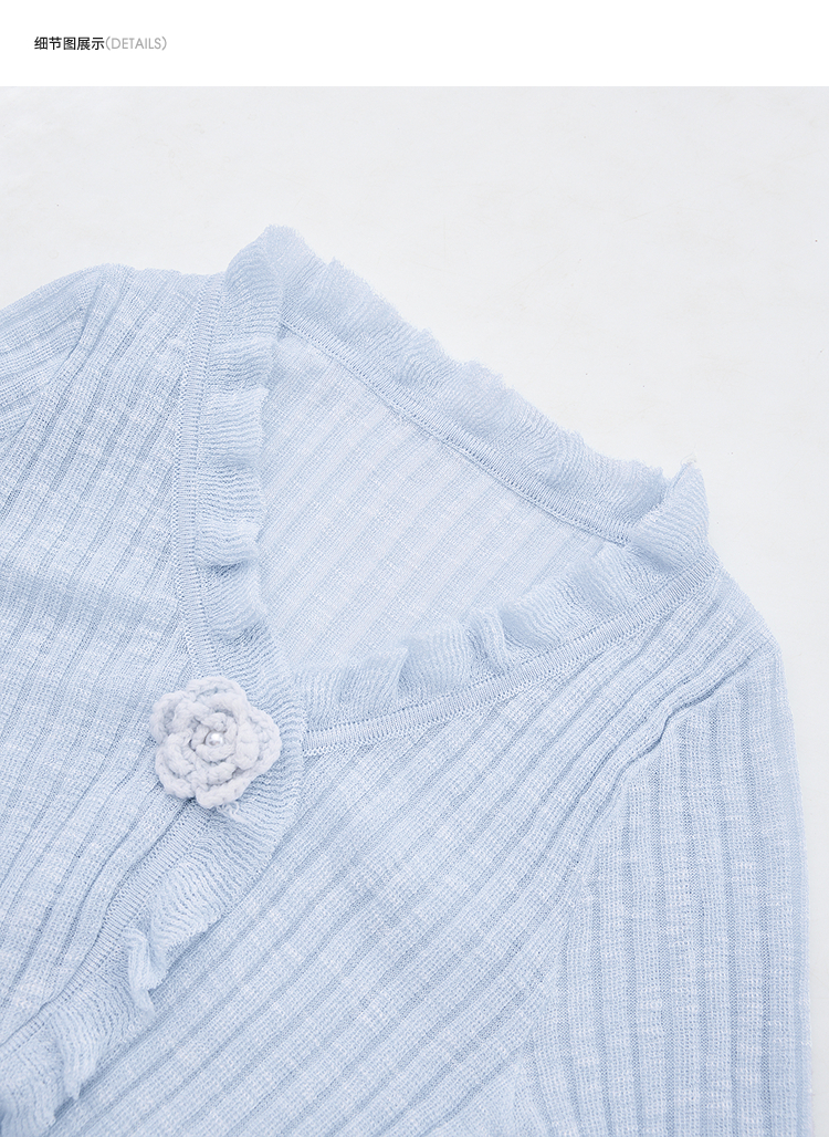 西遇蓝色薄款针织开衫女新款花朵荷叶边防晒短款外套D0050410