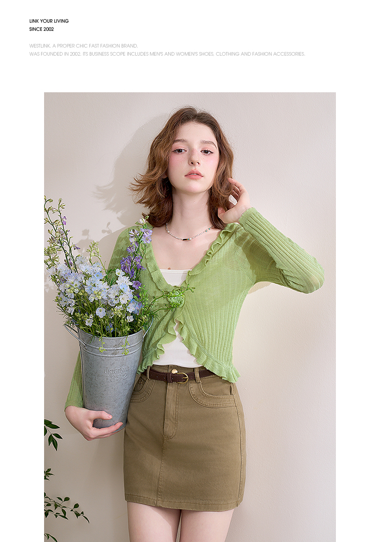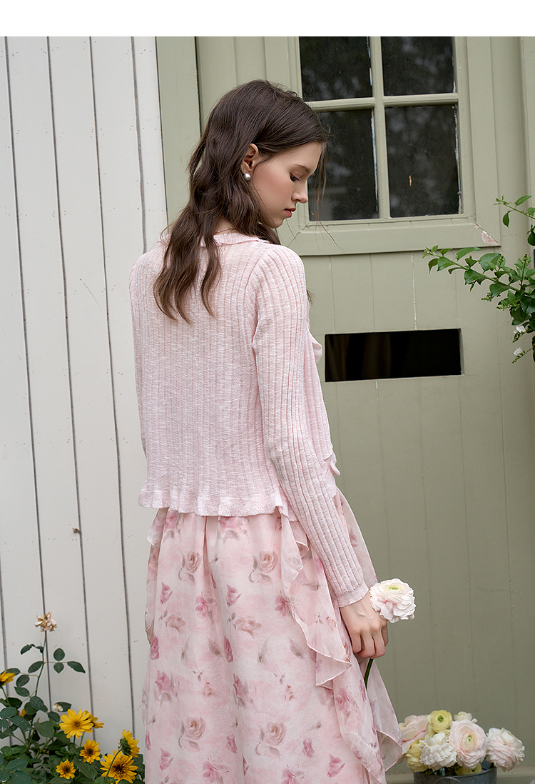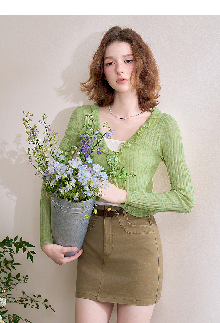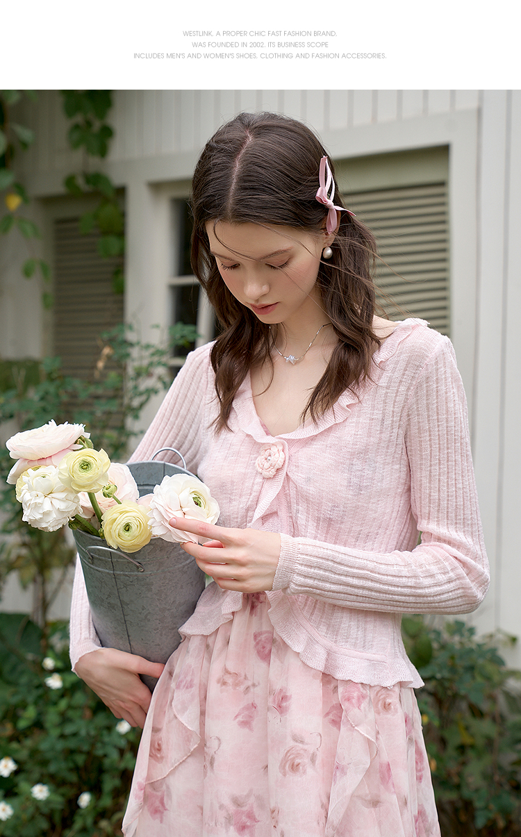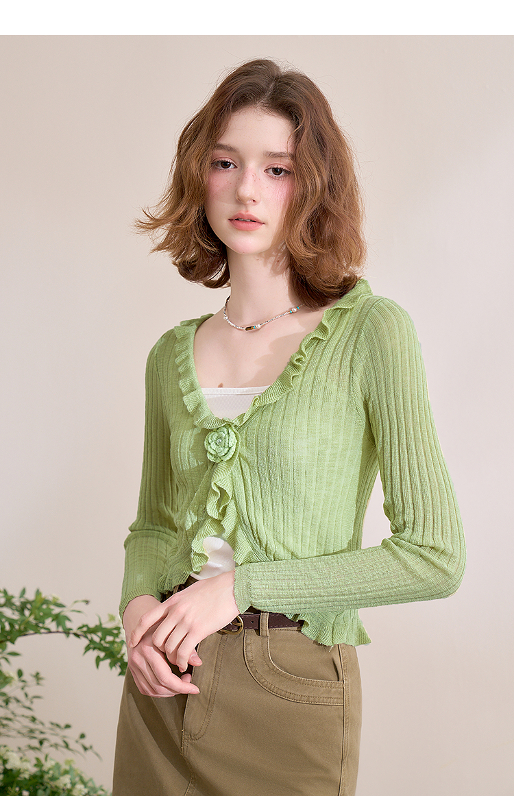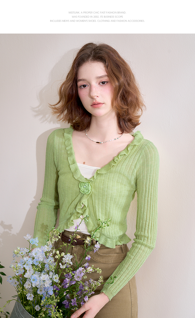 西遇蓝色薄款针织开衫女新款花朵荷叶边防晒短款外套D0050410