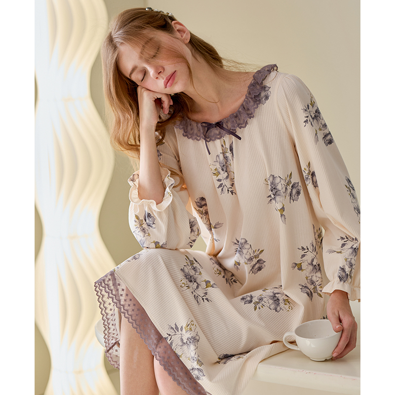 芬腾睡裙女春秋季新款纯棉长袖睡衣裙女款宽松休闲大码家居服中裙