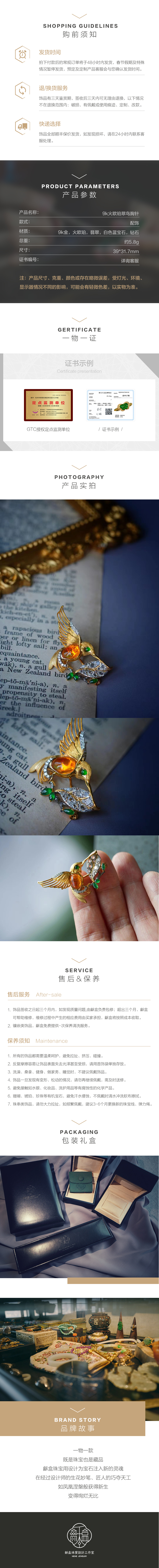 龢盒原创 9k金镶火欧珀翠鸟胸针