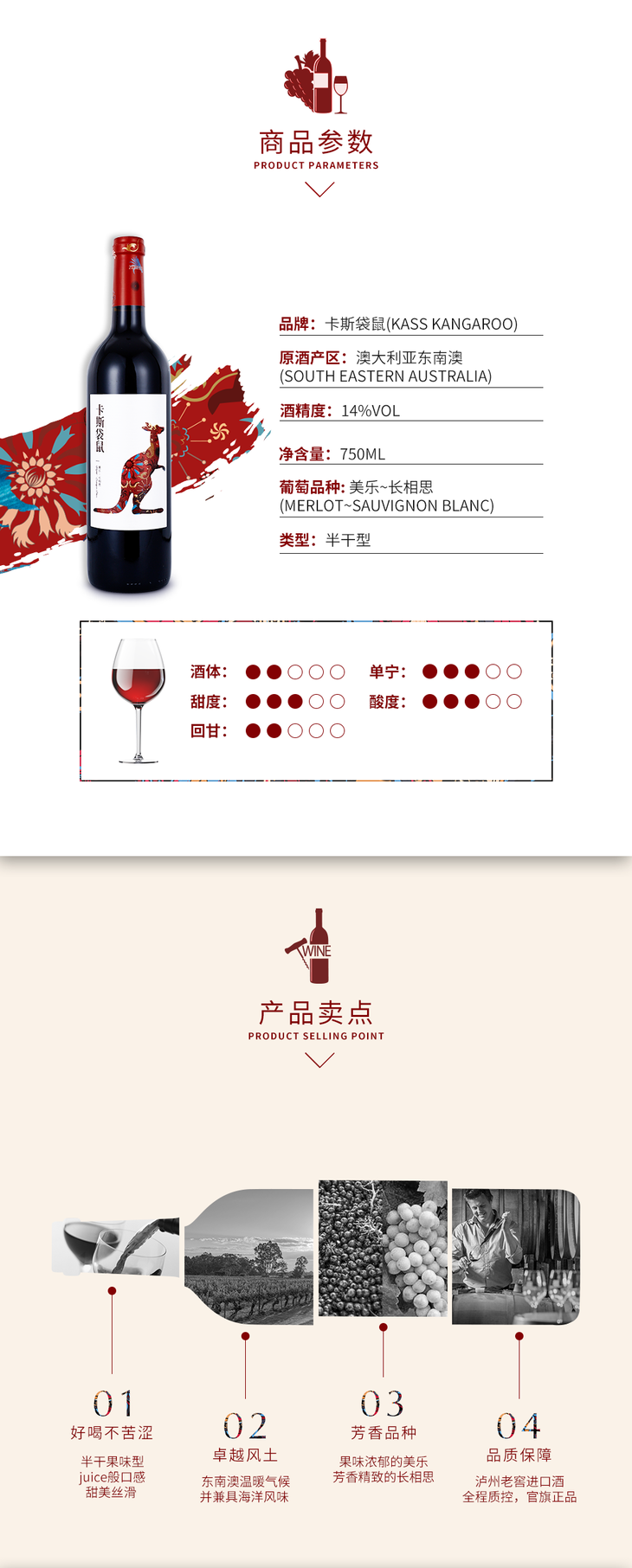 澳洲进口卡斯袋鼠红葡萄酒 半干红 750ml*6整箱【泸州老窖酒名堂】