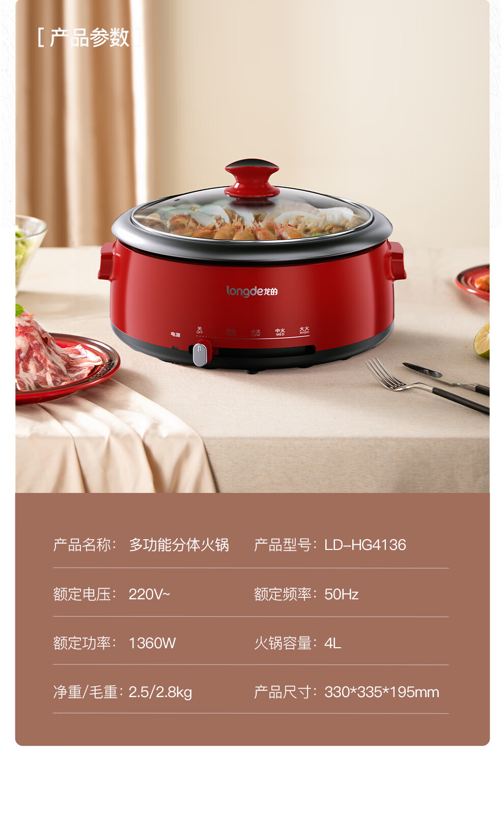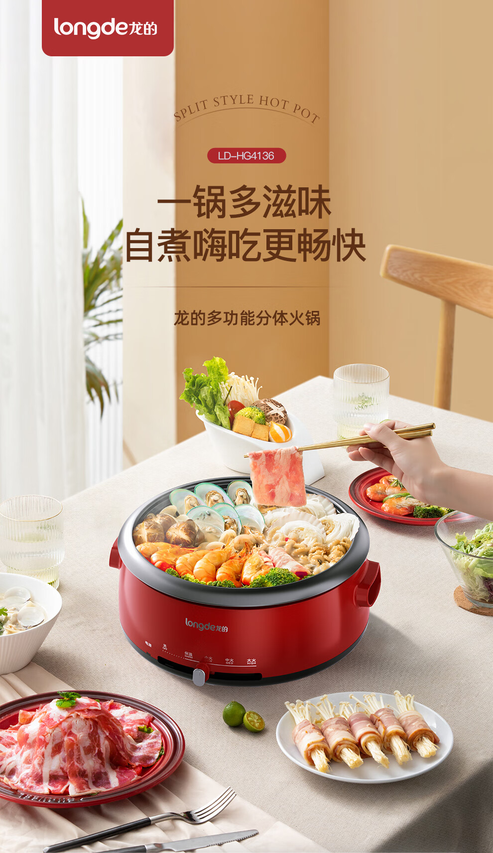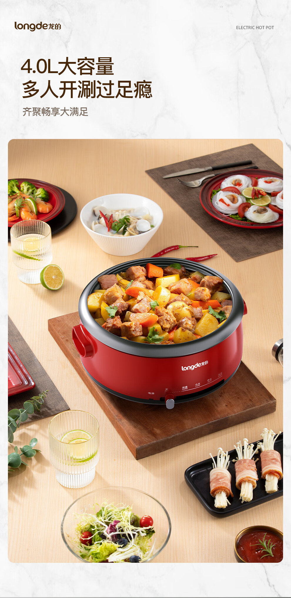 【小家电】龙的电火锅电热锅 4L大容量电煮锅多功能料理锅 家用涮烤火锅 LD-HG4136 HF