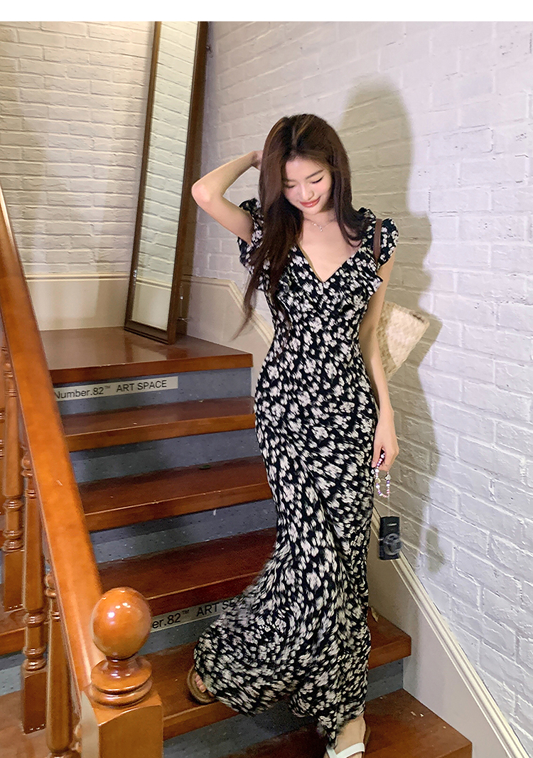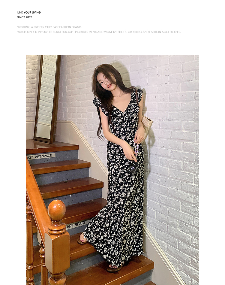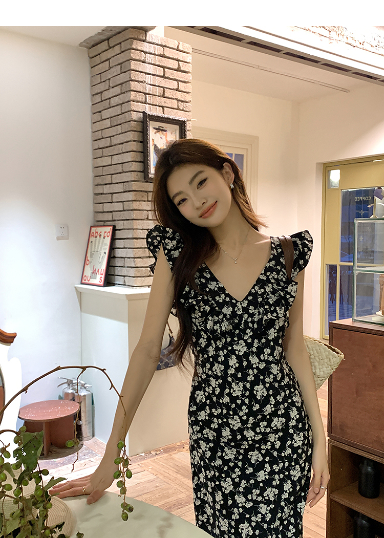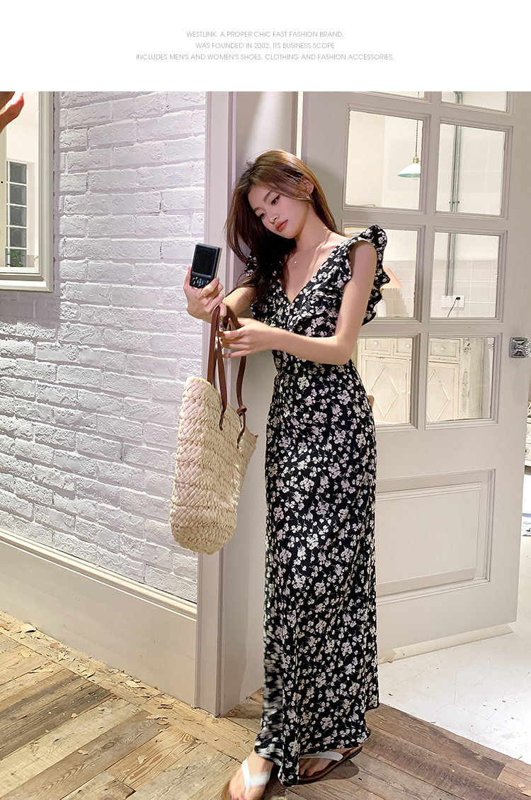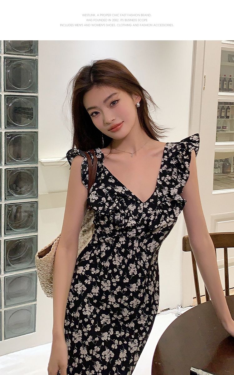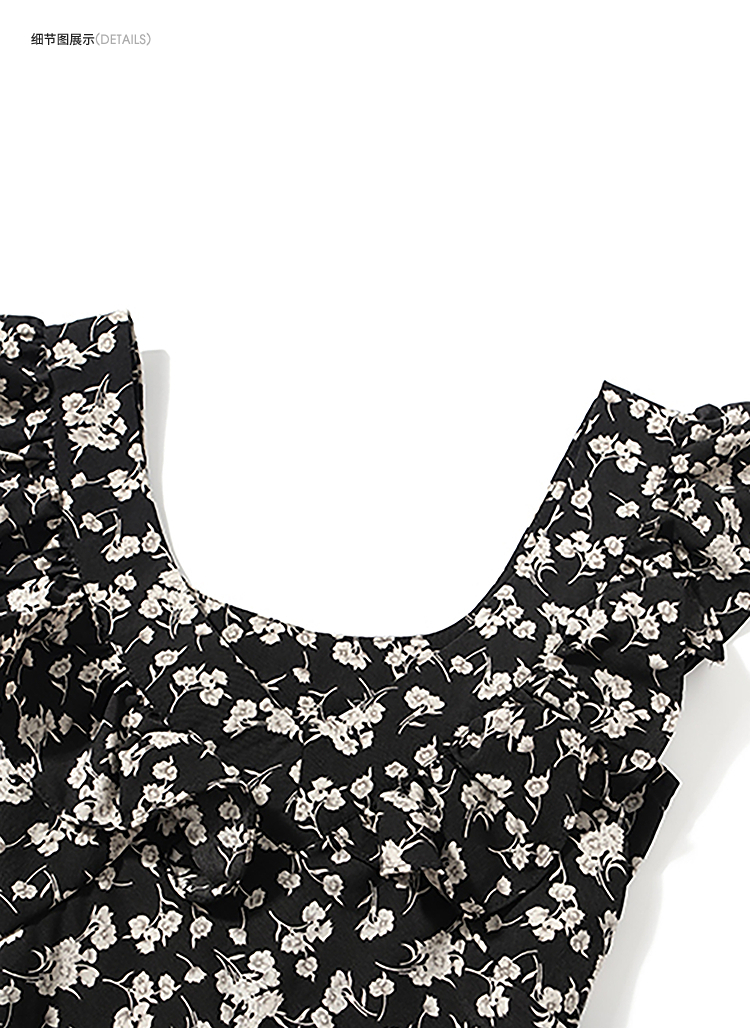 西遇修身碎花连衣裙女夏季新款法式收腰荷叶边黑色V领长裙SS050984