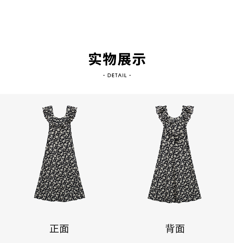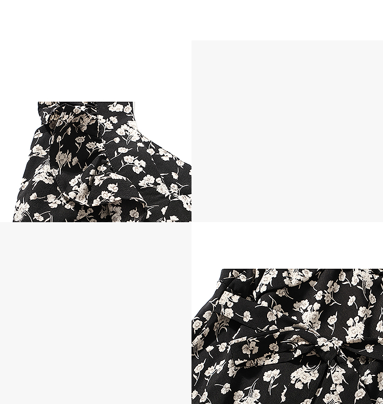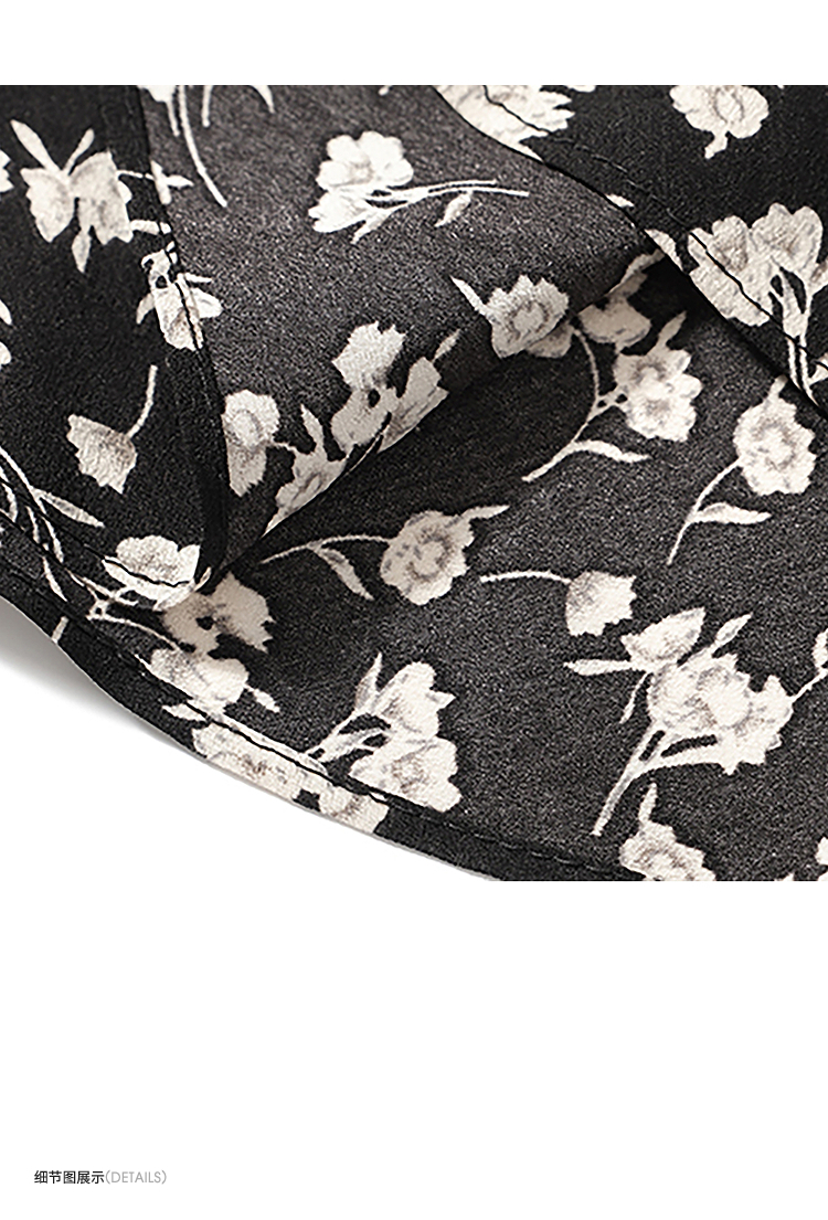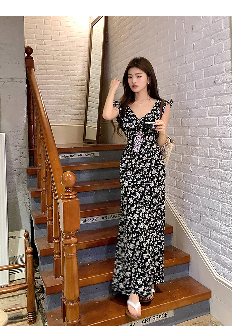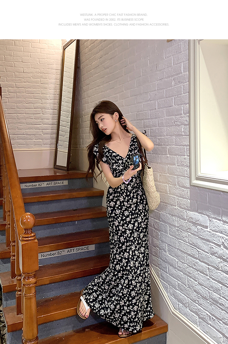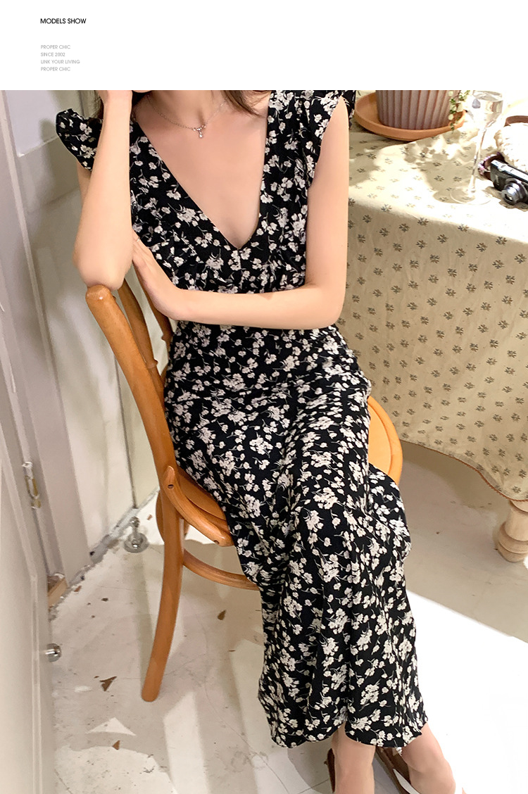 西遇修身碎花连衣裙女夏季新款法式收腰荷叶边黑色V领长裙SS050984