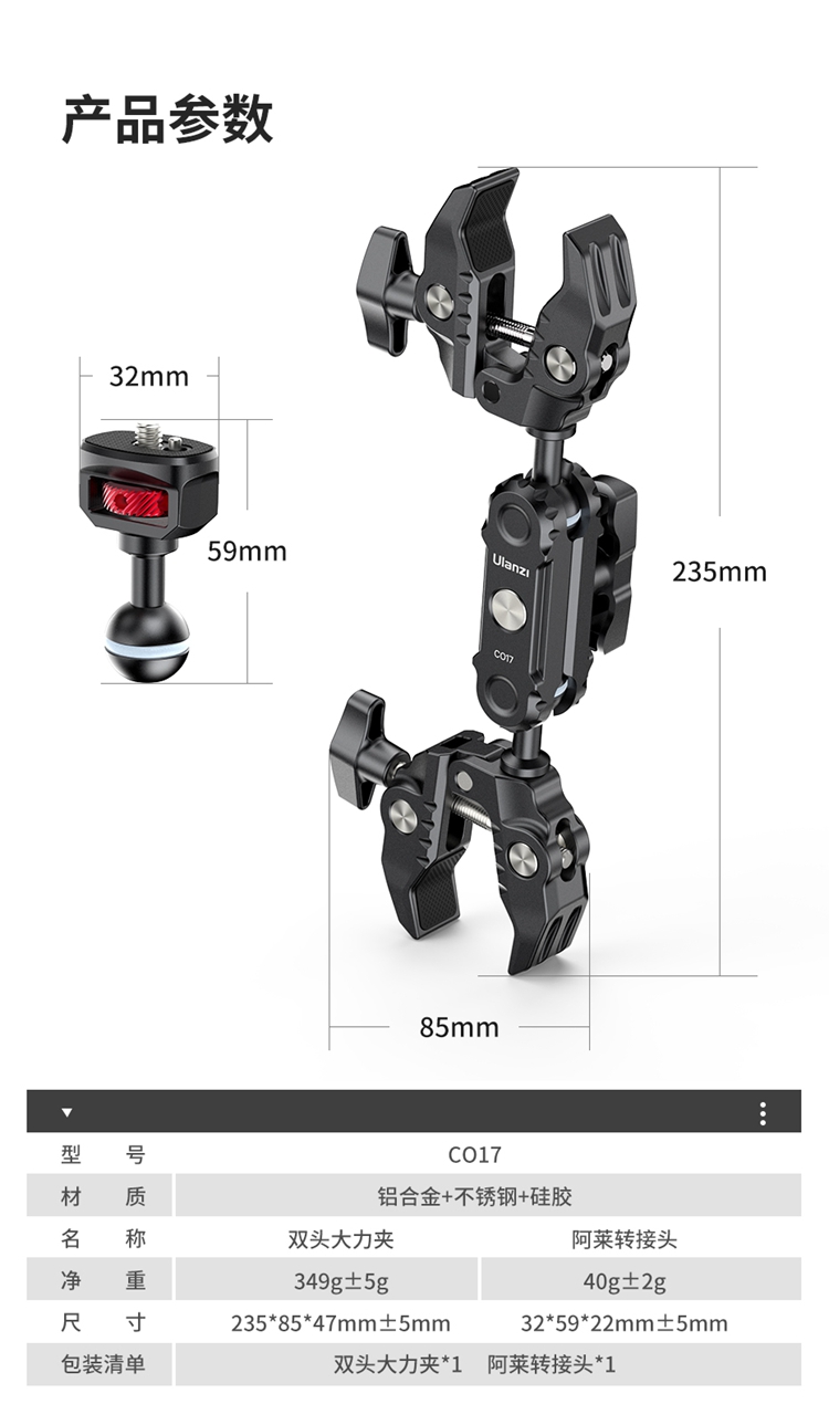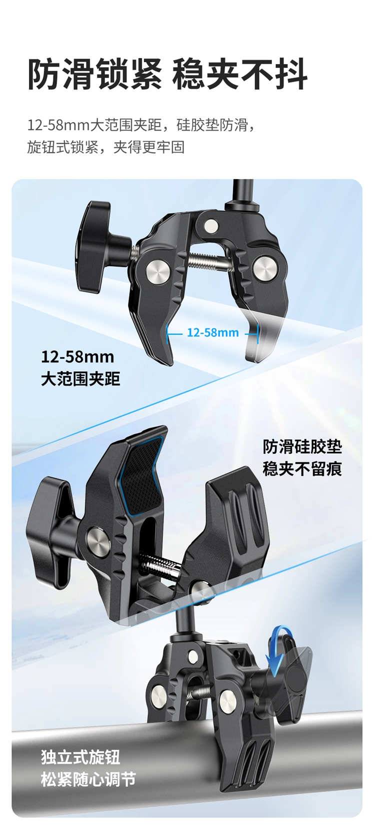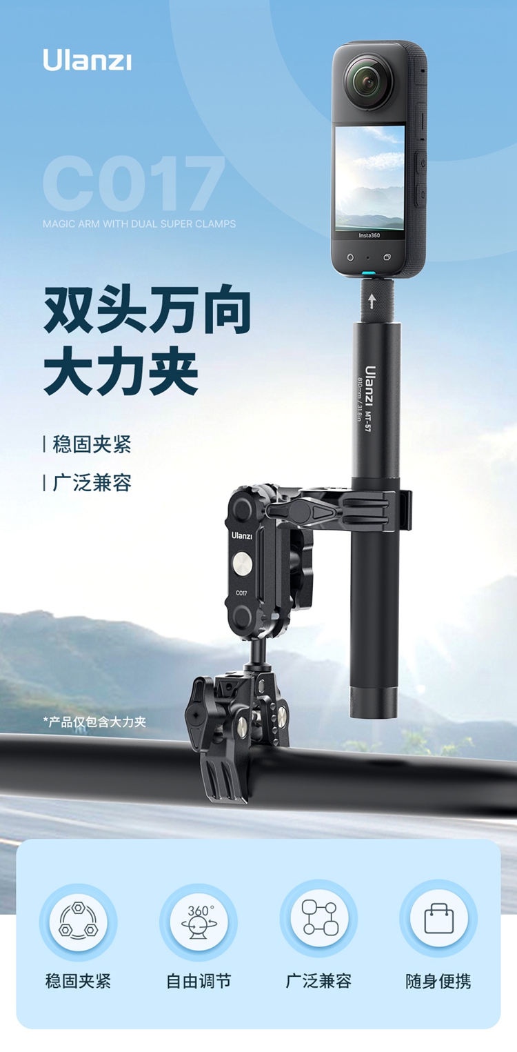 Ulanzi优篮子CO17双头万向大力夹适用Gopro运动相机手机摩托车骑行蟹钳夹insta360骑行夹action3/4支架配件