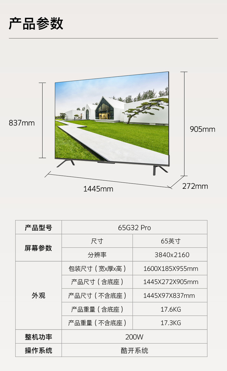 创维(SKYWORTH)65G32 Pro 65英寸 4K超高清智慧屏 护眼超薄全面屏 声控液晶智能电视机