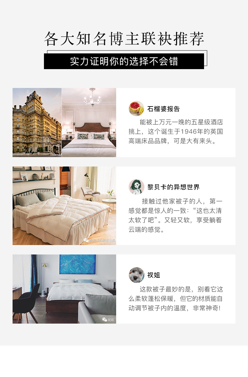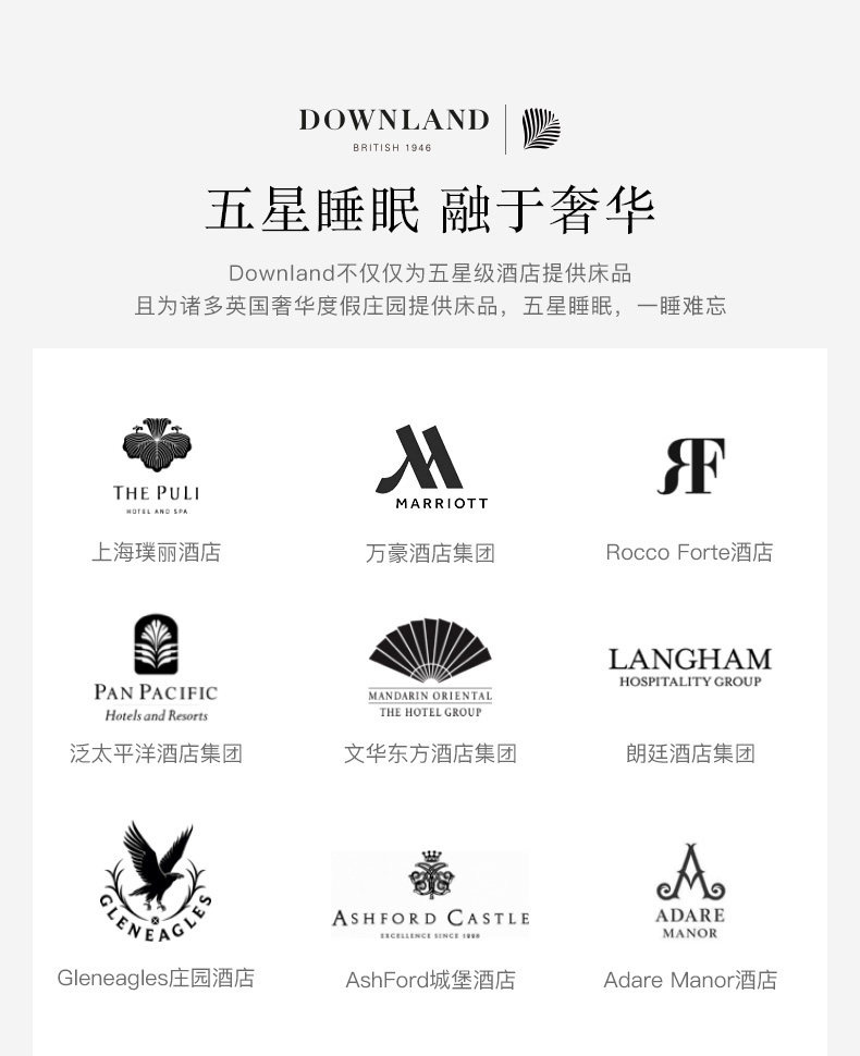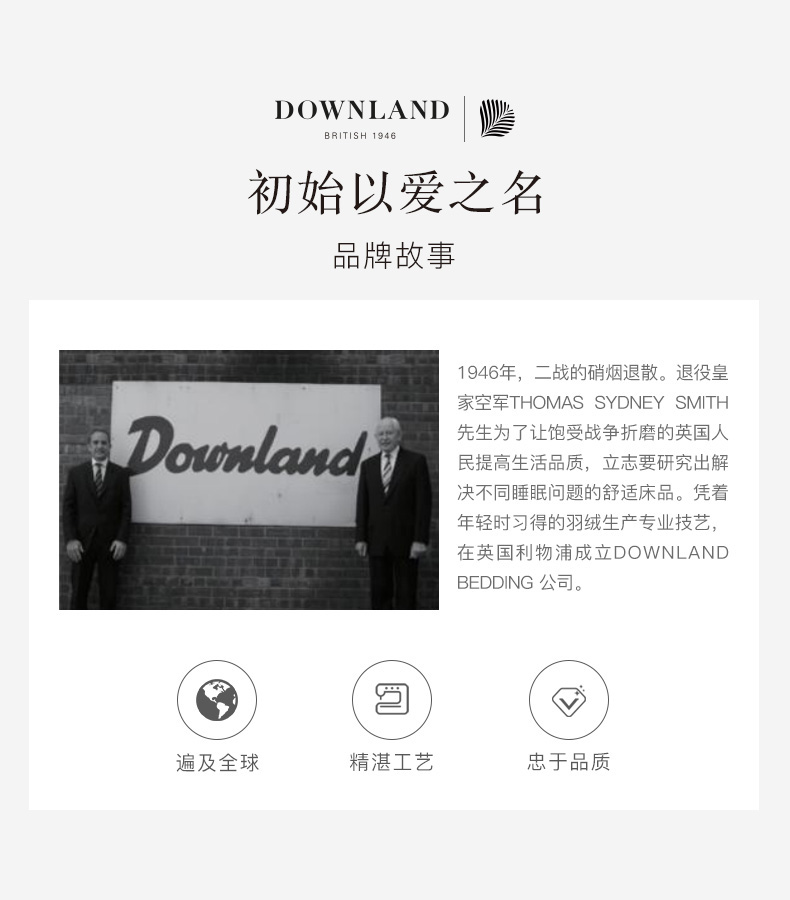 凭借年轻时掌握的羽绒制作手艺,他坚信,一场好的睡眠对「人的自我修复」有着至关重要的意义,通过优质的睡眠产品,DOWNLAND为更多饱受战后睡眠障碍困扰的同胞提供「良好睡眠」的解决方案。如今DOWANLAND已成为英国四大顶级床品之一。