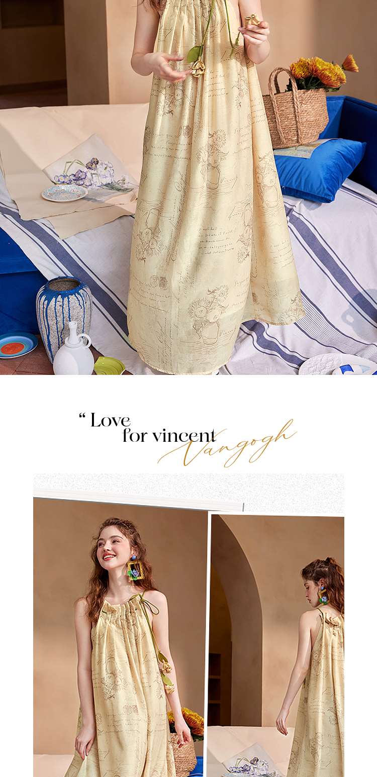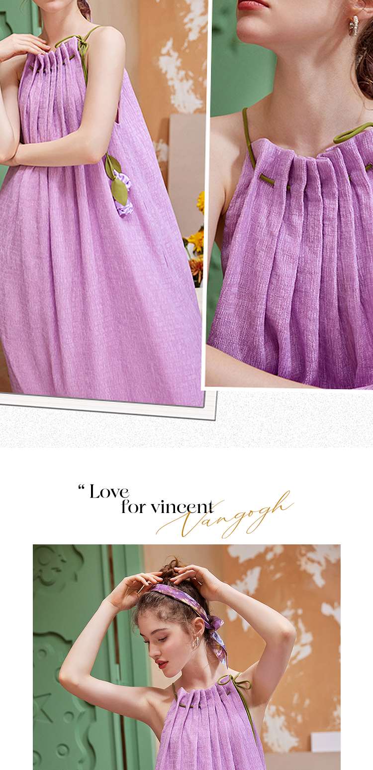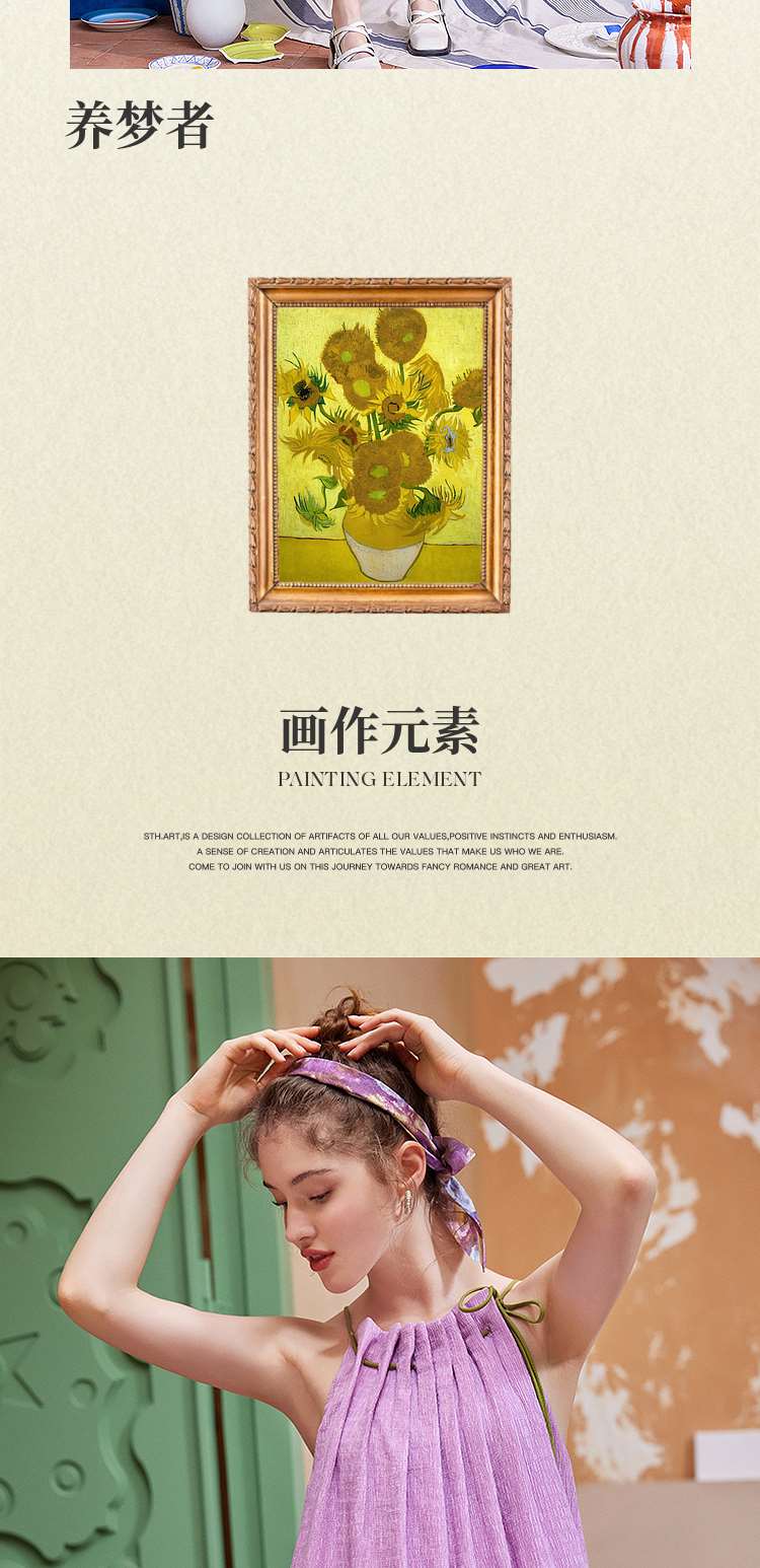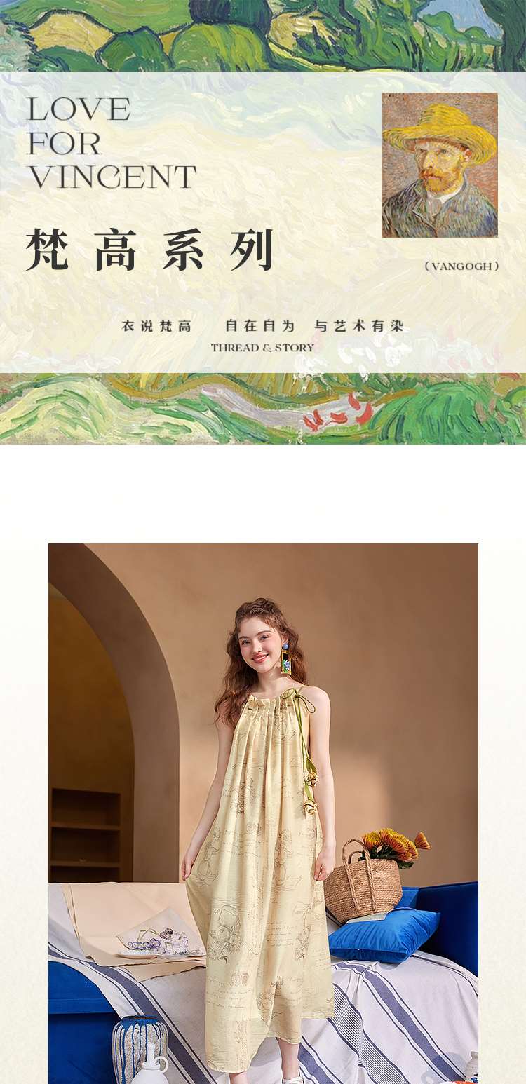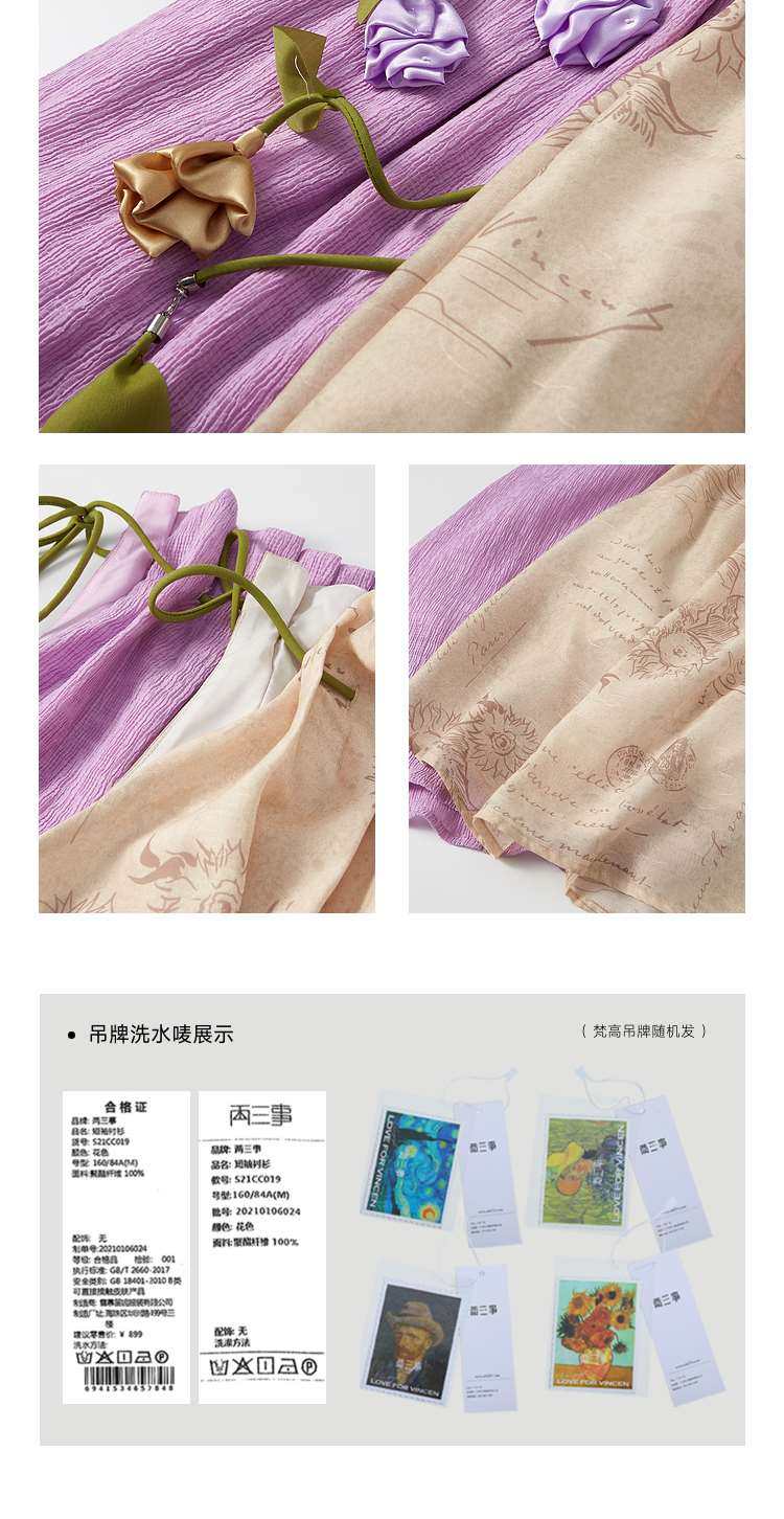 两三事梵高艺术养梦者夏季新款立体花朵绑带压褶吊带连衣裙