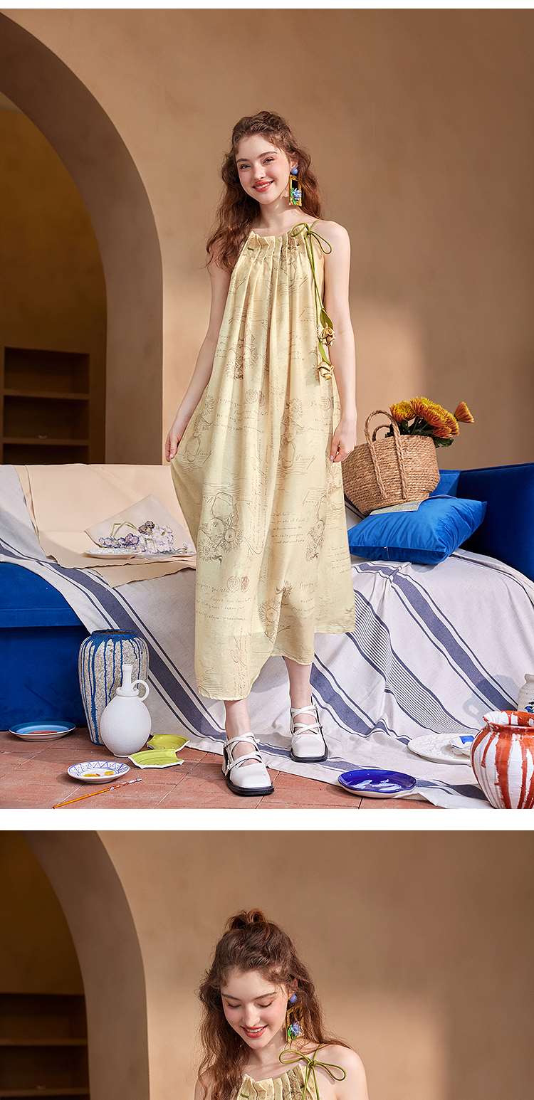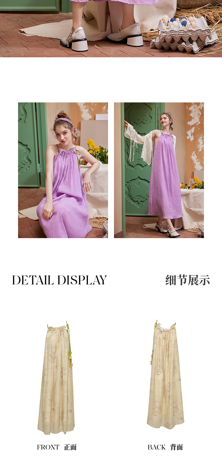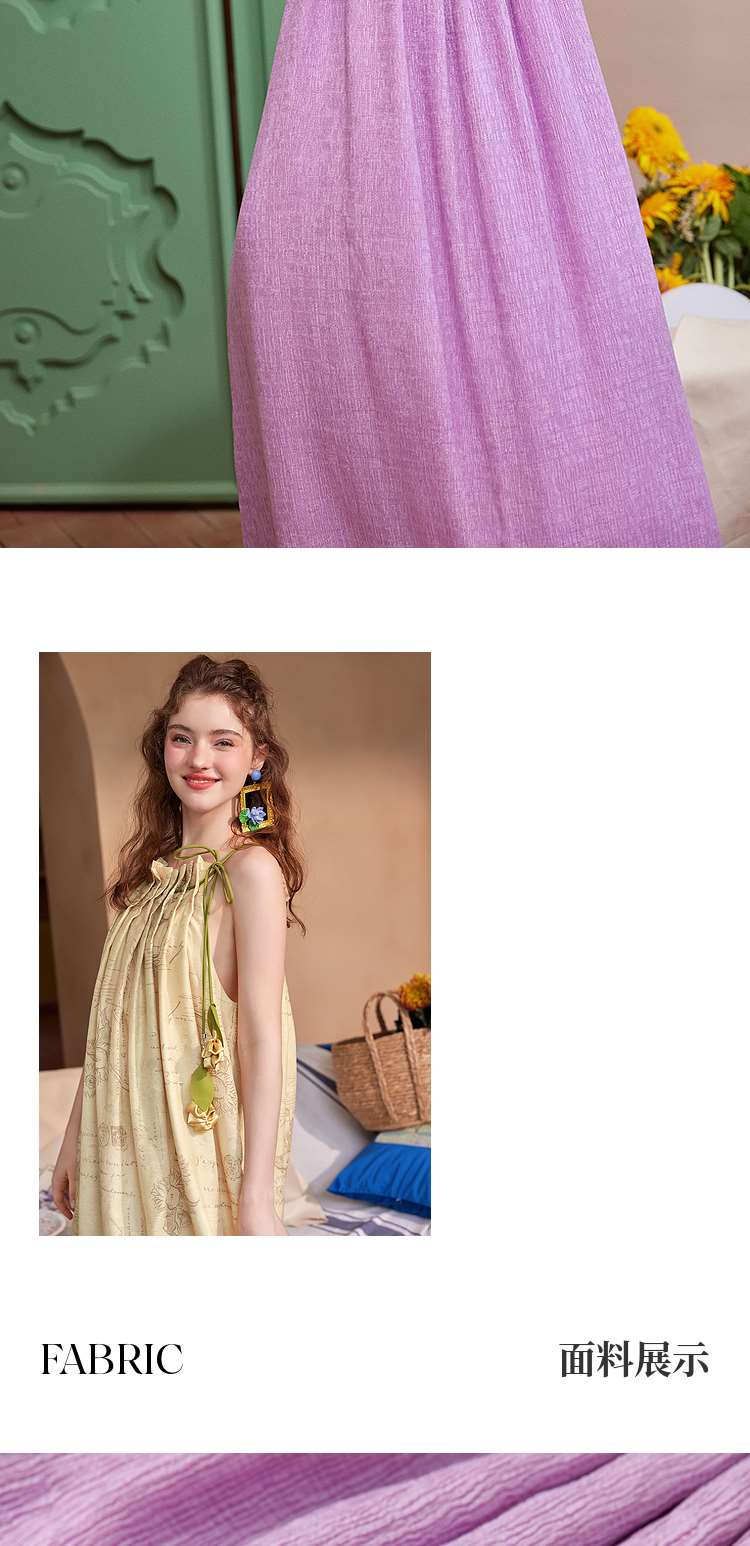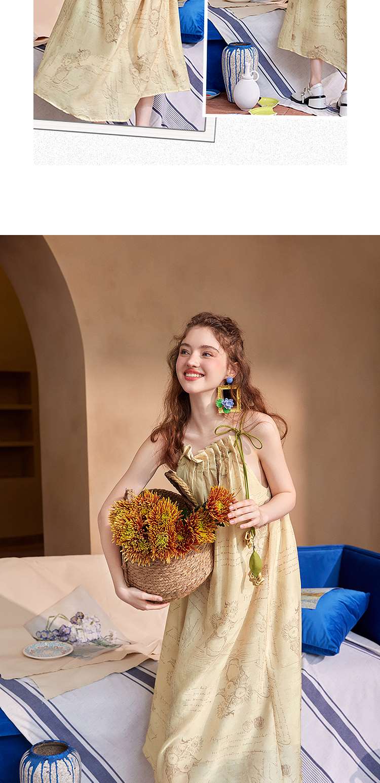 两三事梵高艺术养梦者夏季新款立体花朵绑带压褶吊带连衣裙
