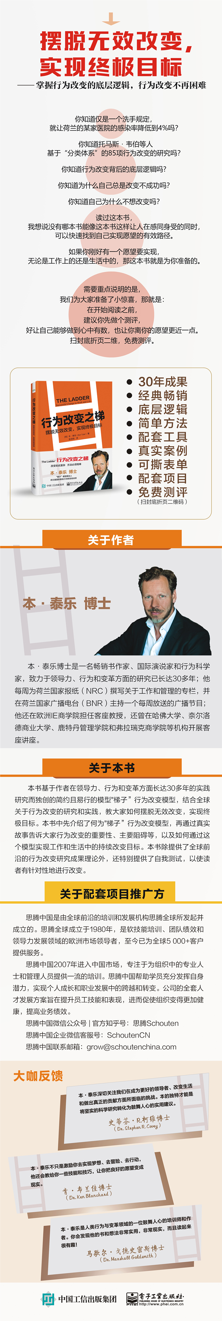 本书基于作者在领导力、行为和变革方面长达30多年的实践研究而*创的简约且易行的模型——"梯子”行为改变模型,结合全球关于行为改变的研究和实践,教大家如何摆脱无效改变,实现终*目标。本书中先介绍了何为"梯子”行为改变模型,再通过真实故事告诉大家行为改变的重要性、主要阻碍等,以及如何通过这个模型实现工作和生活中的持续改变目标。本书除提供了全球前沿的行为改变研究成果理论外,还特别提供了自我测试,以使读者有针对性地进行改变。