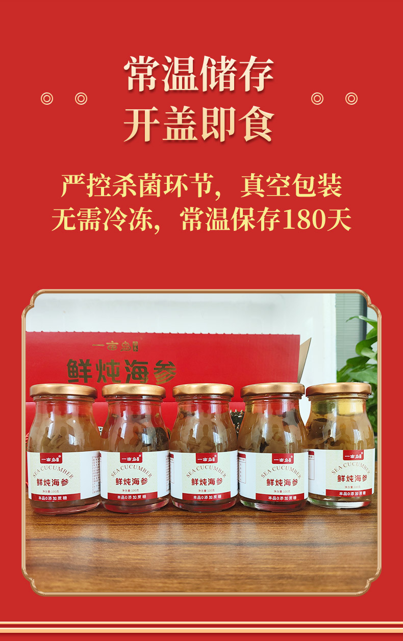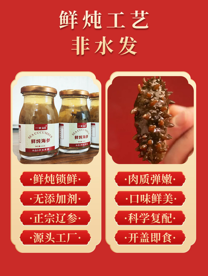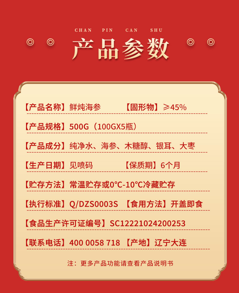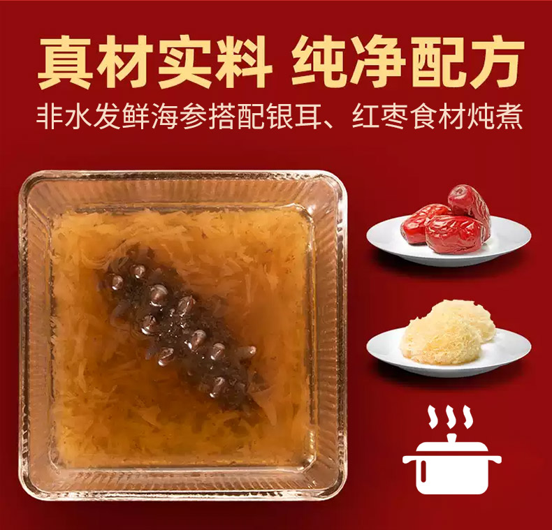 【品名】一亩岛鲜炖海参 【料表】纯净水、海参、木糖醇、银耳、大枣 【固形物】≧45% 【净含量】100克 【食用方法】开盖即食 【保质期】6个月 【储存方法】常温贮存或0℃-10℃冷藏贮存 【发货地】大连 【发货快递】极兔 【不发货区域】港澳台地区不发 【补邮费地区】海南、新疆、西藏+10元 【发货时效】48小时,节假日顺延 |