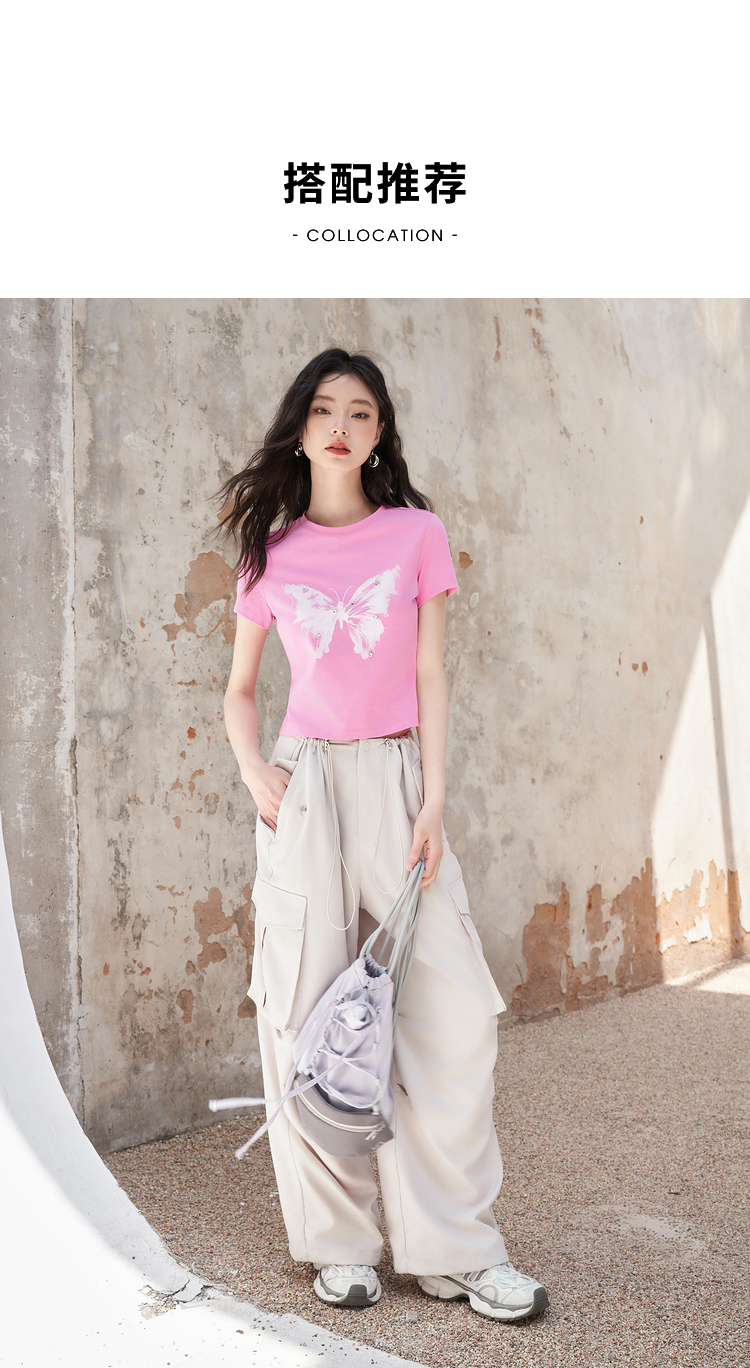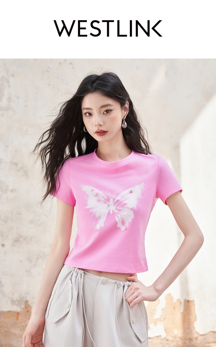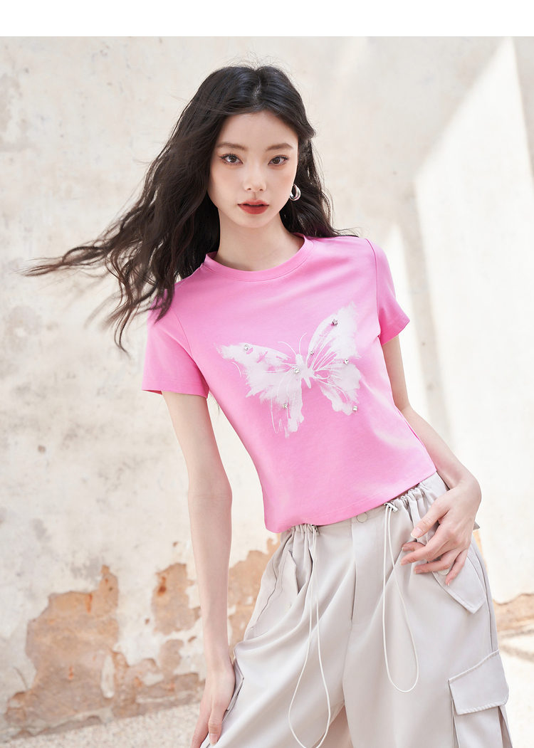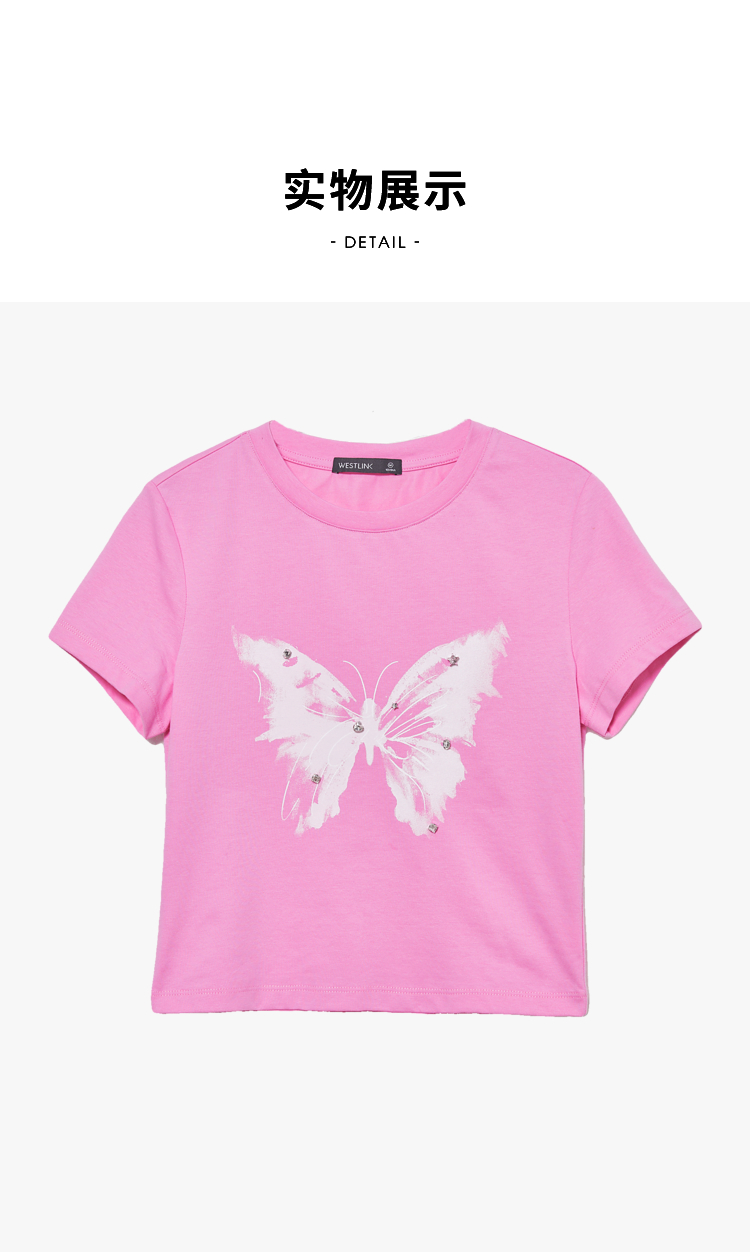 美式复古辣妹蝴蝶印花短袖T恤女春夏季短款修身上衣V0740452