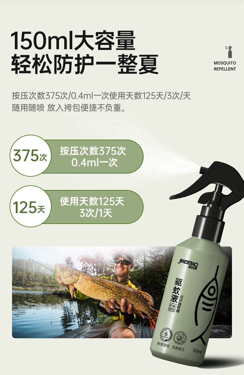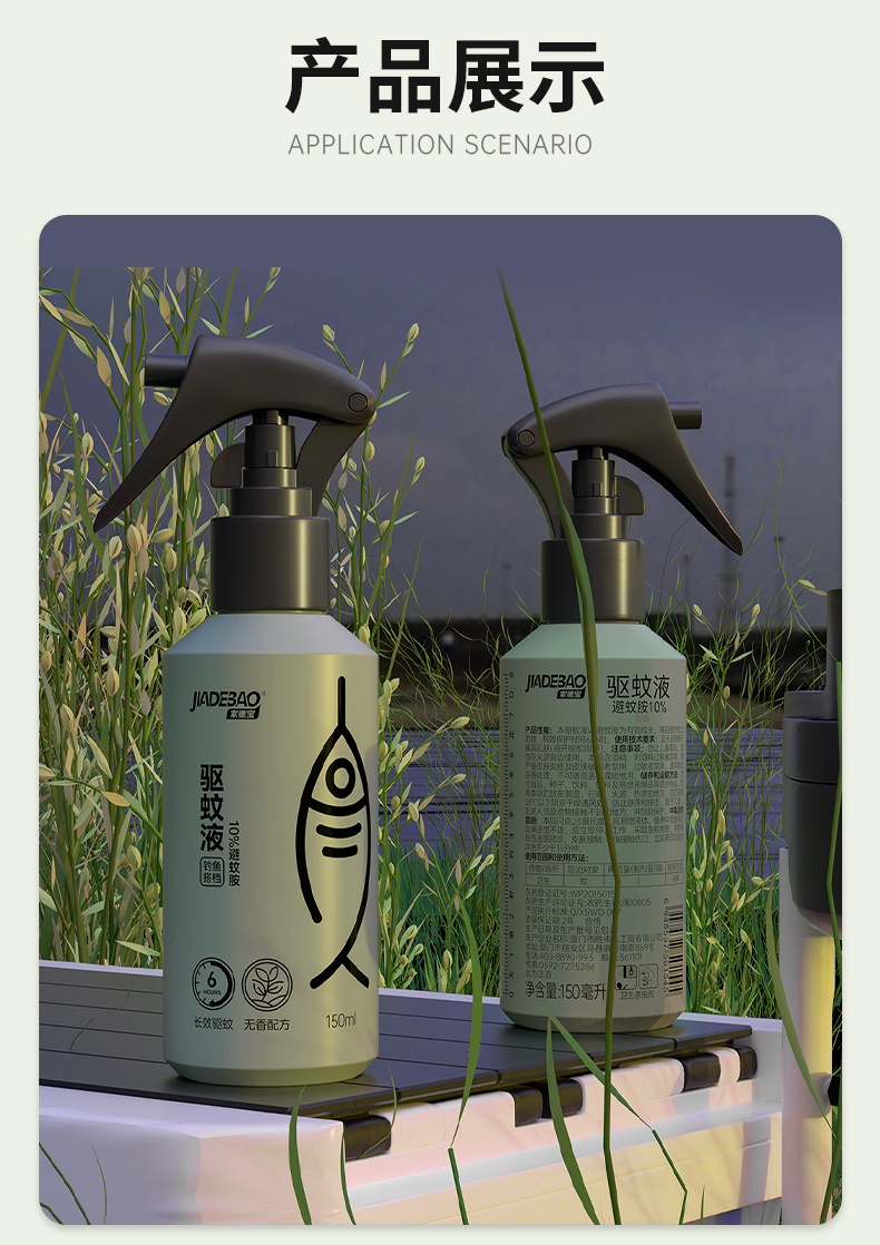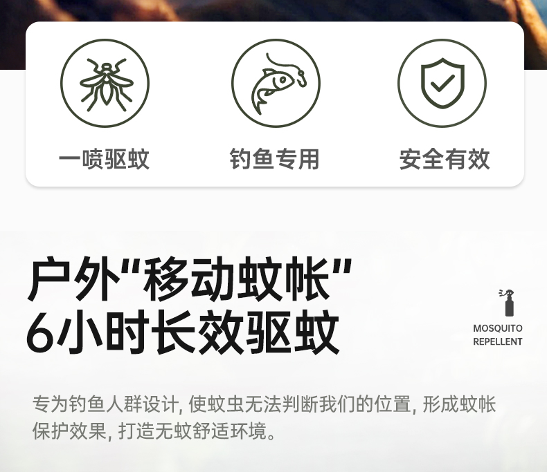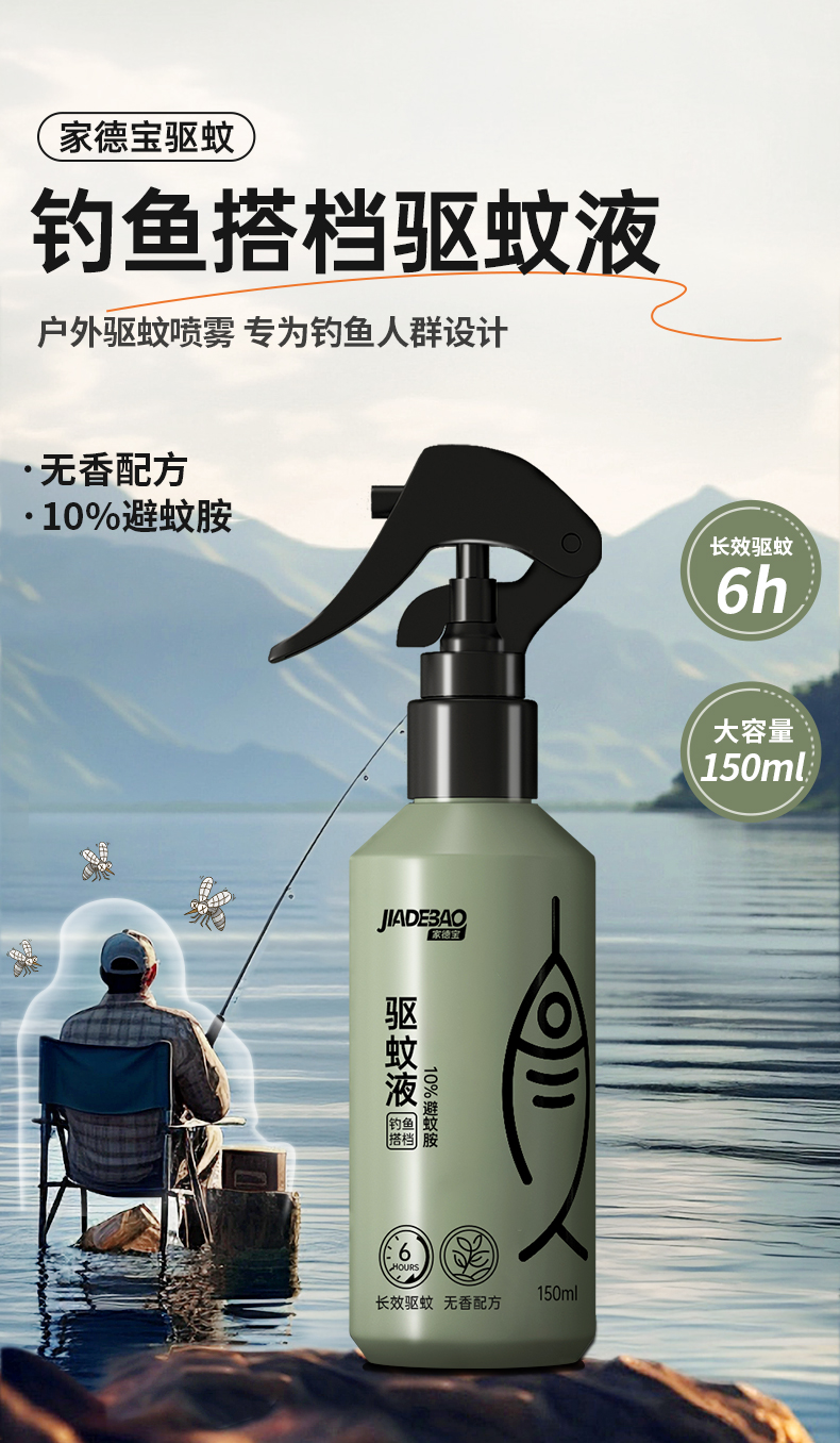 2,户外钓鱼喷雾,针对钓鱼人群全新研发无香型设计,不影响钓鱼适口性,温和不刺激,清爽不油腻。