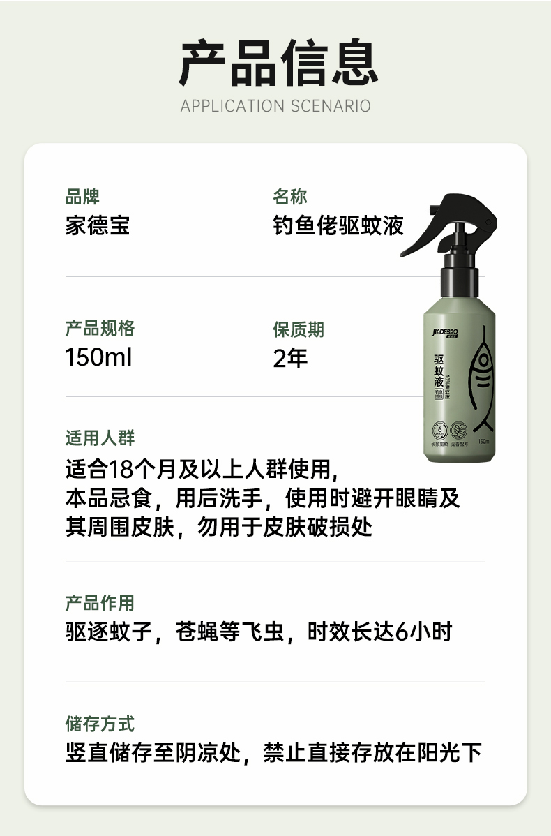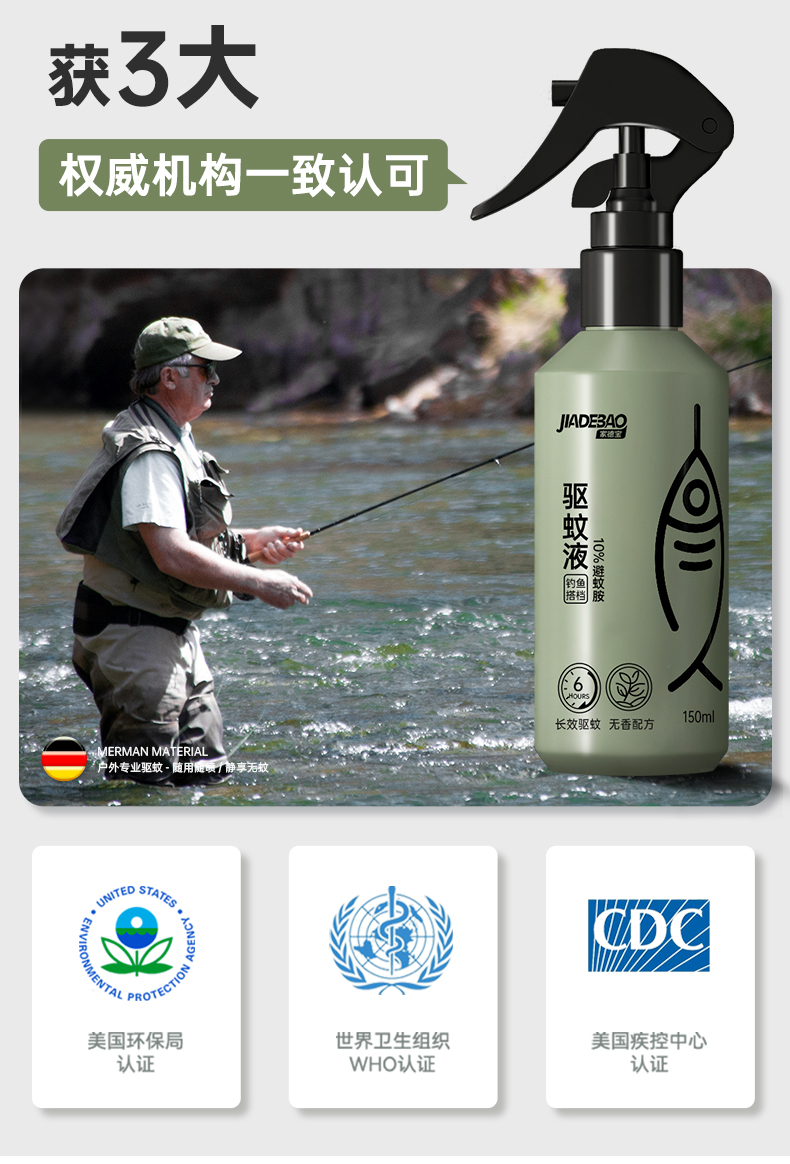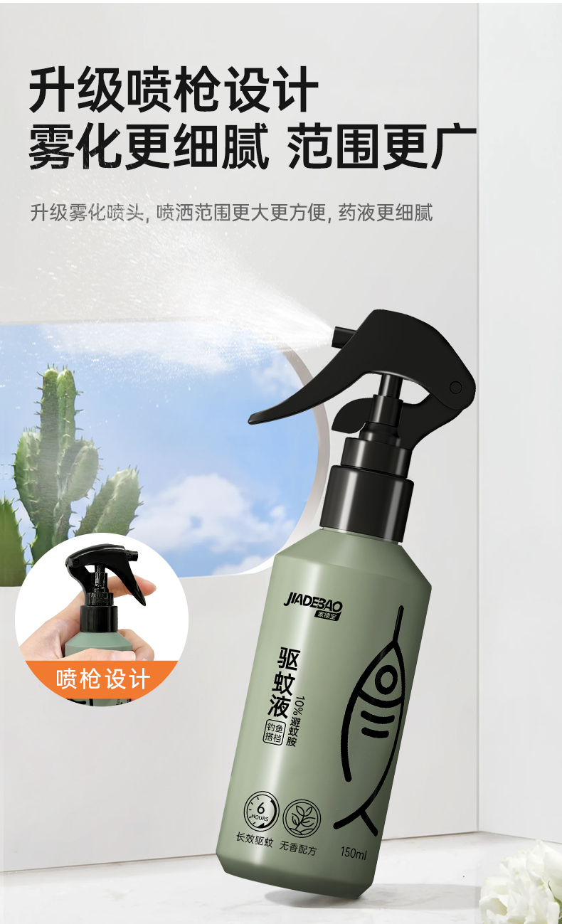 2,户外钓鱼喷雾,针对钓鱼人群全新研发无香型设计,不影响钓鱼适口性,温和不刺激,清爽不油腻。