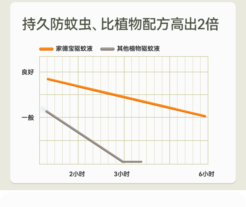 3,实现6小时持久防蚊,无惧蚊虫,比植物配方高两倍的贴心保护。