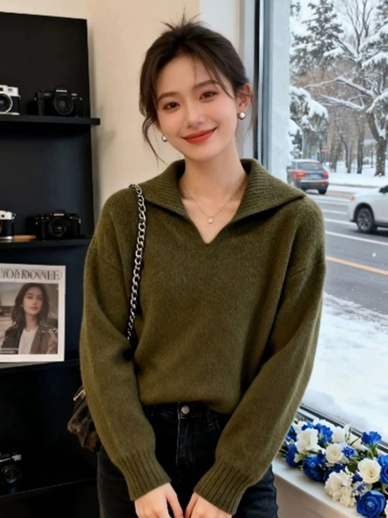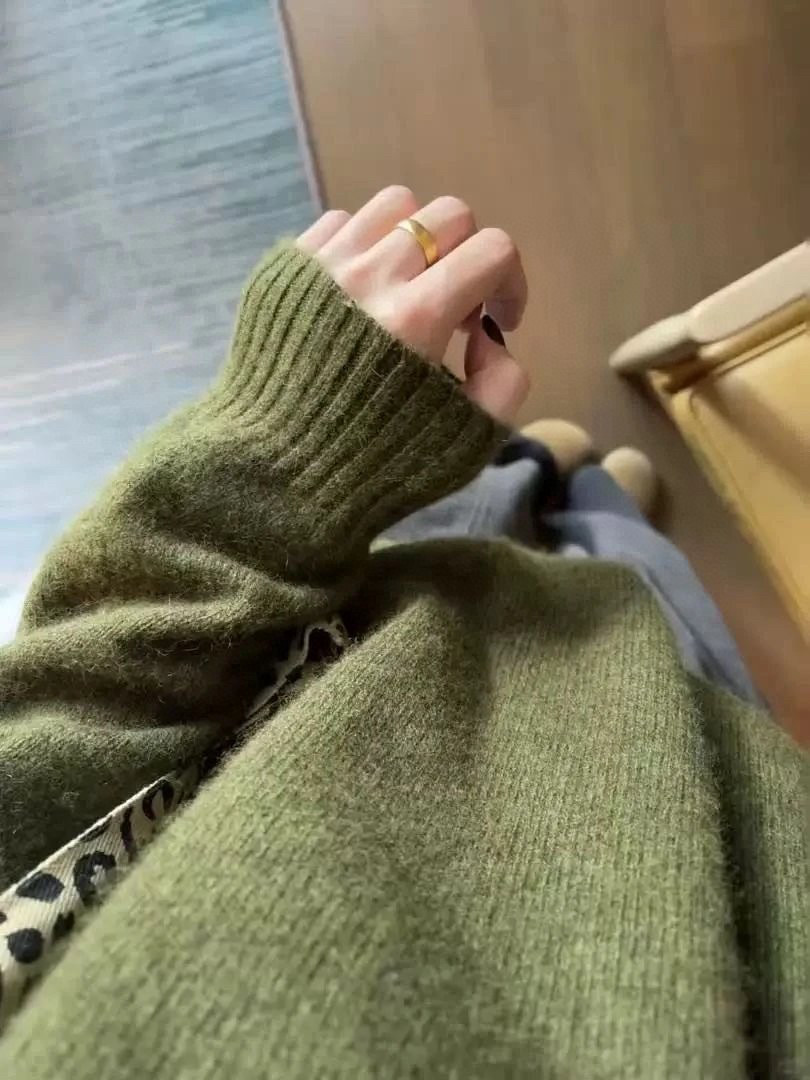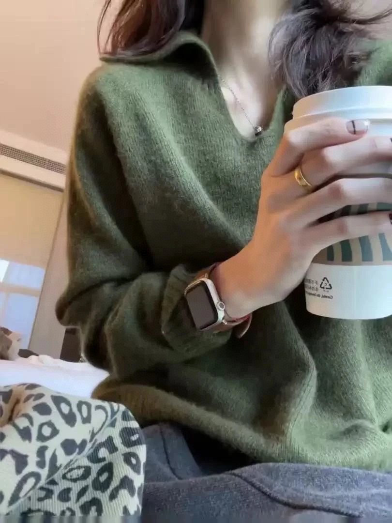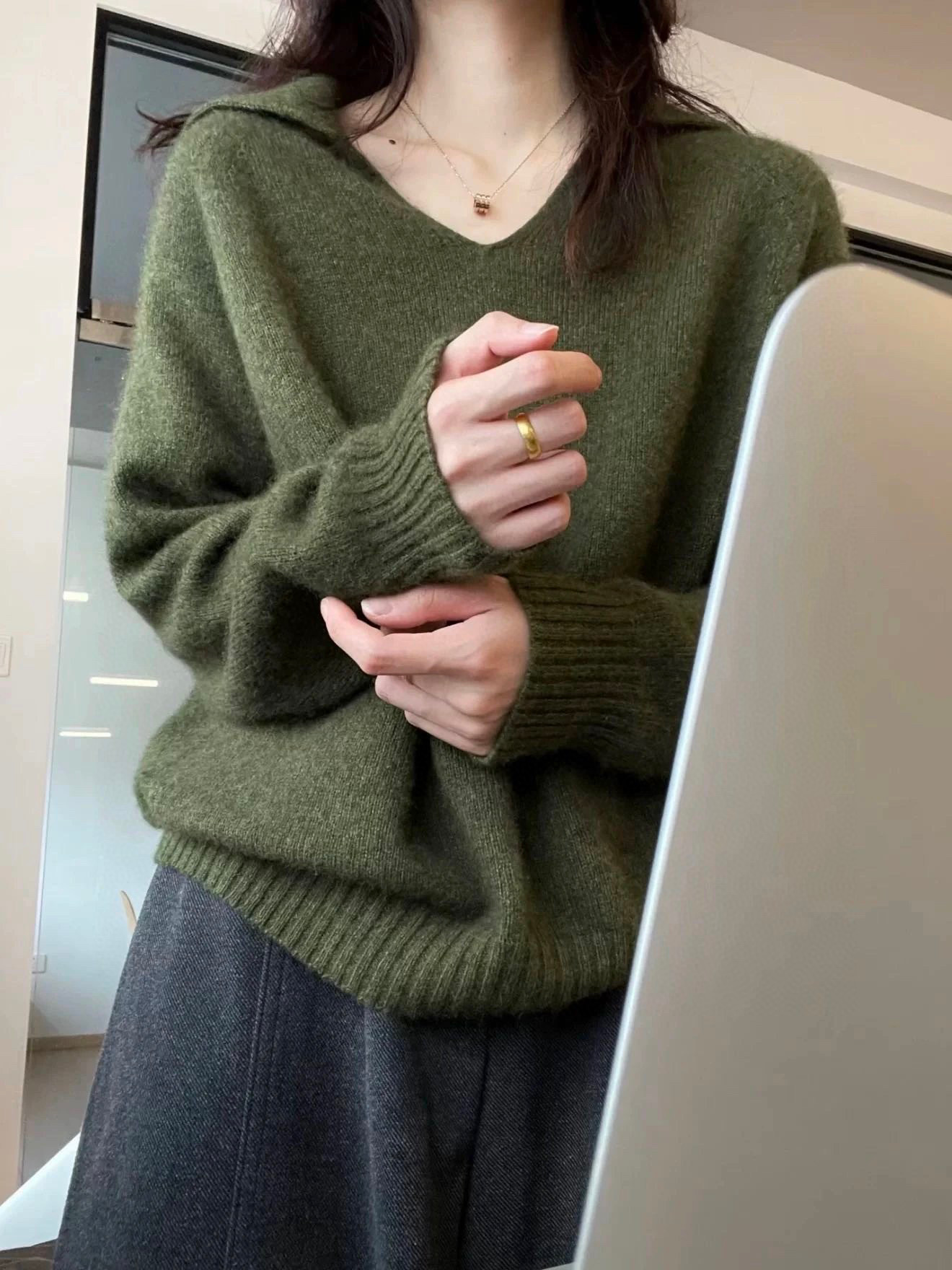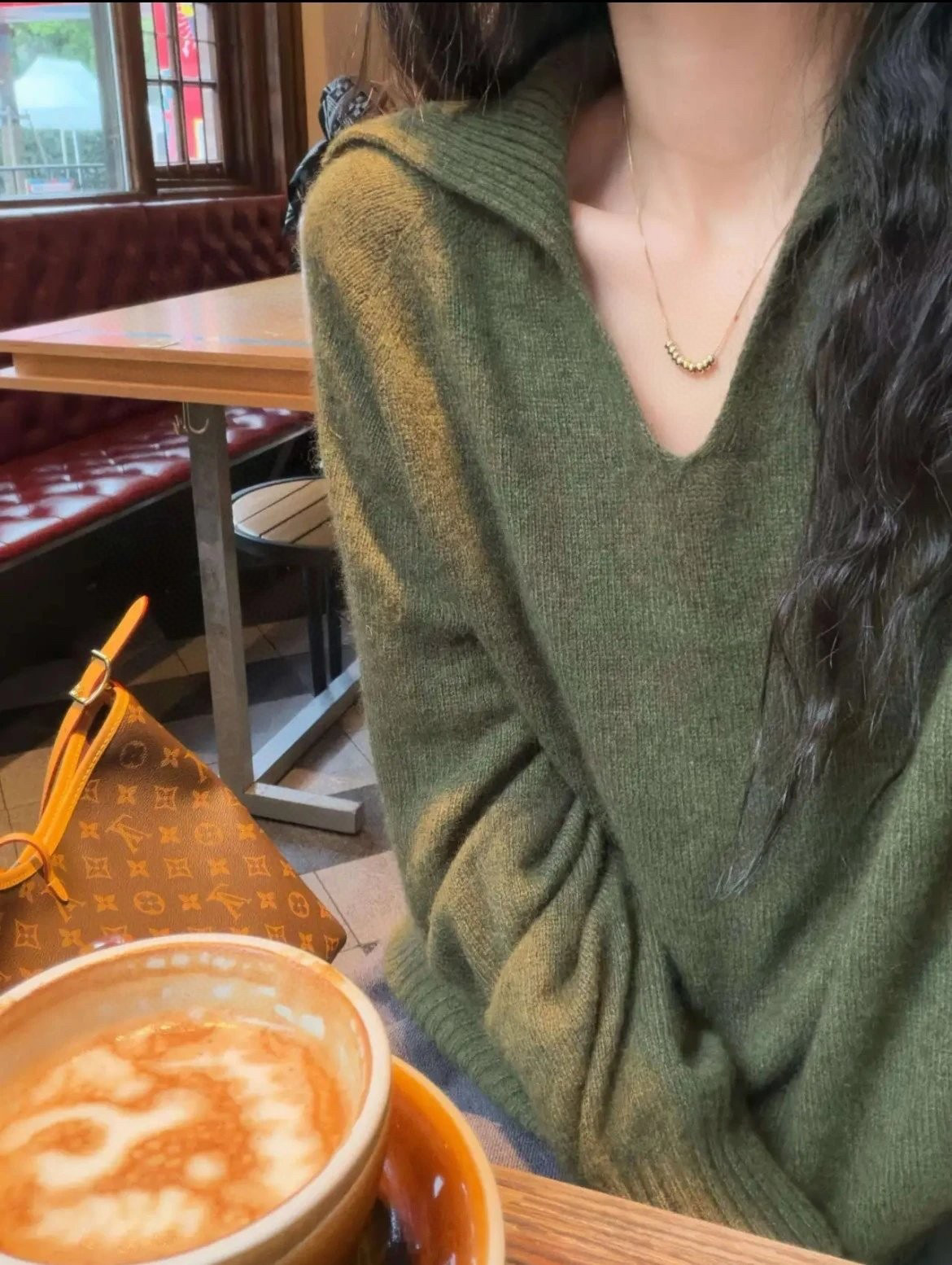 💰109元包邮 【JS3699142】 显白苔藓绿 V翻领针织毛衣 浓郁复古衬肤色 这抹苔藓绿, 是自带冷白皮滤镜的色调, 黄皮上身也能衬出通透好气色