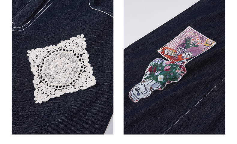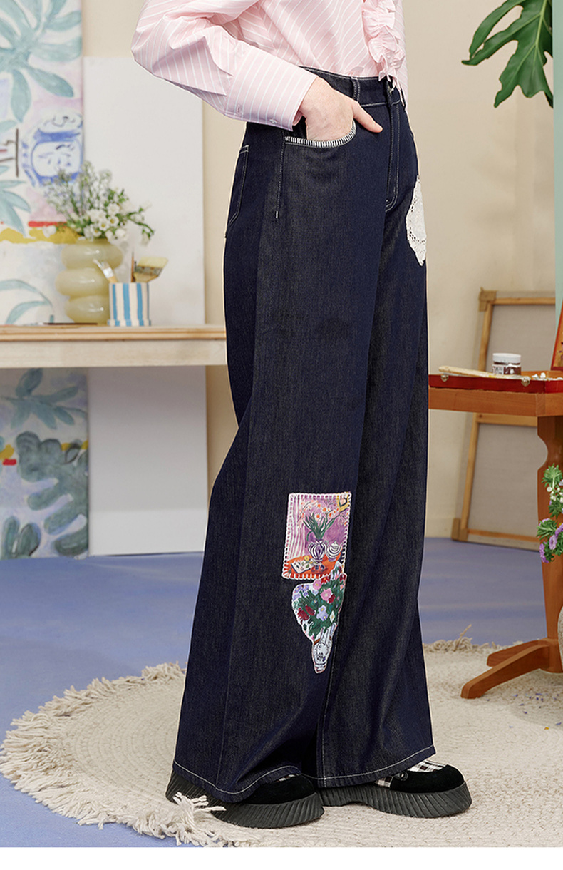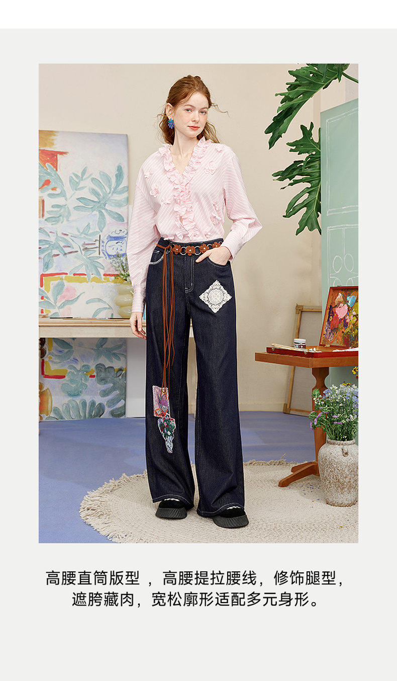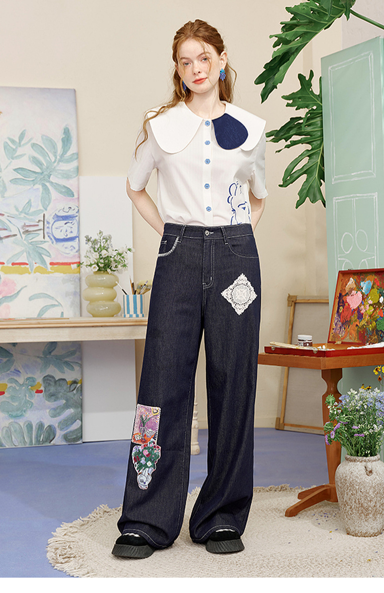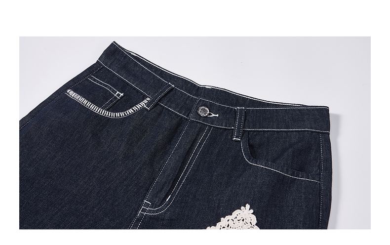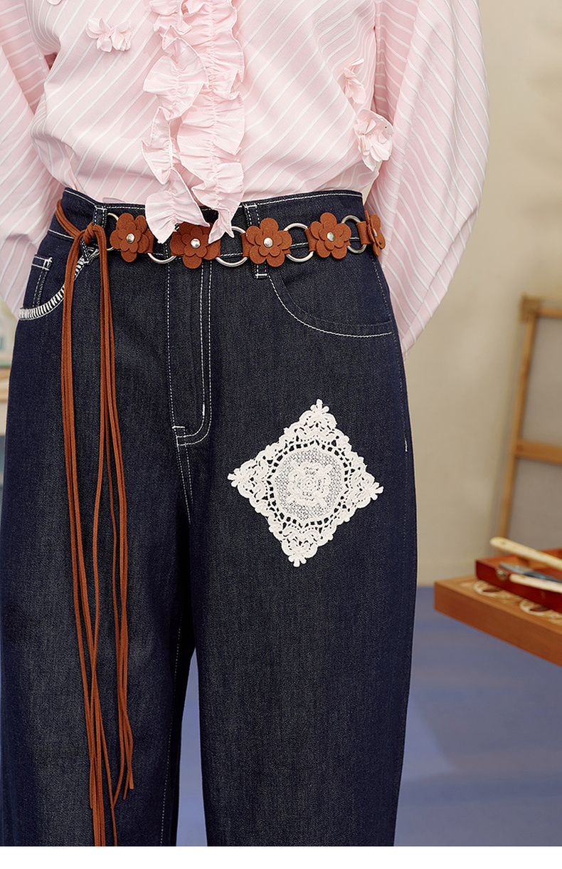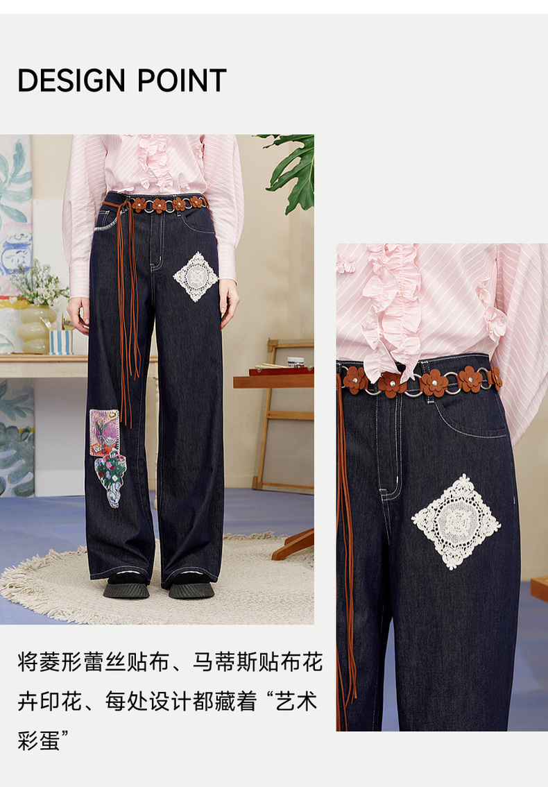 两三事 深蓝追忆 2025夏季新款森女风印花蕾丝贴布直筒牛仔裤女