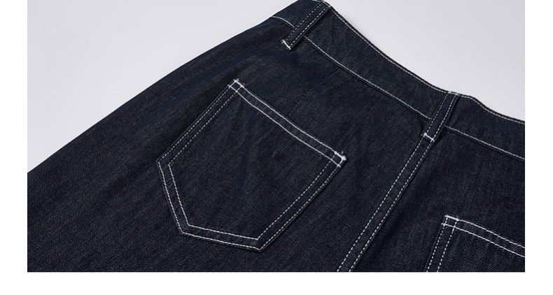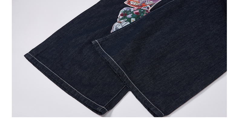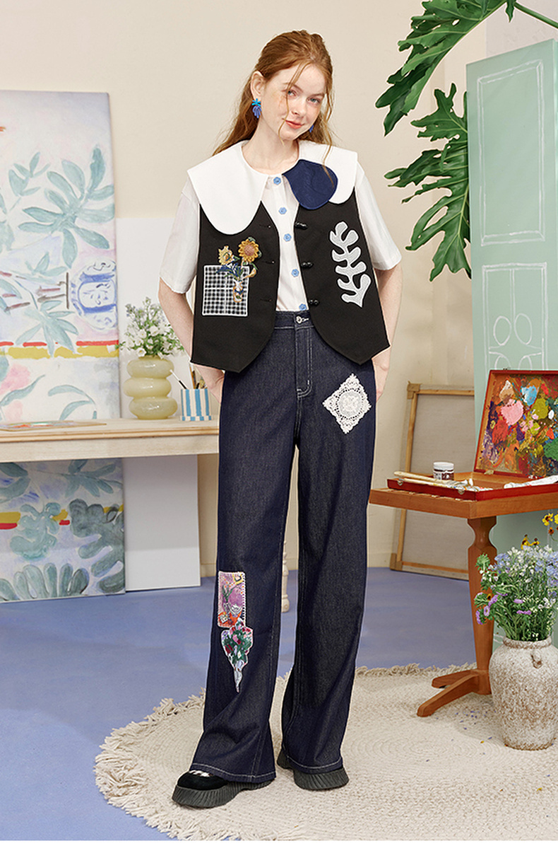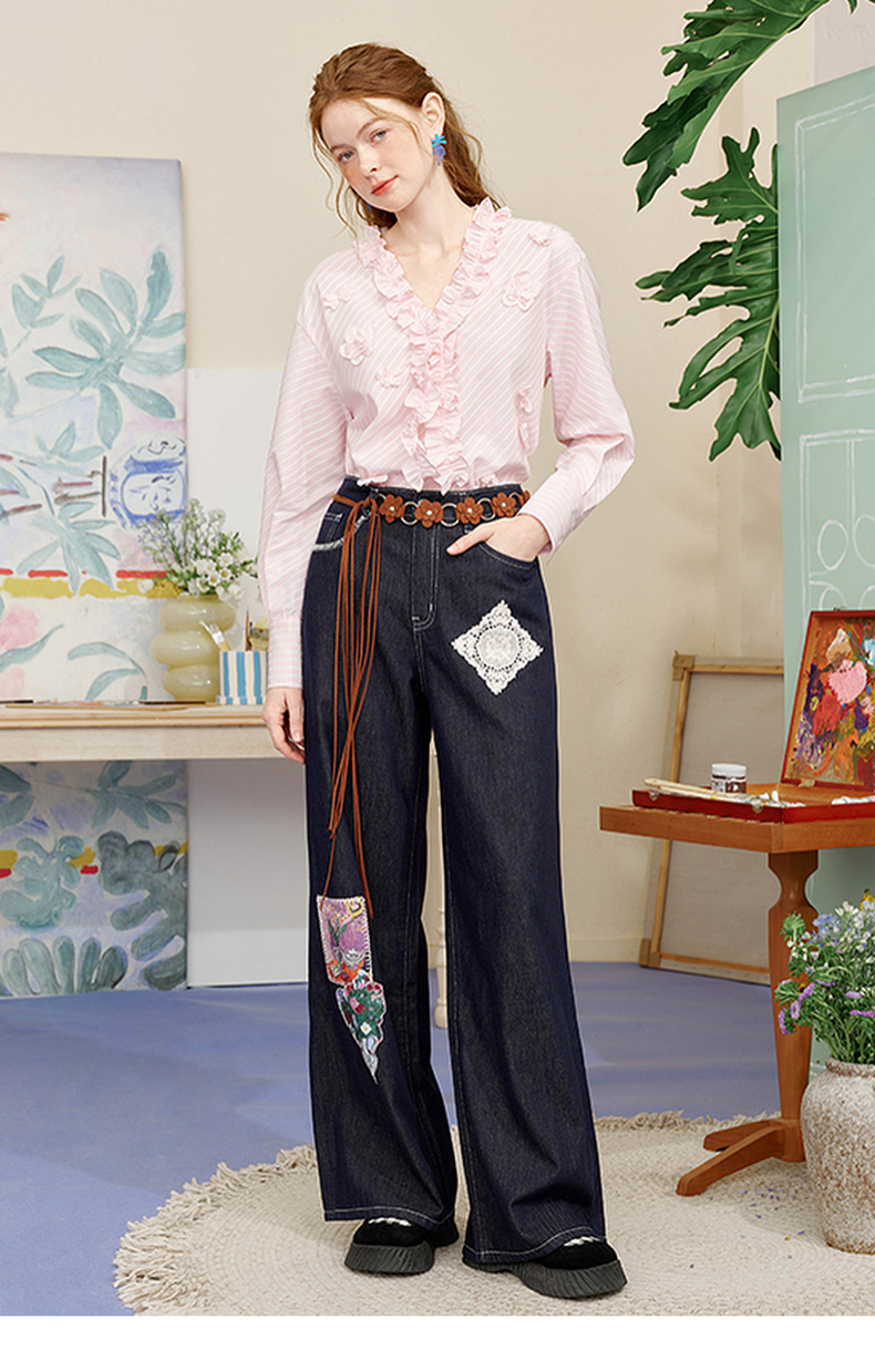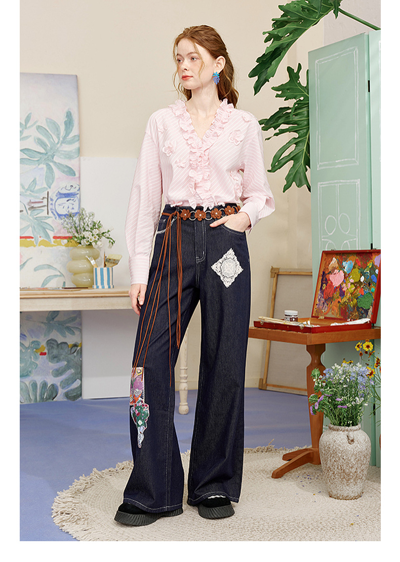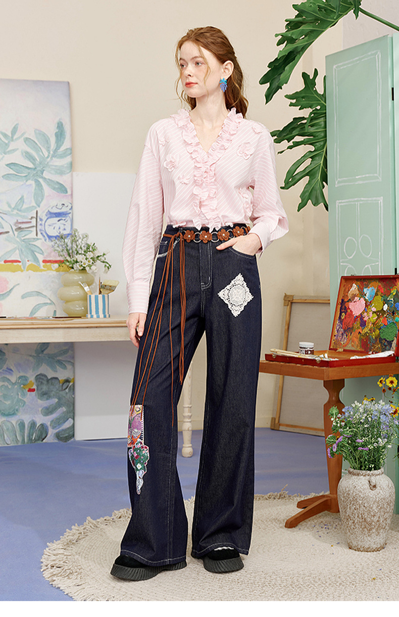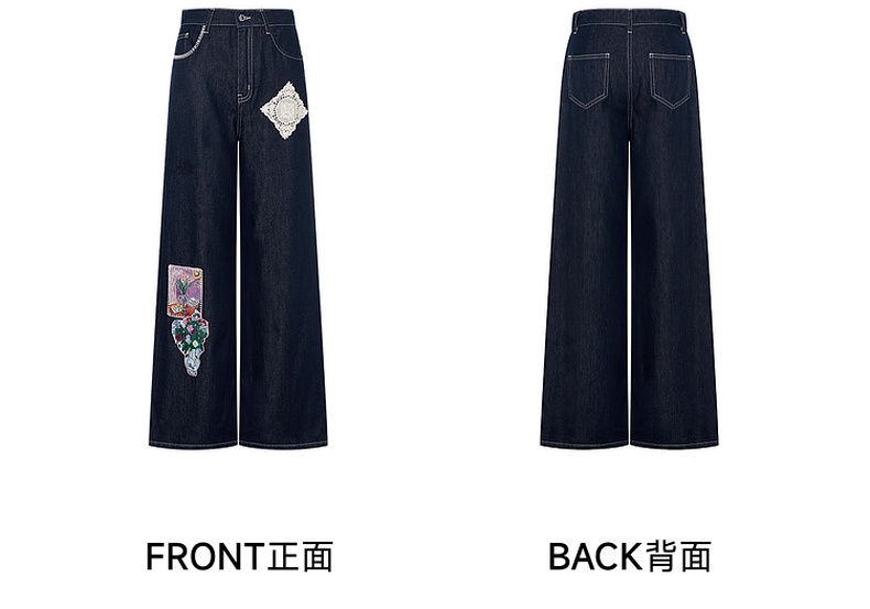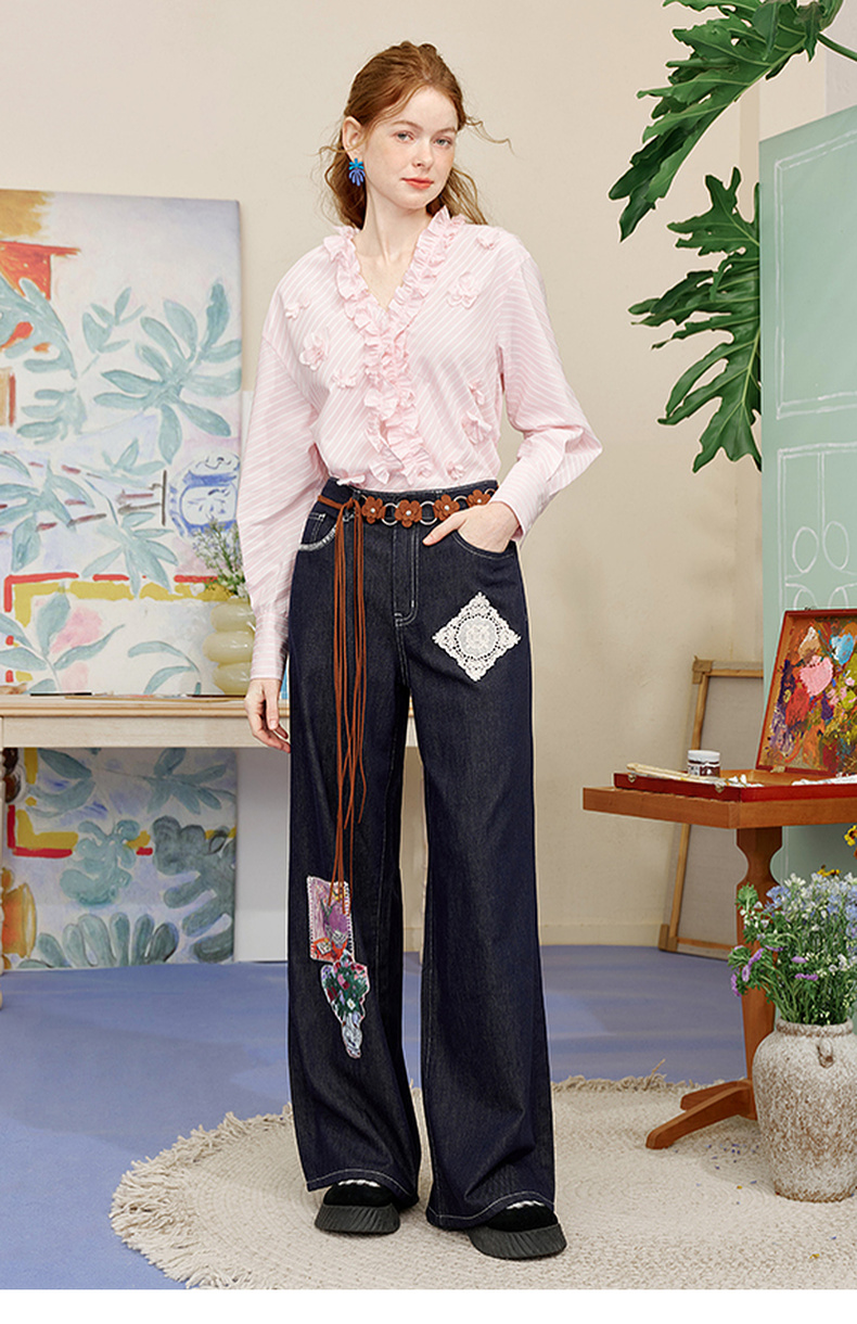 两三事 深蓝追忆 2025夏季新款森女风印花蕾丝贴布直筒牛仔裤女