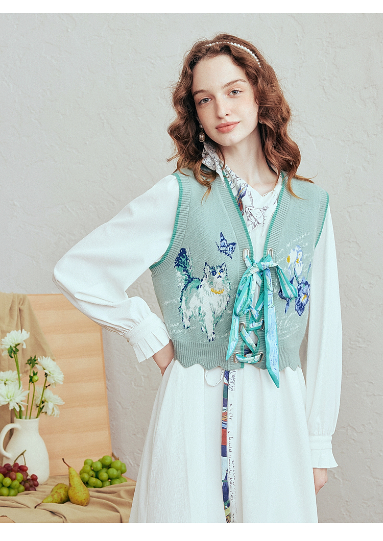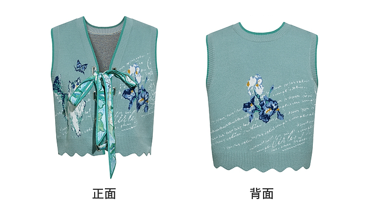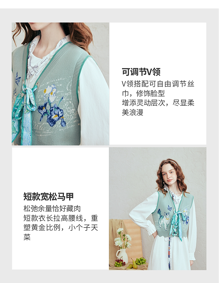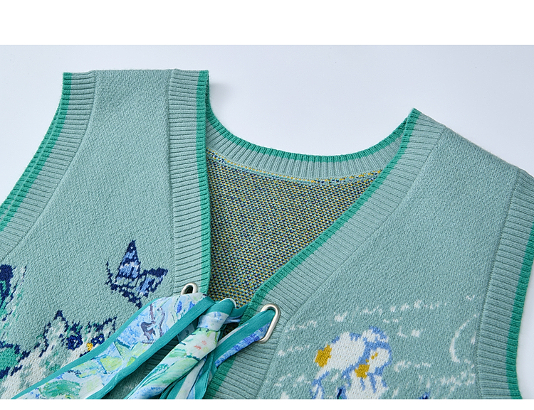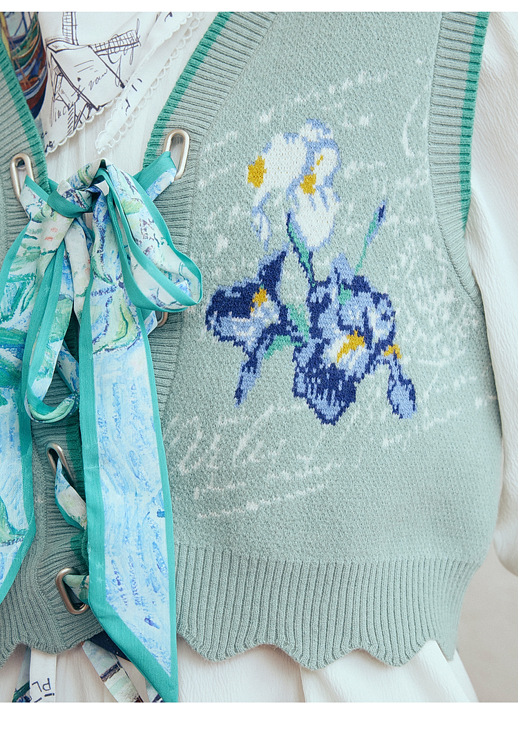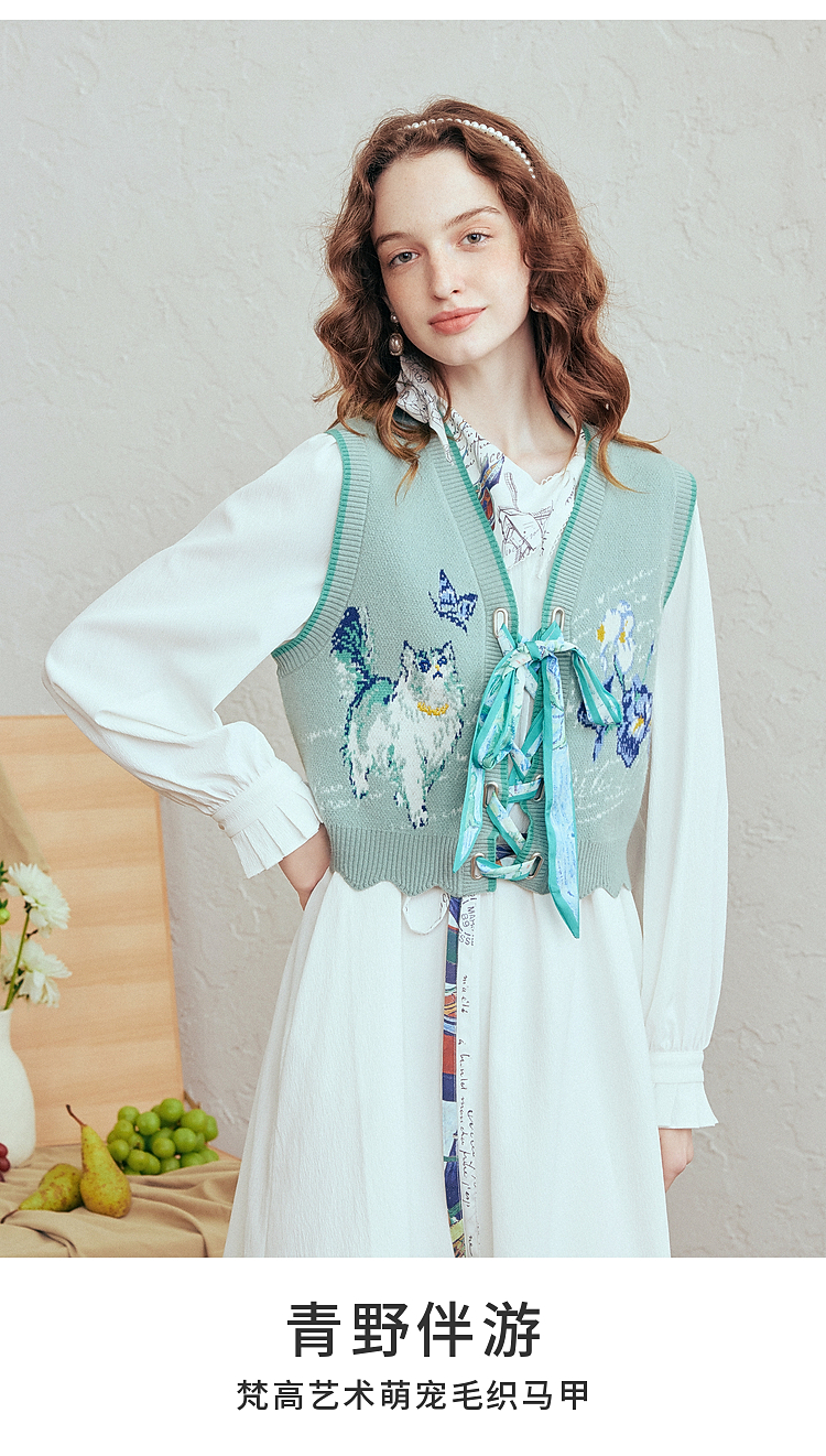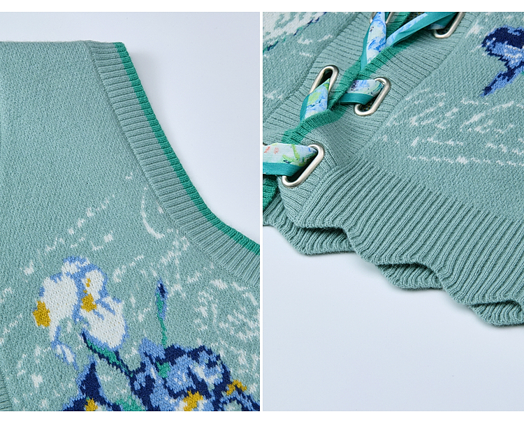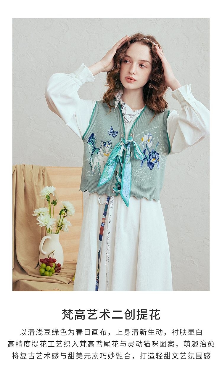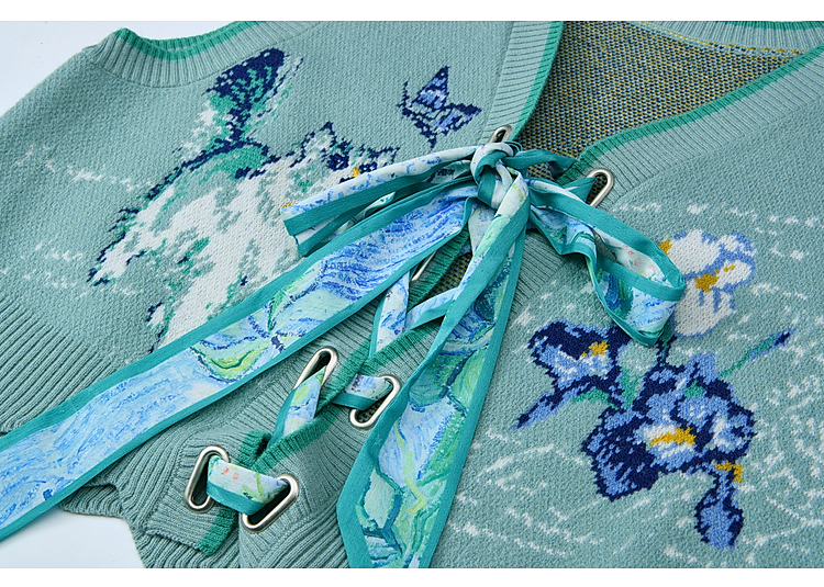 两三事梵高文艺青野伴游2026春季新款小清新印花绑带提花针织衫女