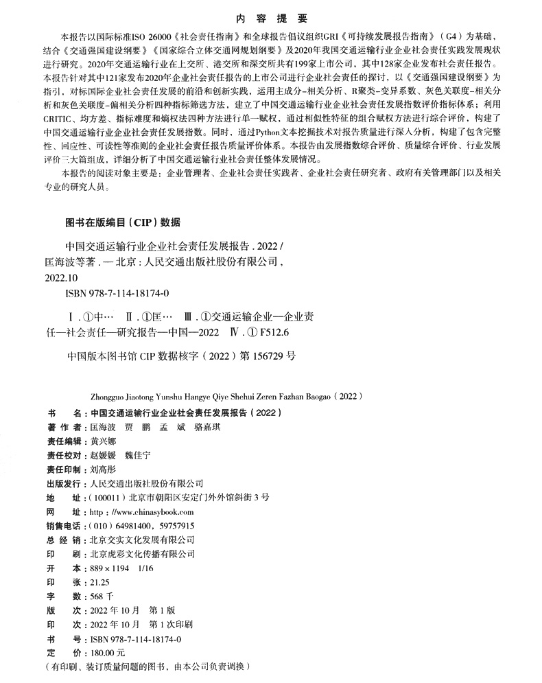 书名:中国交通运输行业企业社会责任发展报告(2022)