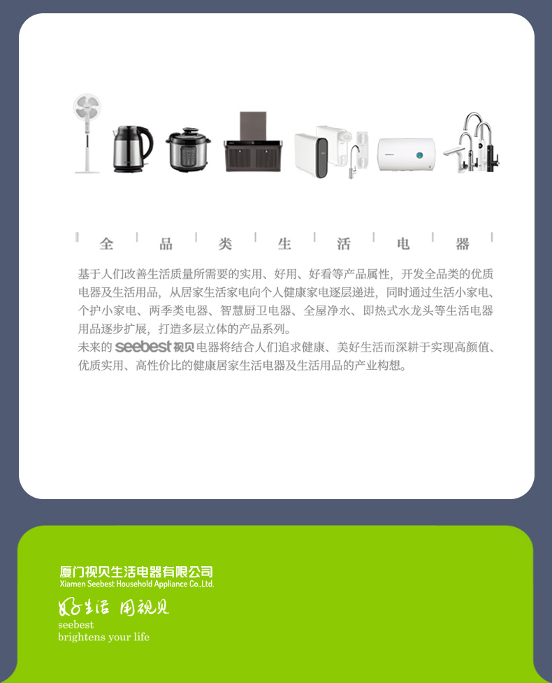 厦门视贝科技有限公司是集产品自主设计,研发,生产,销售于一体的高科技企业。拥有80000平方米的制造厂房,核心员工2000多人。产品线涵盖照明、电工,卫浴,线路,集成风暖等领域。