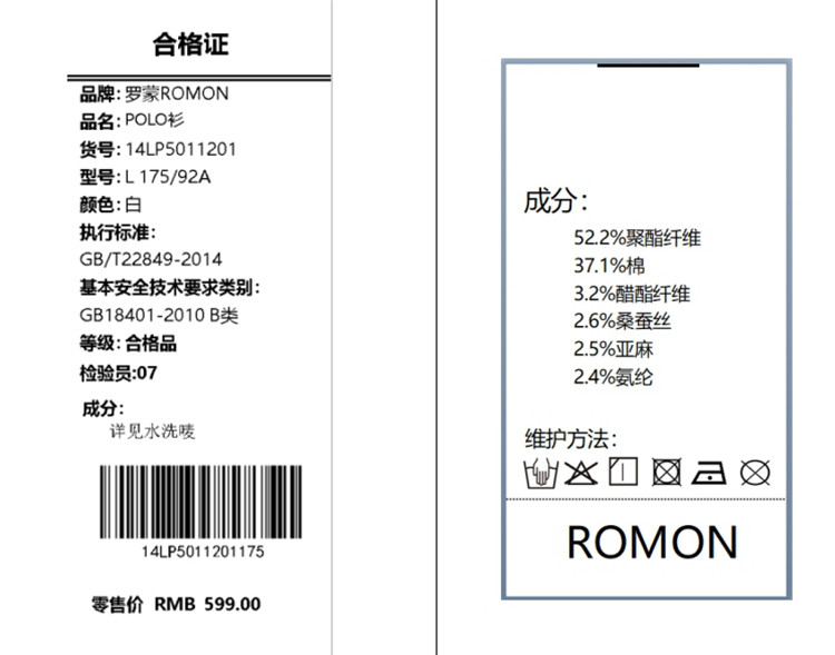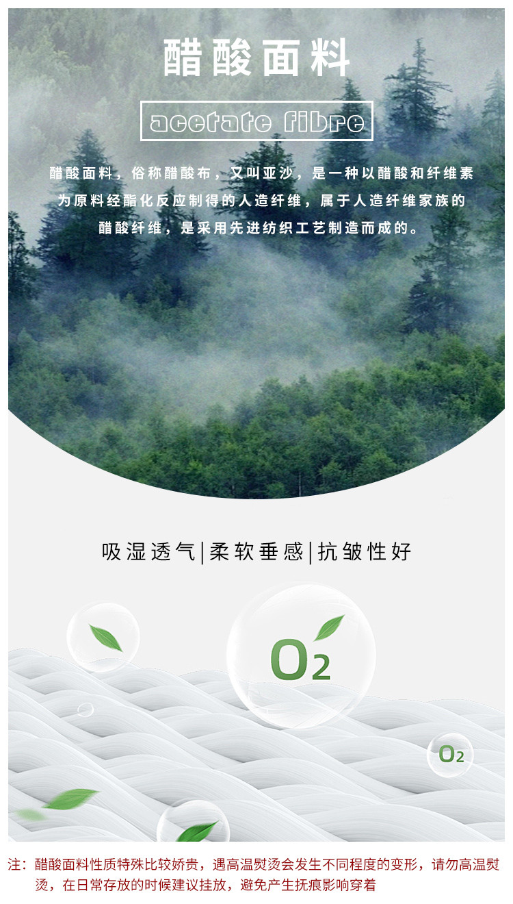 面料:52.2%聚酯纤维 37.1%棉 3.2%醋酯纤维 2.6%桑蚕丝 2.5%亚麻 2.4%氨纶