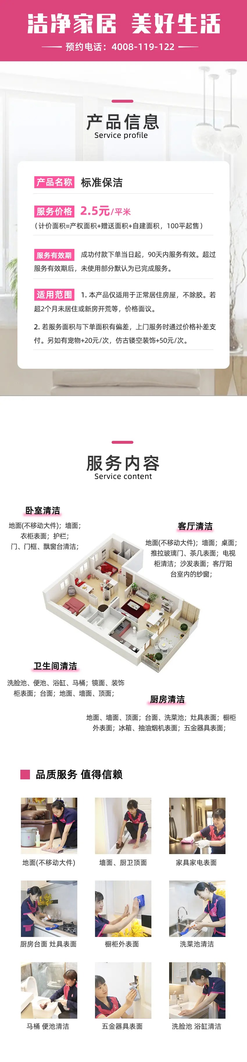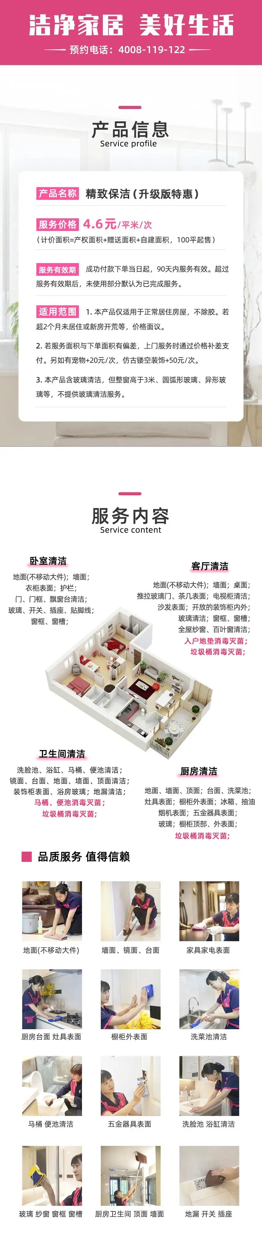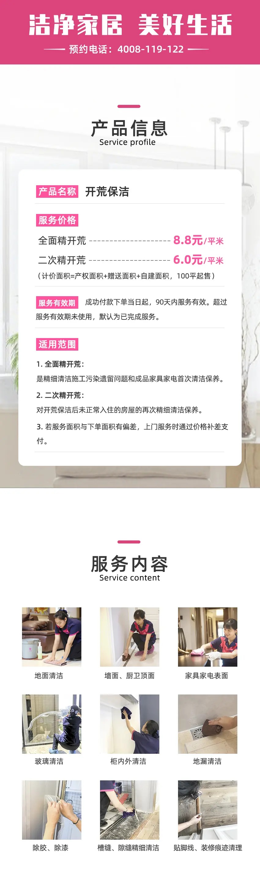 2、日常/深度保洁服务项目不含:玻璃,乳胶漆墙面,灯具,窗帘清洗,地毯清洗,沙发清洗,家电深度拆洗,古董字画,宗教陈设,渗透老垢,易损易碎物品等;