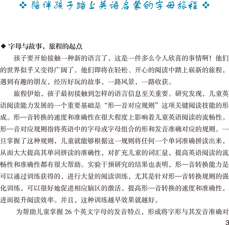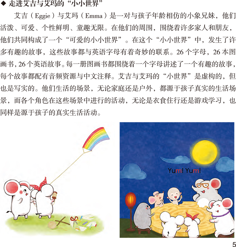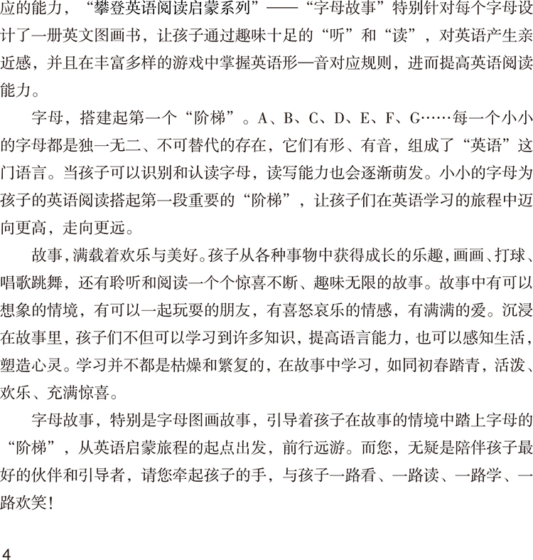 本套书是针对英语零起点的3-6岁中国儿童所研发的英语字母故事图画书,以儿童身心发展规律和英语语言学习规律为创编依据,26个字母,26个英语故事,以26册图画书呈现,并配有音频二维码。本套书画面生动精美,故事童趣十足,文字直白易懂,巧妙嵌入了大量含有“目标字母”的词语、高频词(Sight Words)和基本句型,词句具有独特节奏与韵律,朗朗上口。通过阅读这套资源,儿童逐步掌握26个字母的形音对应规则及其在词语中的发音规律,开启发展英语拼读技能和基础阅读能力的旅程。本套书的主要特色:1.内容设计与表现形式贴近3-6岁儿童生活,营造易于儿童理解和接受的轻松语境,激发儿童英语学习兴趣,培养儿童与英语的“亲近感”;2.以游戏为主要学习方式,可读可玩可唱,帮助儿童由掌握26个英文字母开始,轻松愉快地踏上英语阅读启蒙之旅;3.图画书与故事音频相呼应,提供丰富的语言刺激,搭建多通道、立体化英语学习环境,提高英语学习效率;4.导读手册包含丰富阅读活动建议,引导家长与教师更好地陪伴儿童进行英语阅读启蒙;5.渗透情感教育和人文关怀,让儿童在英语阅读中接受真善美的熏陶。