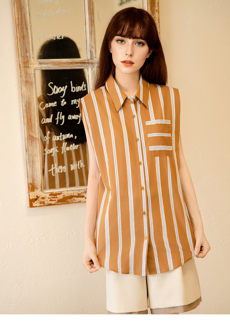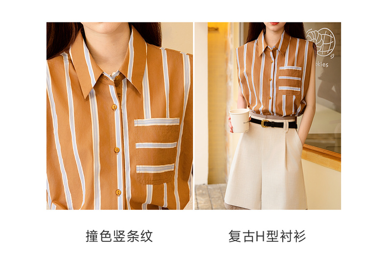 谜底条纹衬衫无袖女士2025夏新款复古文艺百搭直筒衬衣256MC6516