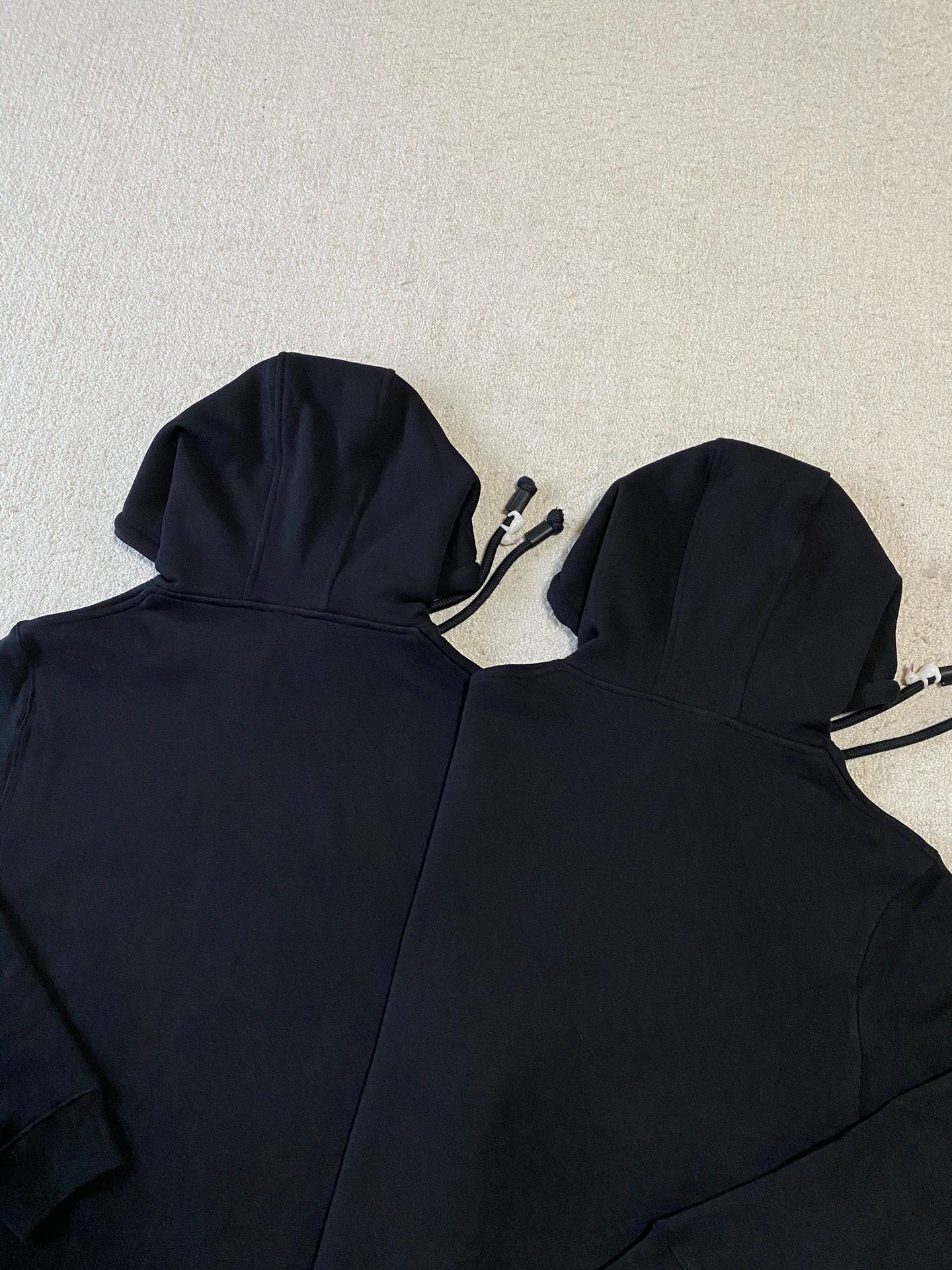 基础宽松衣型裁剪,上身宽宽松松连帽设计,多裁片拼接细节;整体不限制肩宽的同时突出轻松慵懒感。衣身下摆收腰设计与袖口罗纹收针,底摆专机精致双明线车缝。