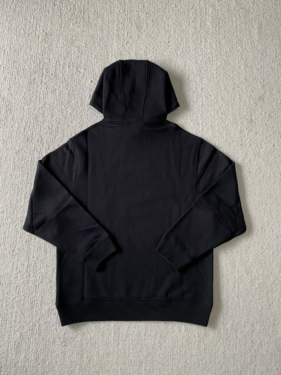 采用16S单纱+10S单纱鱼鳞定卫衣面料,380g:搭配21S 2*2螺纹,470g。鱼鳞底面料通过特定的织造工艺形成鱼鳞状底纹,对版按照经纬规律和形状进行排列交织,以确保纹理清晰、质地优良。面料经过精细的制作加工,具有良好的耐穿性、轻薄柔软、透气性好。