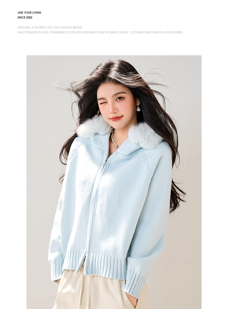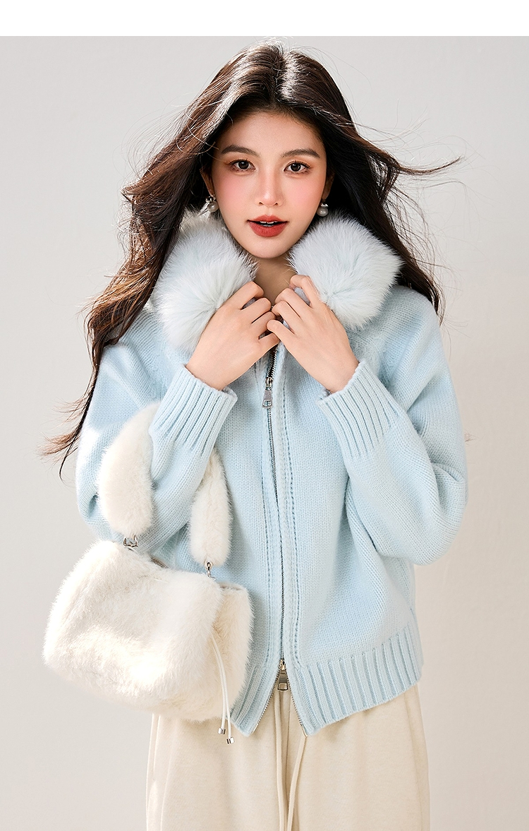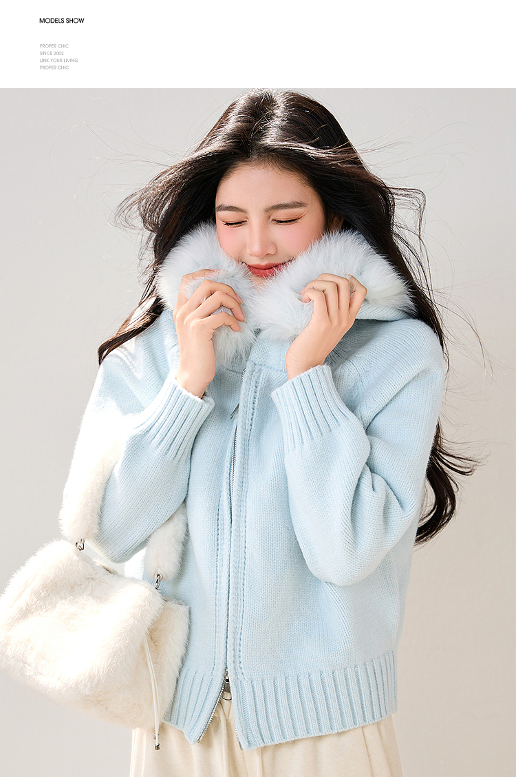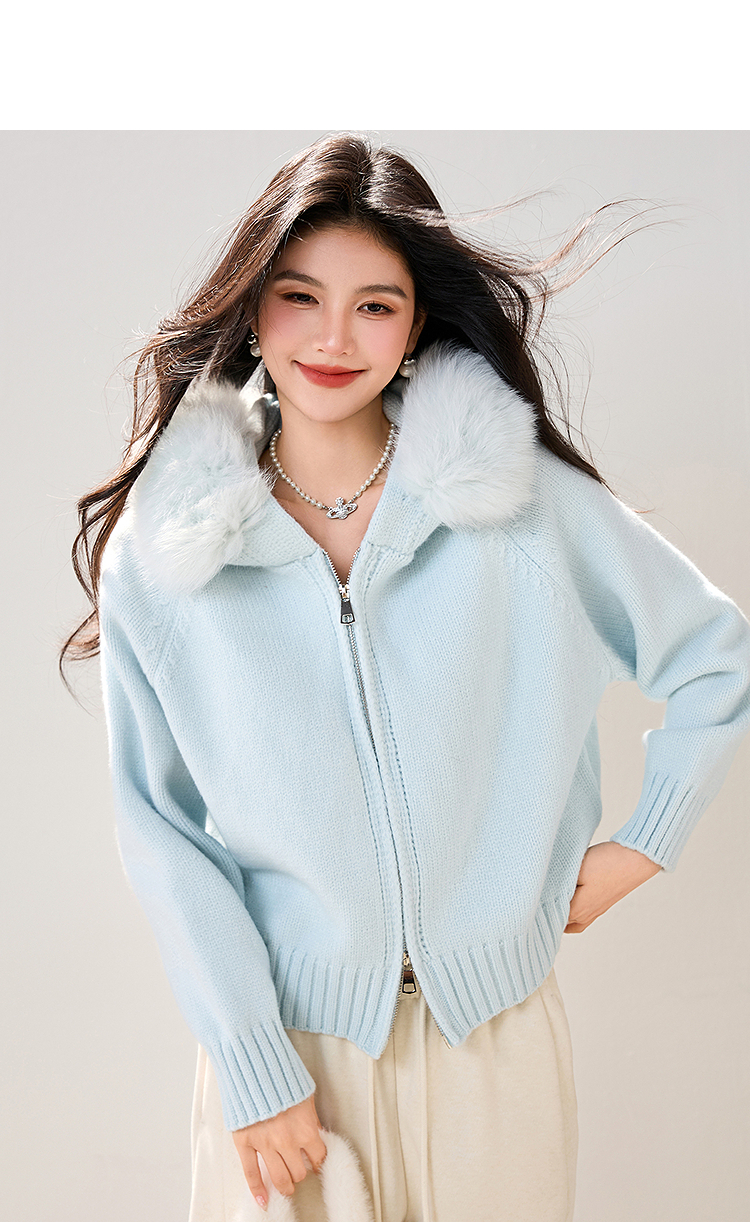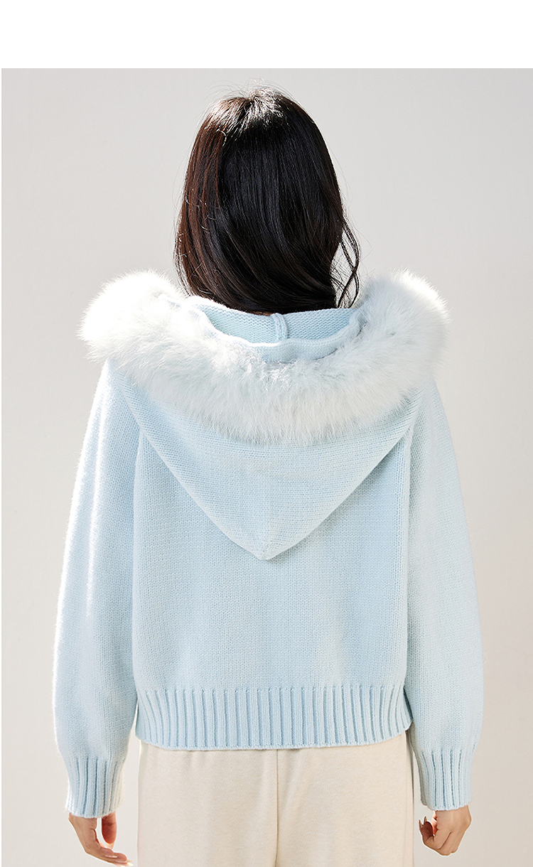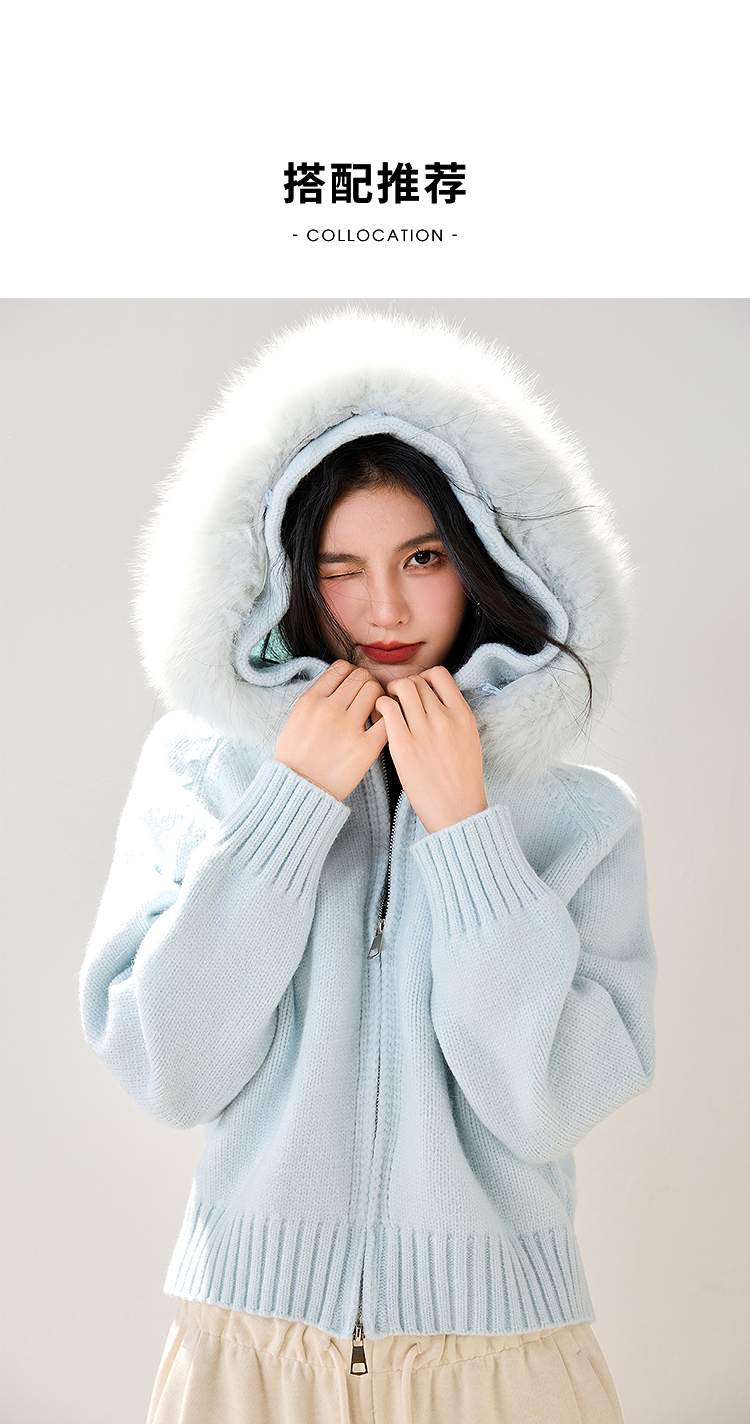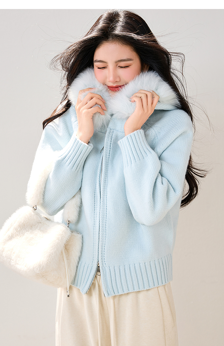 西遇双拉链毛领连帽毛衣外套女冬季新款蓝色短款软糯针织衫SS051861
