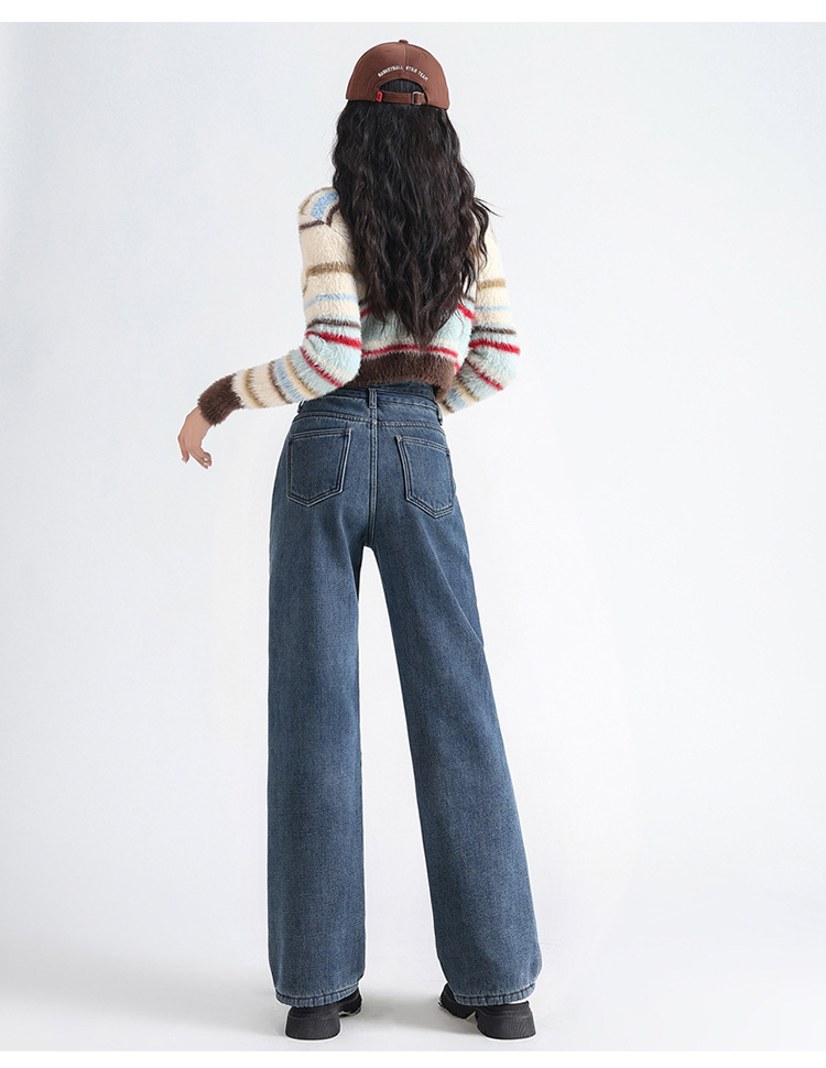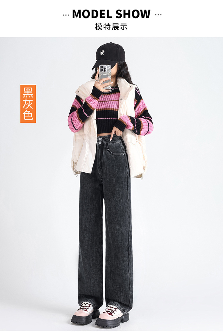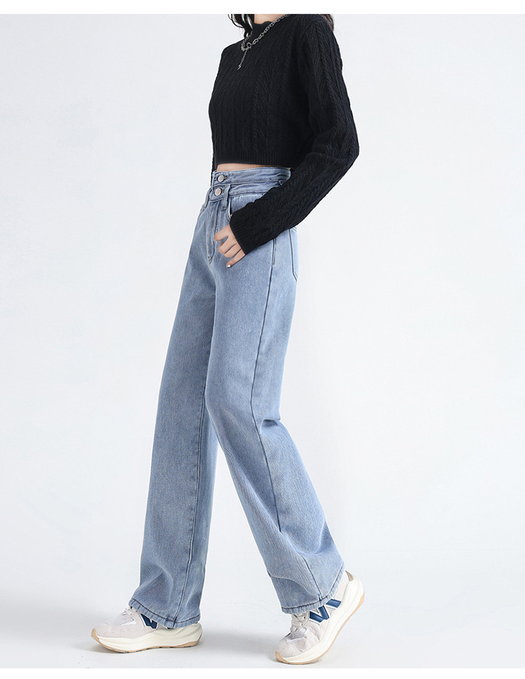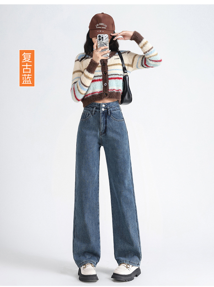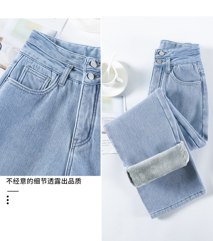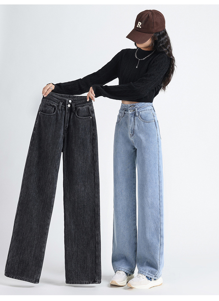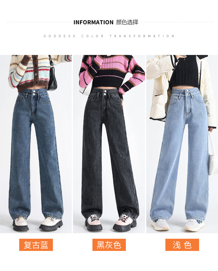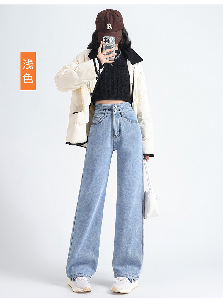 「三色可选!加不加绒两款」双排扣牛仔阔腿裤 加绒牛仔裤女秋冬新款韩版高腰厚款宽松小个子直筒裤下装