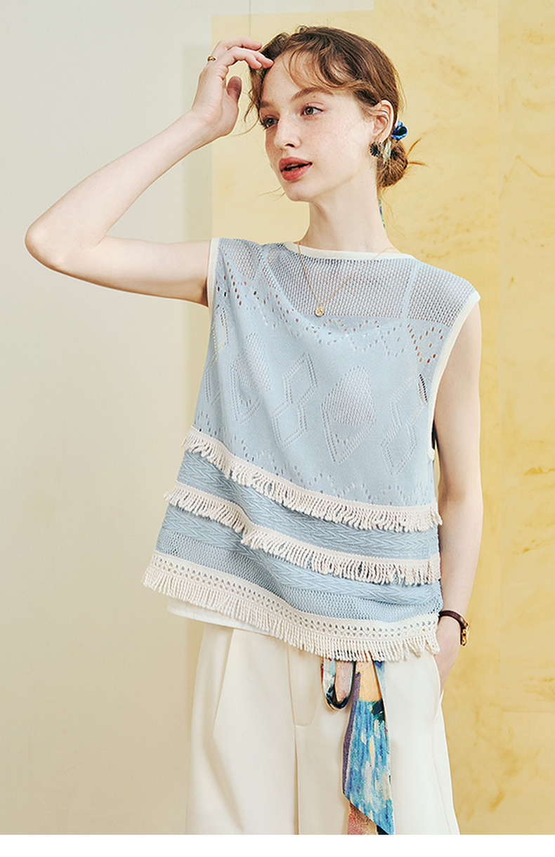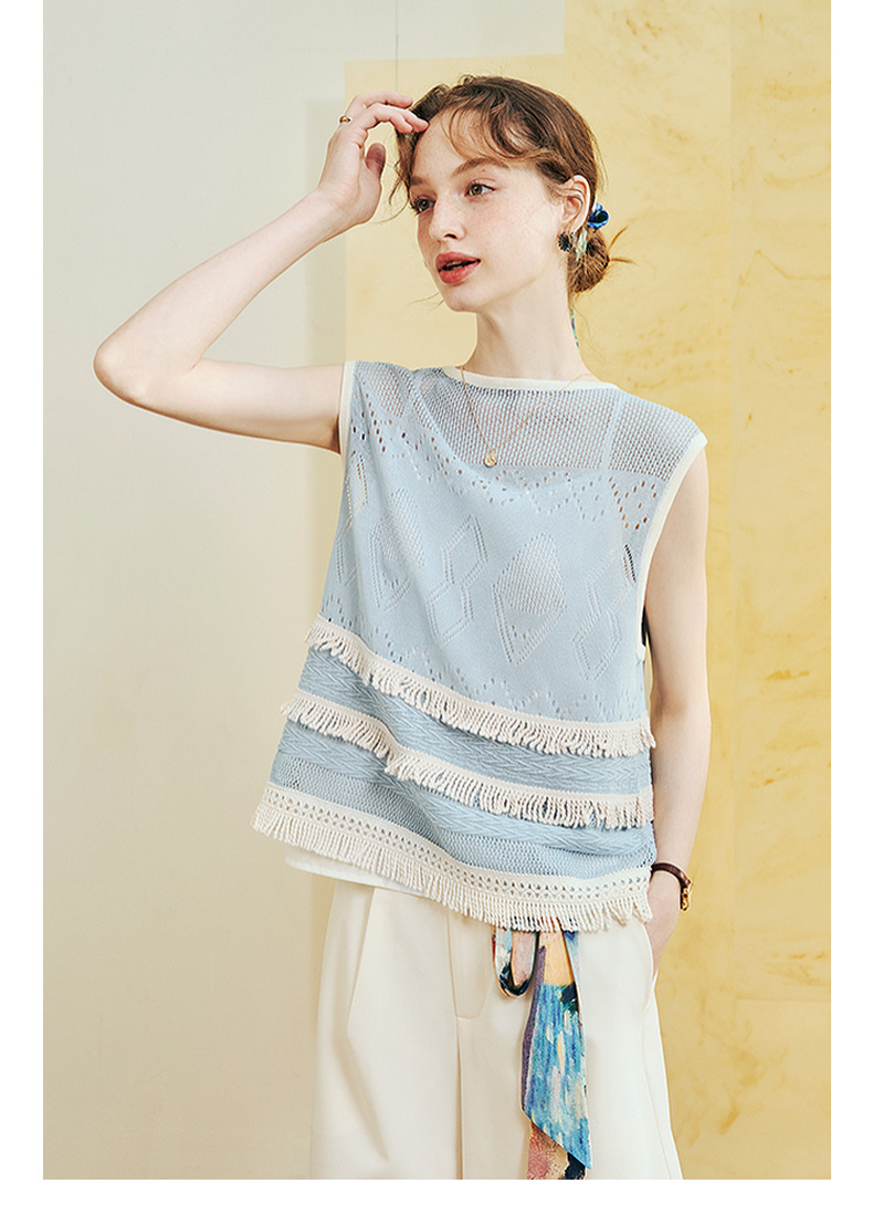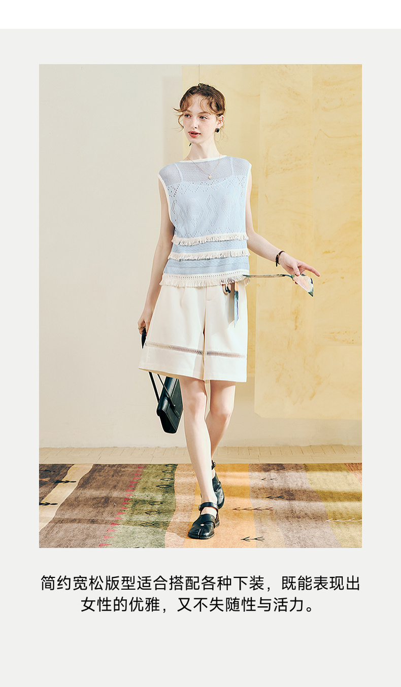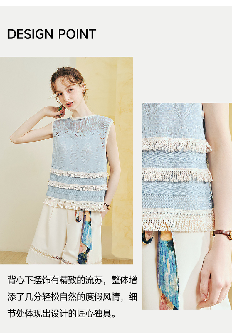 两三事 飘零过海 2025夏季新款时尚流苏装饰镂空无袖针织衫女宽松