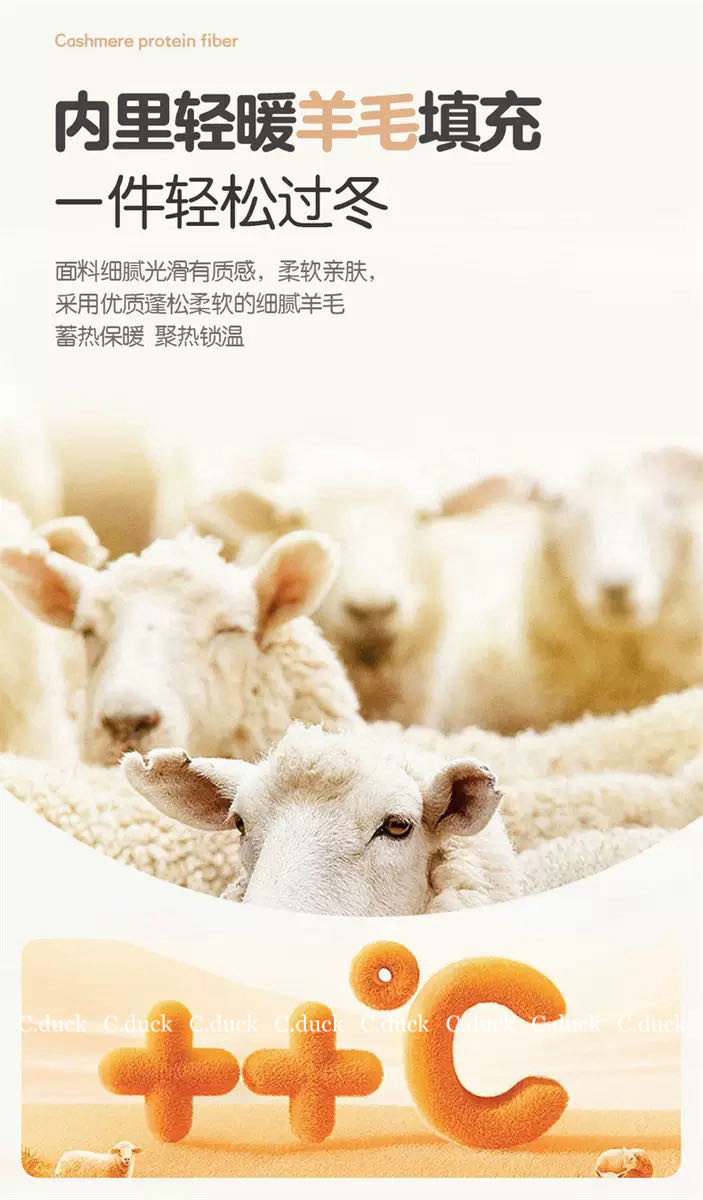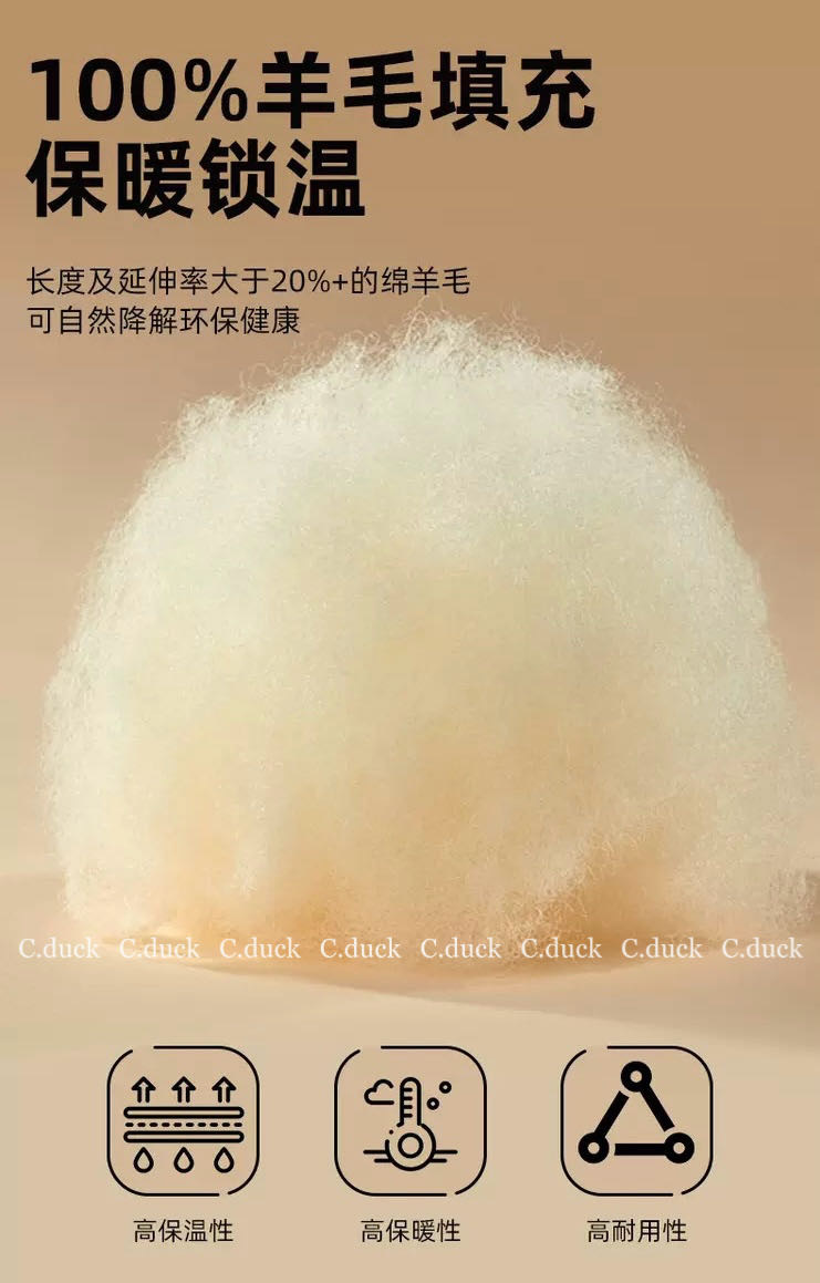 内里填充100%羊毛,上身超暖和! 🔥上身速热!暖的很快!喜欢的放心来! 面料细腻光滑有质感,柔软亲肤 采用优质蓬松柔软的细腻羊毛 蓄热保暖 聚热锁温